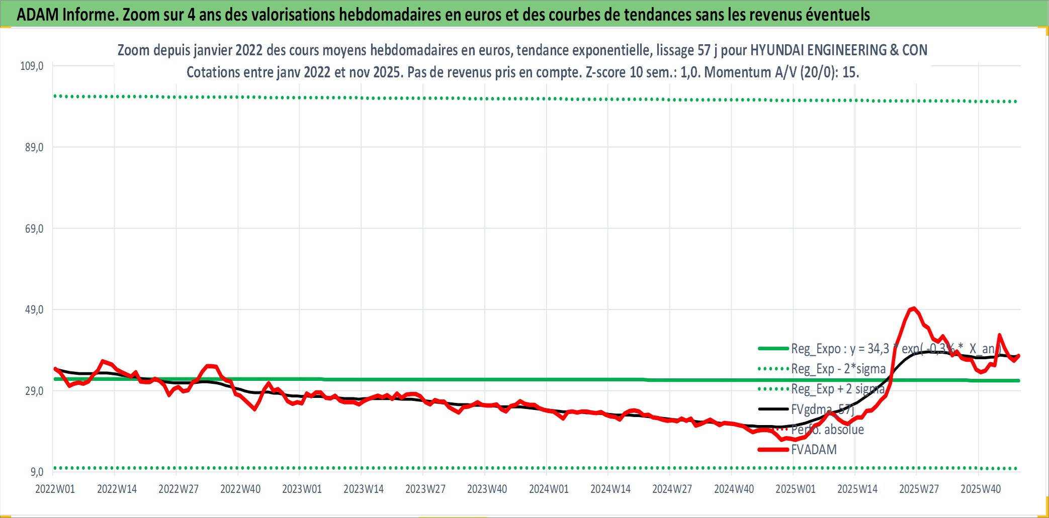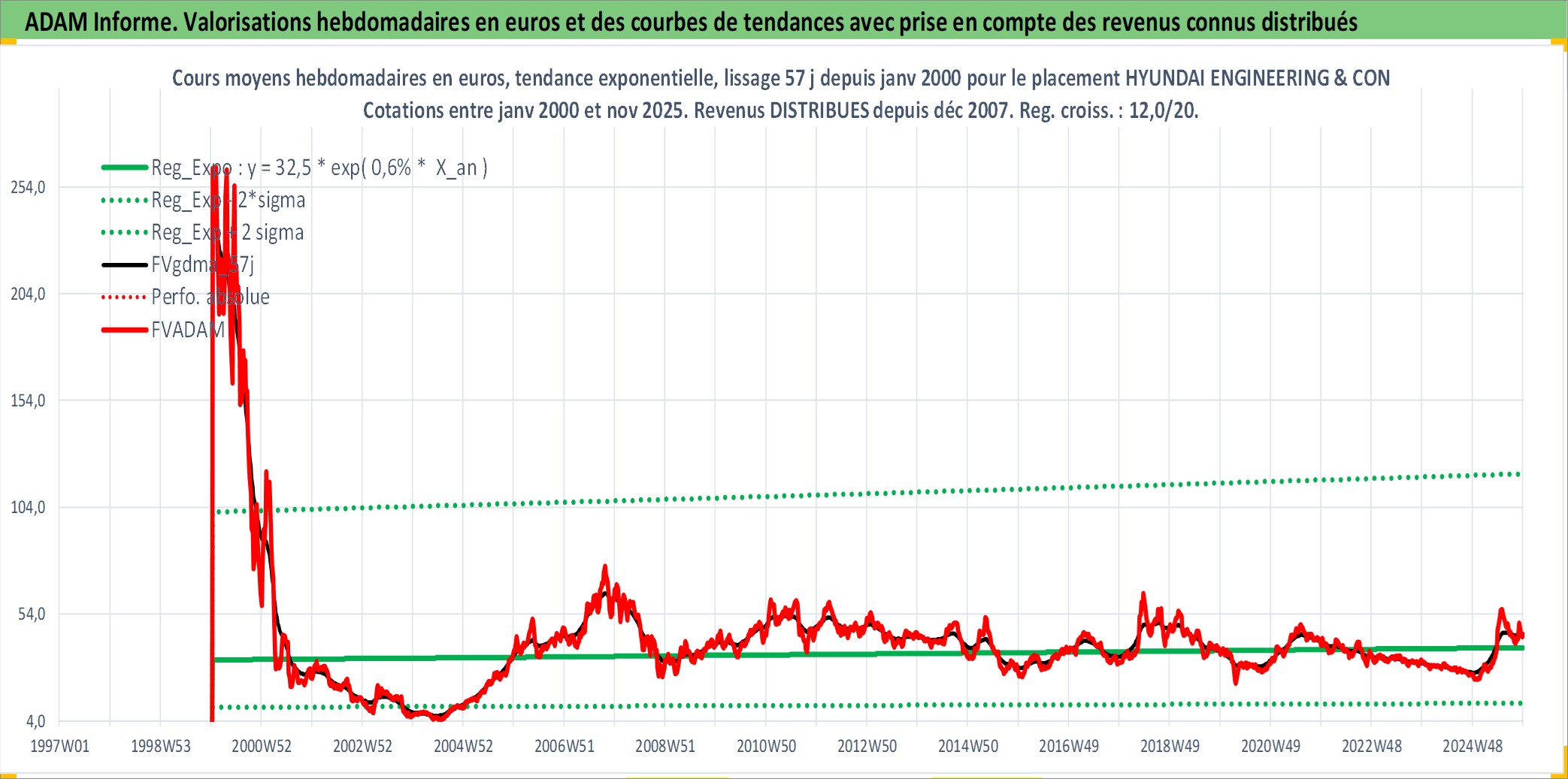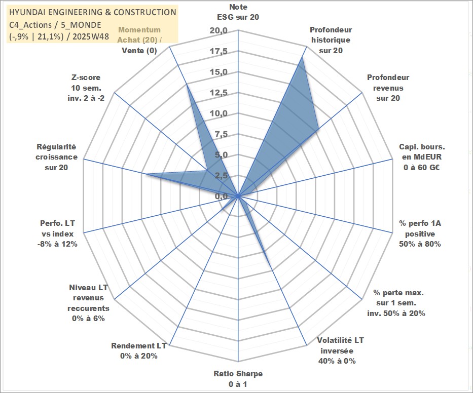 Site dédié aux investisseursPage dédiée sur site financeAnalyse des valorisations hebdomadaires de l'action HYUNDAI ENGINEERING & CONSTRUCTION. Cet actif est cote en KRW. Les valorisations sont en contrevaleur EURO et couvrent les semaines 2000W02 a 2025W48. Les revenus de cet actif financier sont pris en compte depuis la semaine 2007W52. La note ESG de cet actif n'est pas connue.