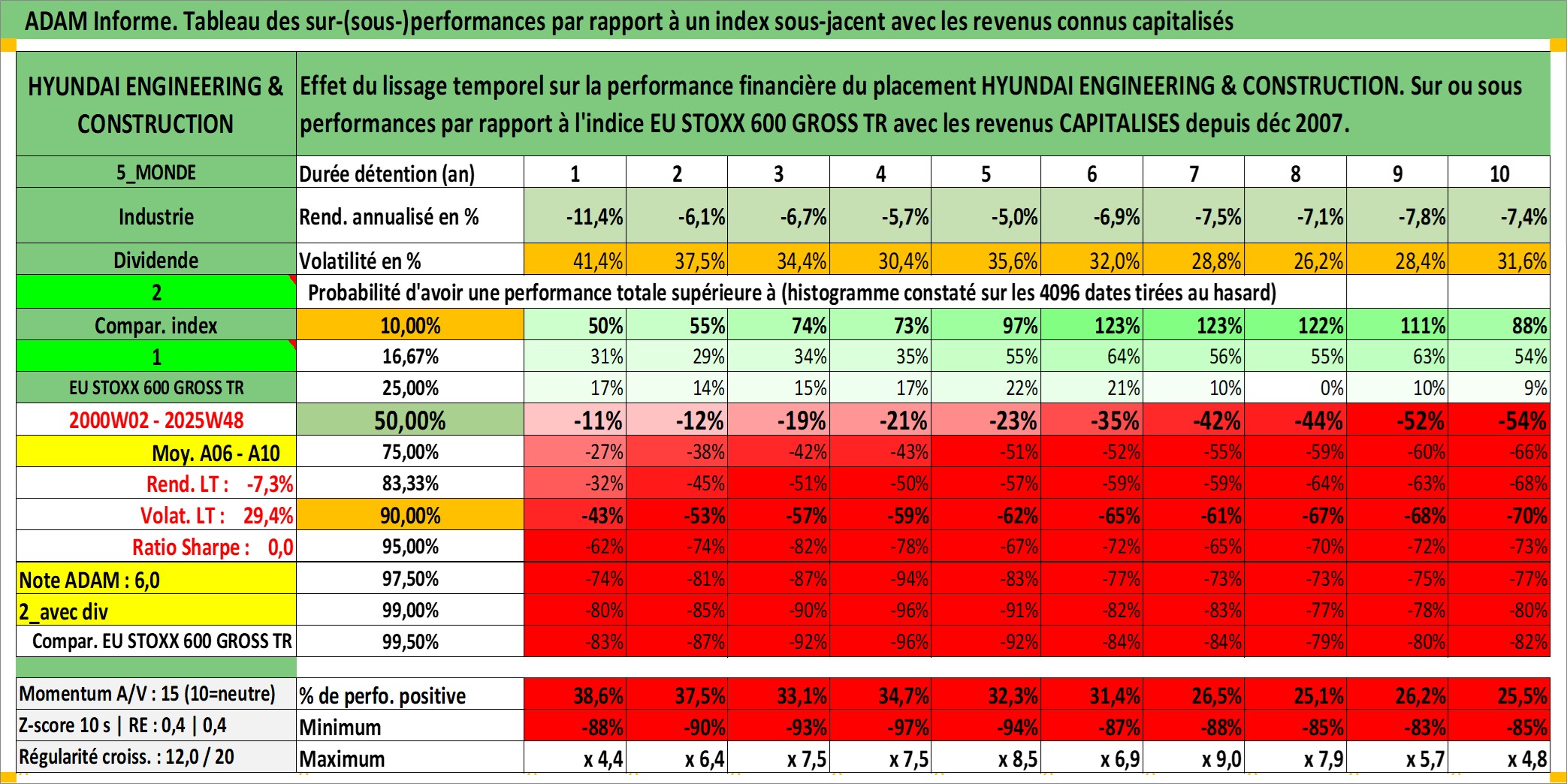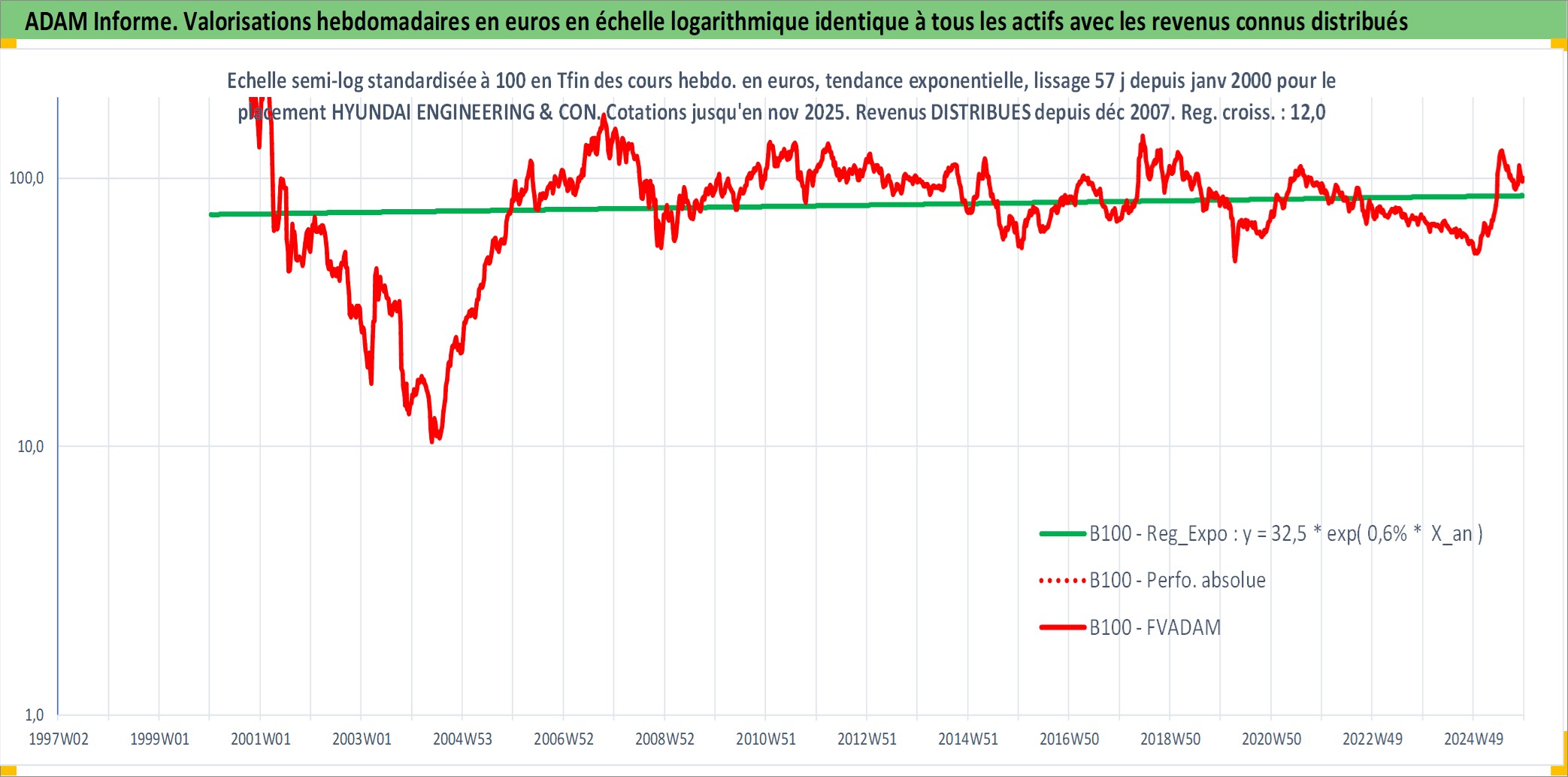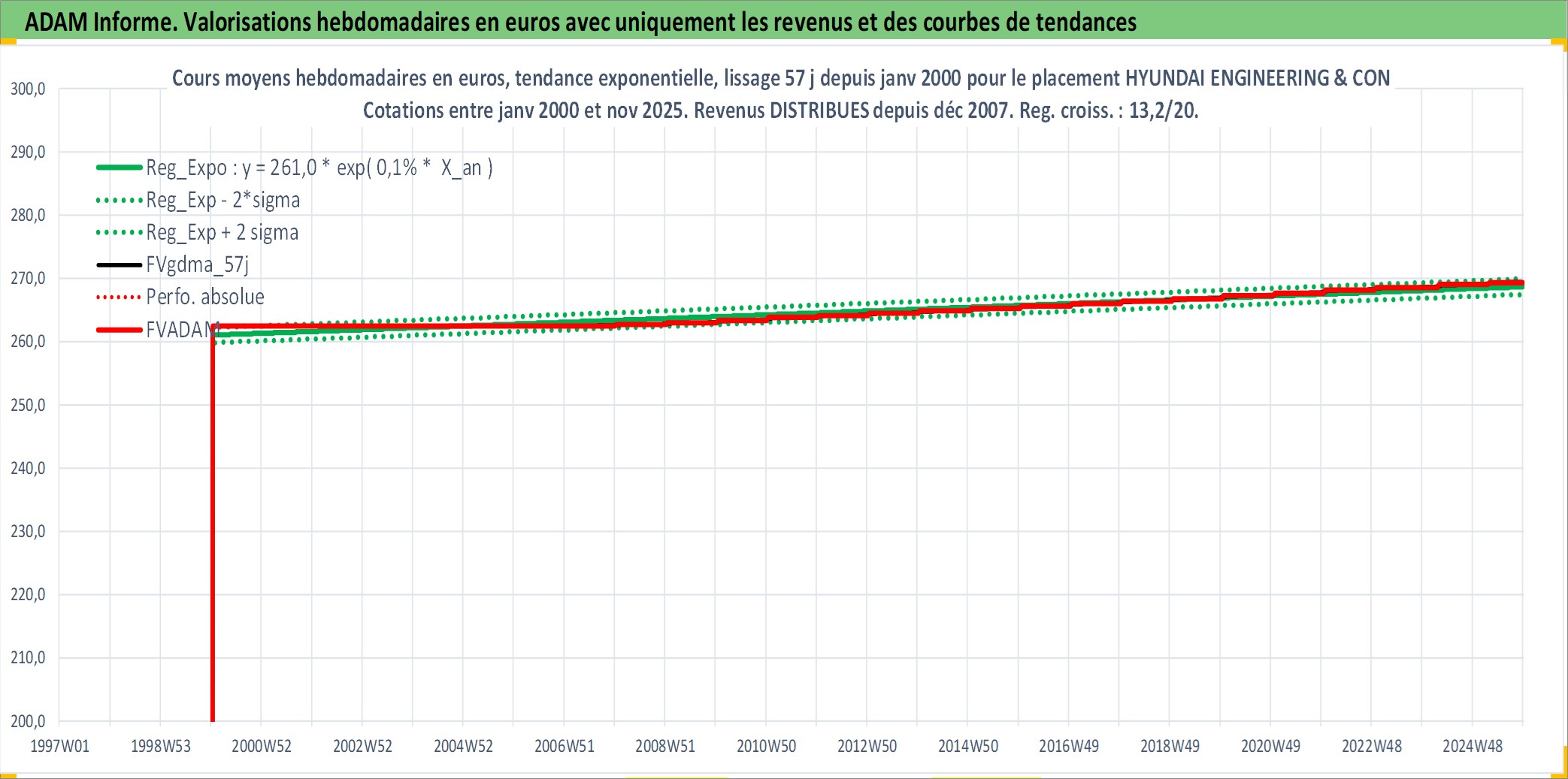 Site dédié aux investisseursPage dédiée sur site financeAnalyse des valorisations hebdomadaires de l'action HYUNDAI ENGINEERING & CONSTRUCTION. Cet actif est cote en KRW. Les valorisations sont en contrevaleur EURO et couvrent les semaines 2000W02 a 2025W48. Les revenus de cet actif financier sont pris en compte depuis la semaine 2007W52. La note ESG de cet actif n'est pas connue.