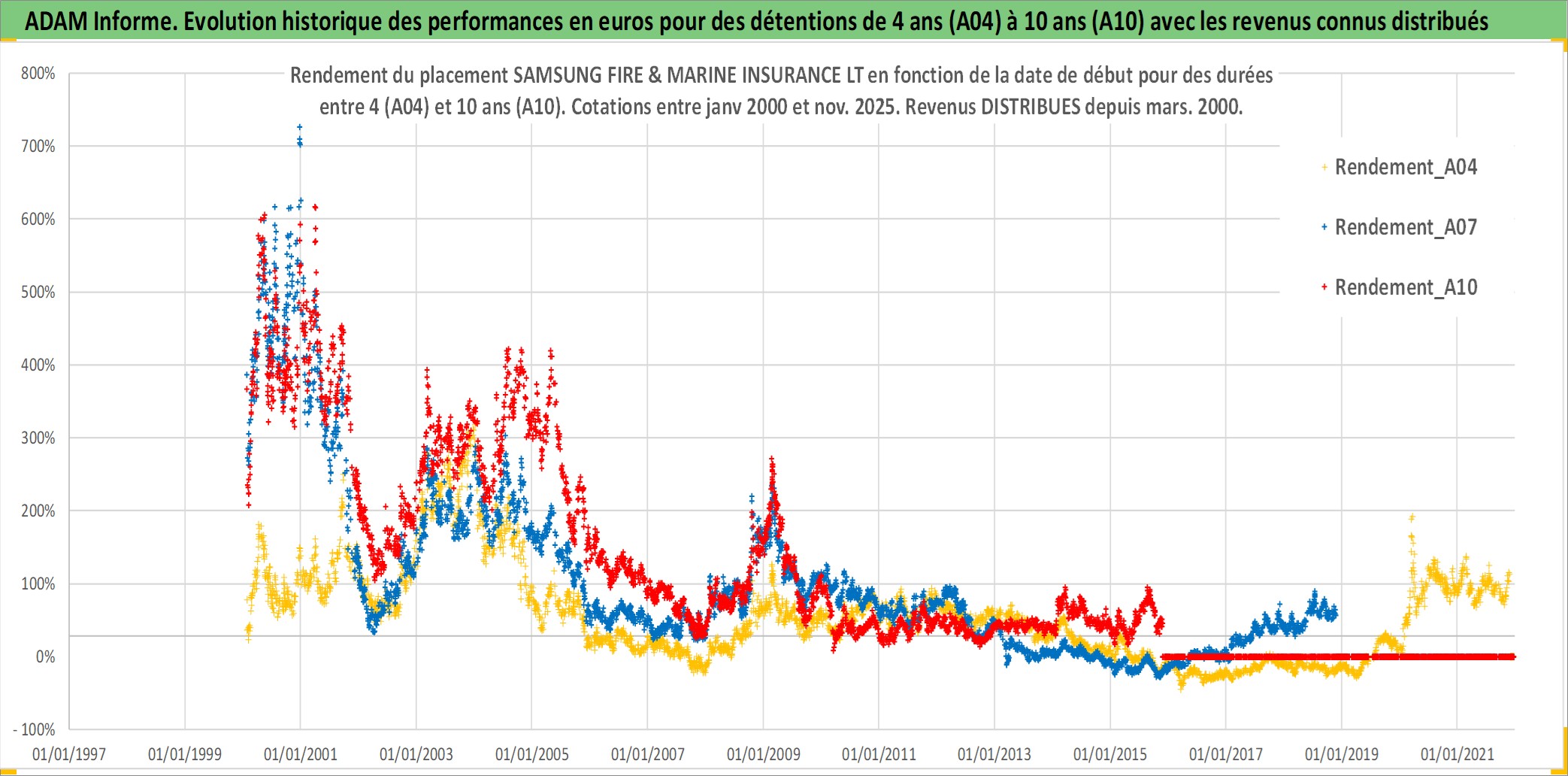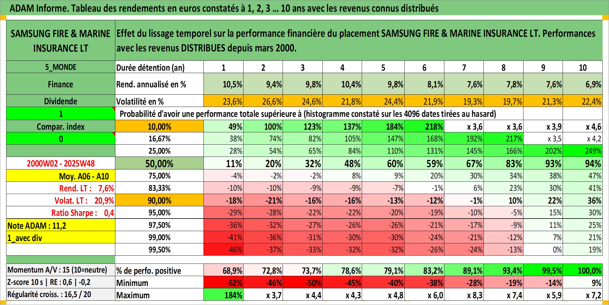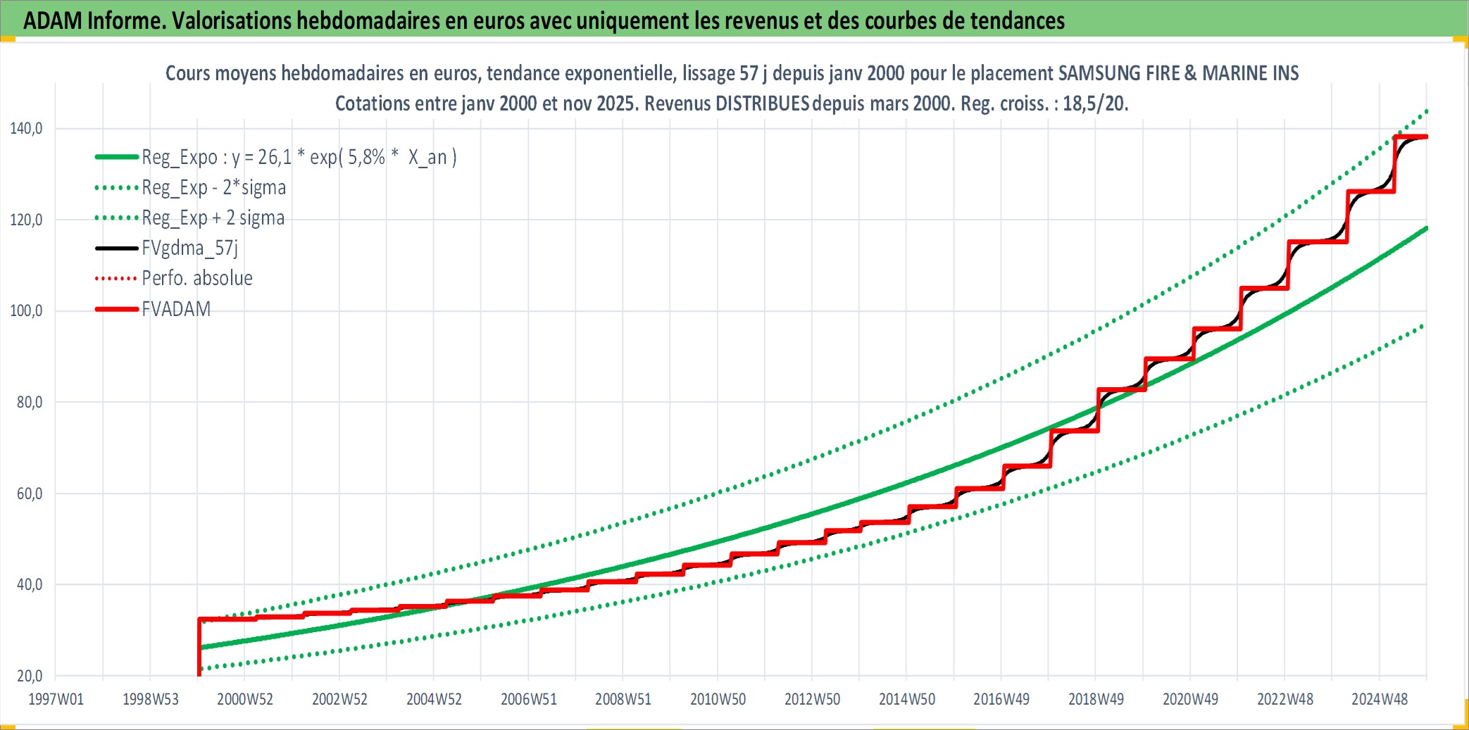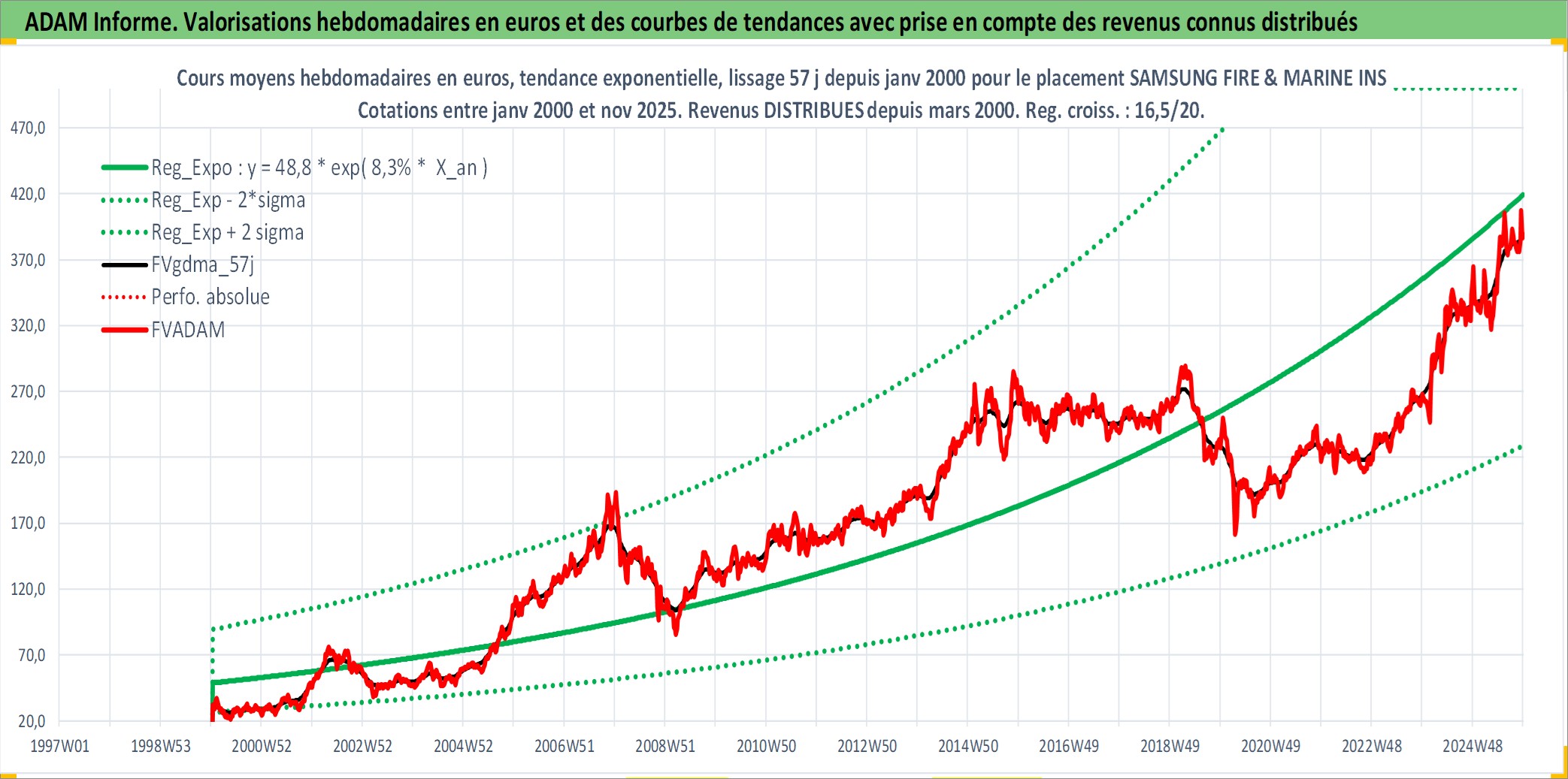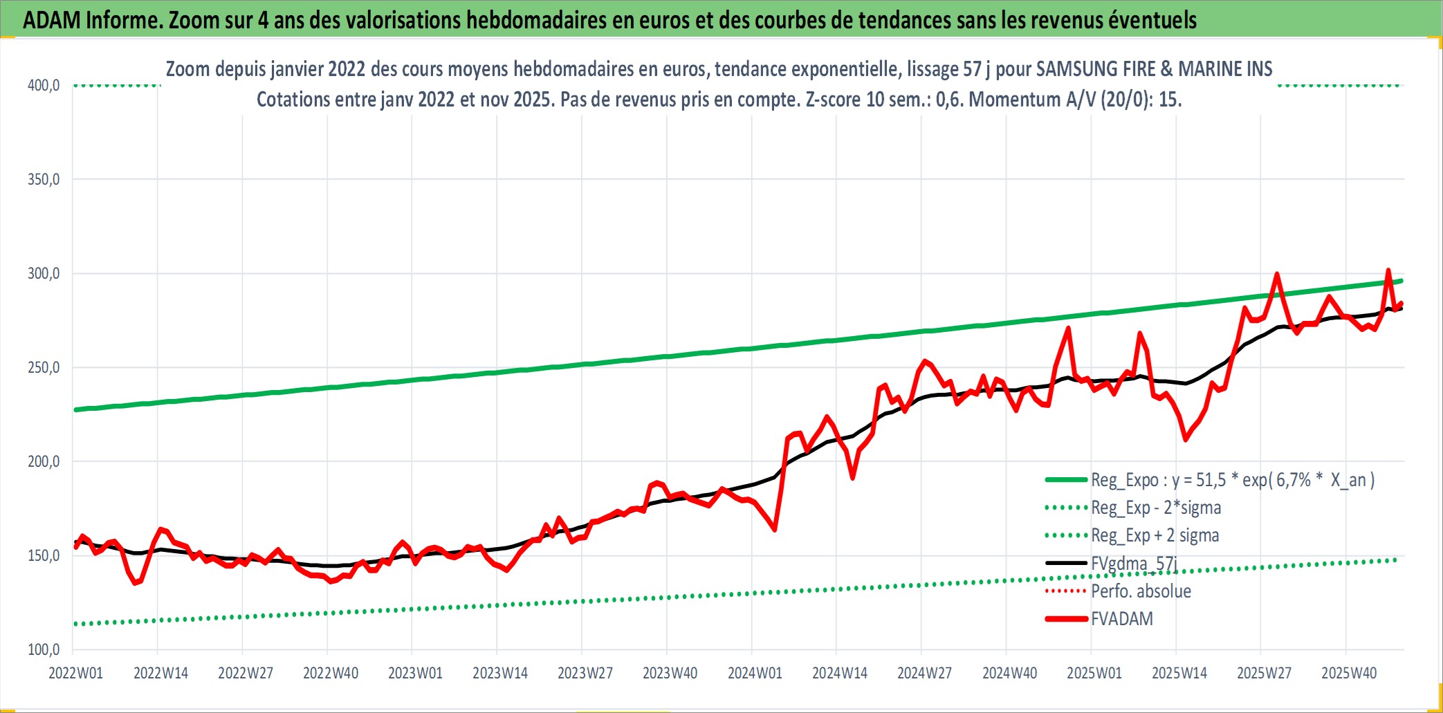 Site dédié aux investisseursPage dédiée sur site financeAnalyse des valorisations hebdomadaires de l'action SAMSUNG FIRE & MARINE INSURANCE LT. Cet actif est cote en KRW. Les valorisations sont en contrevaleur EURO et couvrent les semaines 2000W02 a 2025W48. Les revenus de cet actif financier sont pris en compte depuis la semaine 2000W13. La note globale ESG de cet actif est estimee a 10.0 (apres rebasage entre 0 et 20).