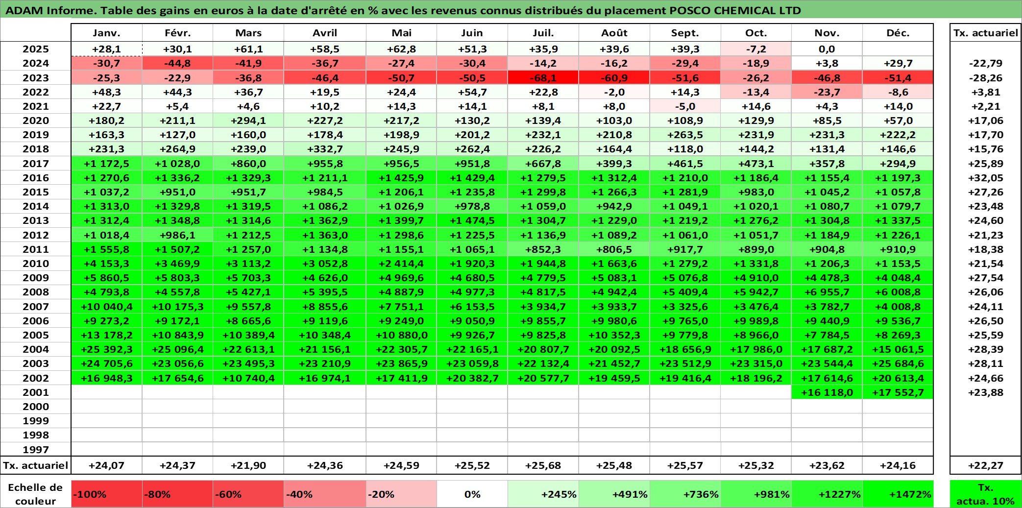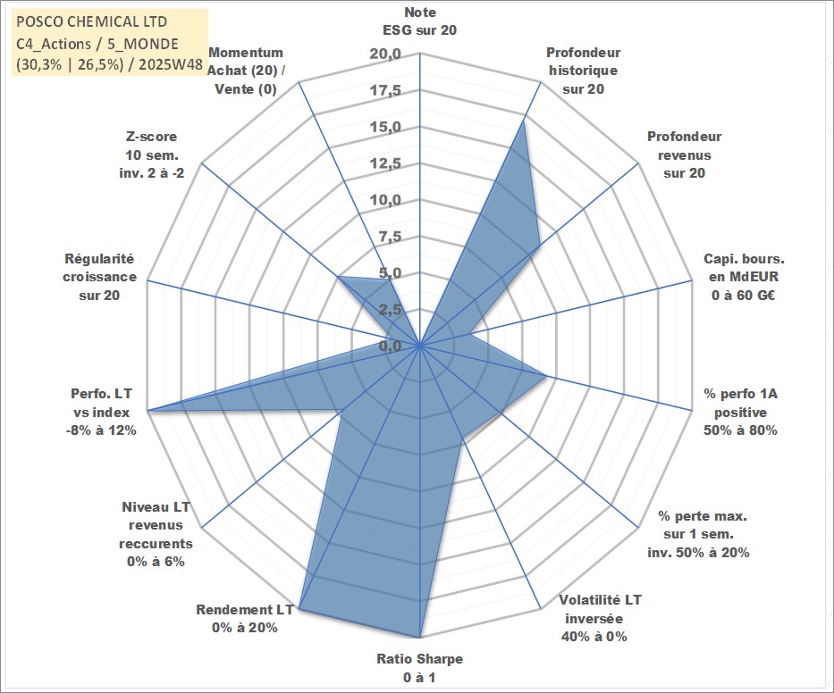 Site dédié aux investisseursPage dédiée sur site financeAnalyse des valorisations hebdomadaires de l'action POSCO CHEMICAL LTD. Cet actif est cote en KRW. Les valorisations sont en contrevaleur EURO et couvrent les semaines 2001W45 a 2025W48. Les revenus de cet actif financier sont pris en compte depuis la semaine 2010W52. La note ESG de cet actif n'est pas connue.