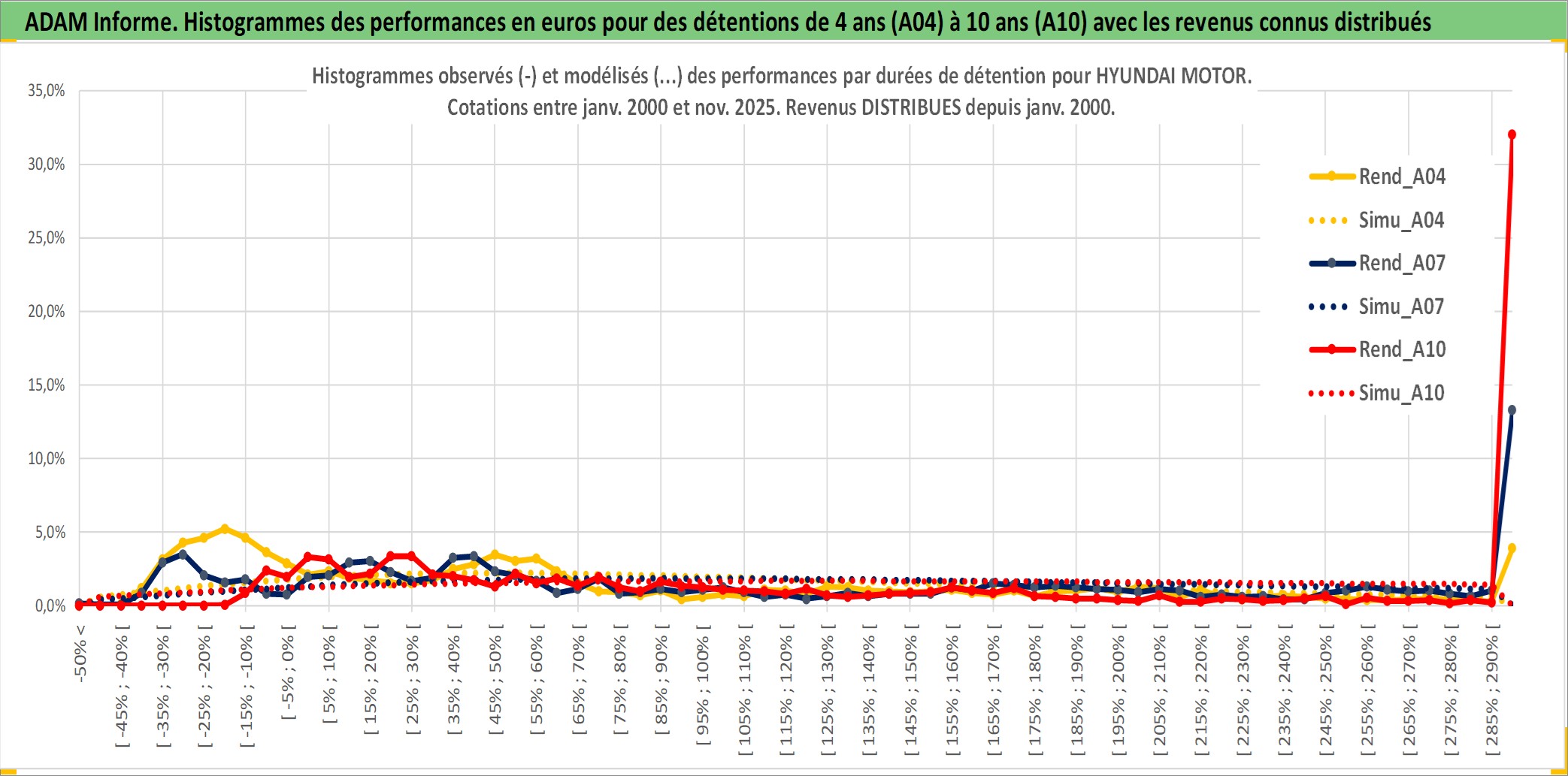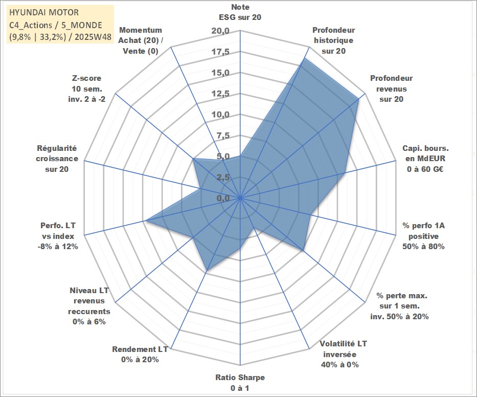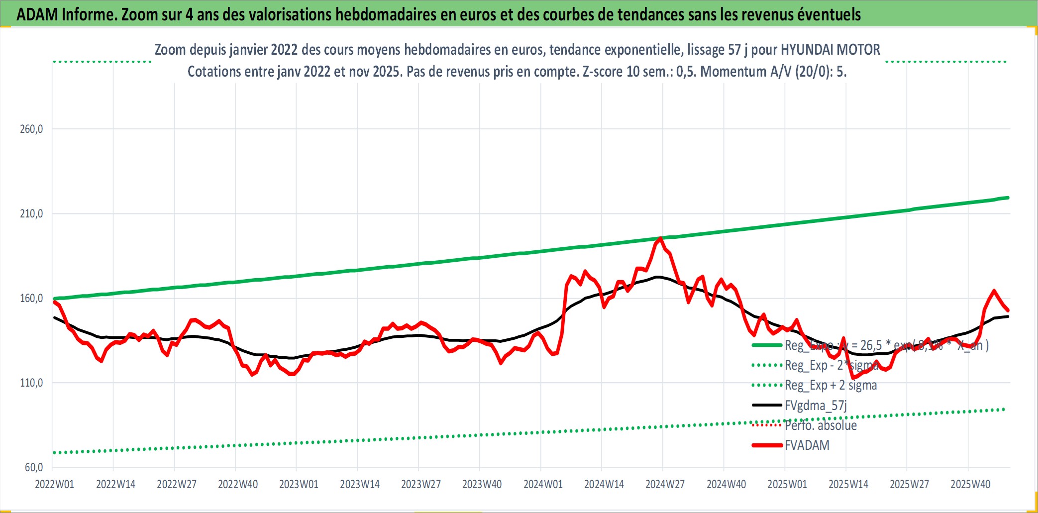 Site dédié aux investisseursPage dédiée sur site financeAnalyse des valorisations hebdomadaires de l'action HYUNDAI MOTOR. Cet actif est cote en KRW. Les valorisations sont en contrevaleur EURO et couvrent les semaines 2000W02 a 2025W48. Les revenus de cet actif financier sont pris en compte depuis la semaine 2000W01. La note globale ESG de cet actif est estimee a 5.0 (apres rebasage entre 0 et 20).