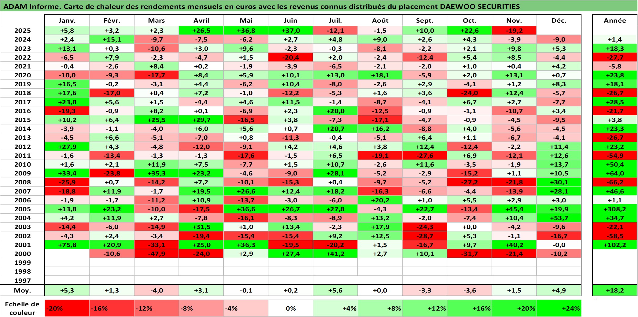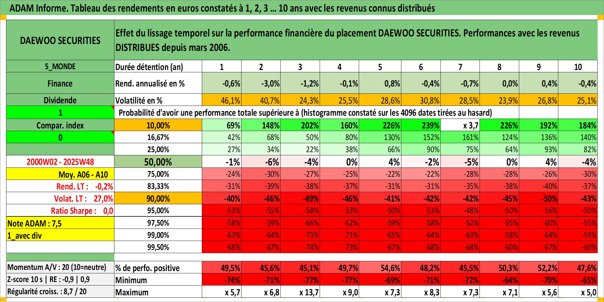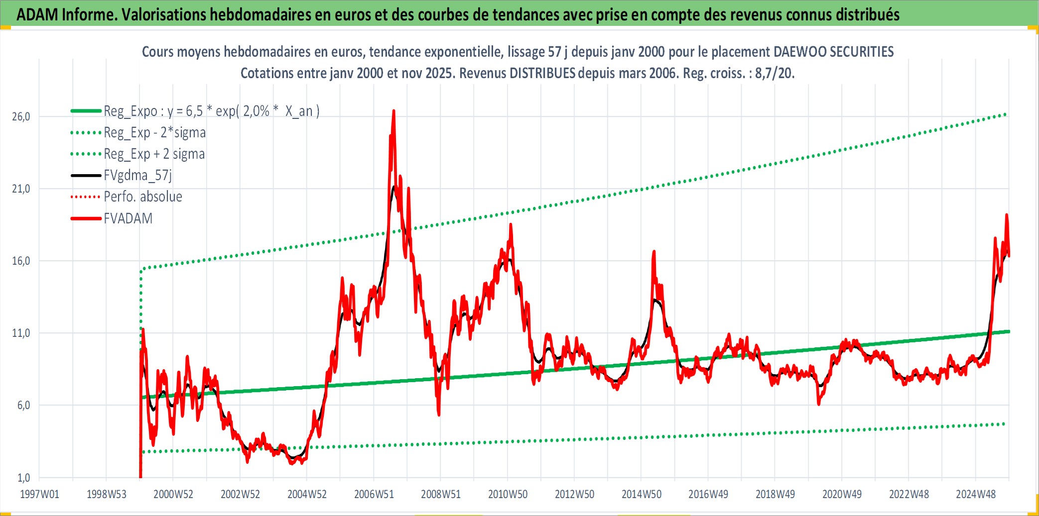 Site dédié aux investisseursPage dédiée sur site financeAnalyse des valorisations hebdomadaires de l'action DAEWOO SECURITIES. Cet actif est cote en KRW. Les valorisations sont en contrevaleur EURO et couvrent les semaines 2000W02 a 2025W48. Les revenus de cet actif financier sont pris en compte depuis la semaine 2006W13. La note globale ESG de cet actif est estimee a 8.0 (apres rebasage entre 0 et 20).