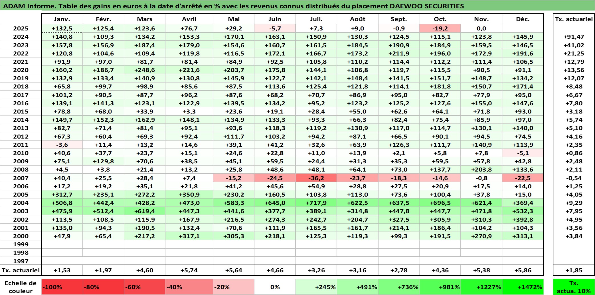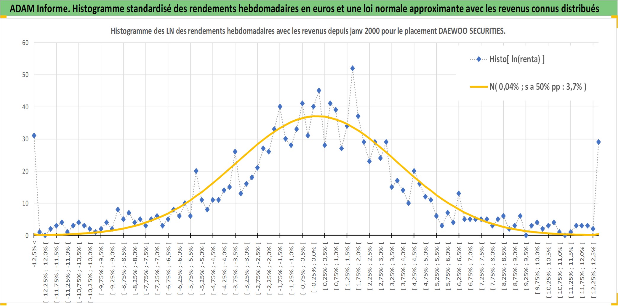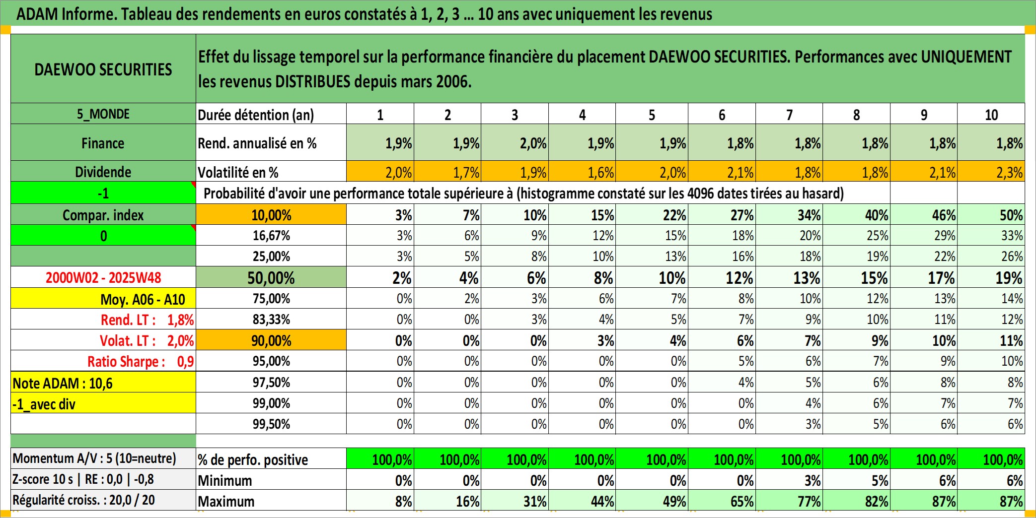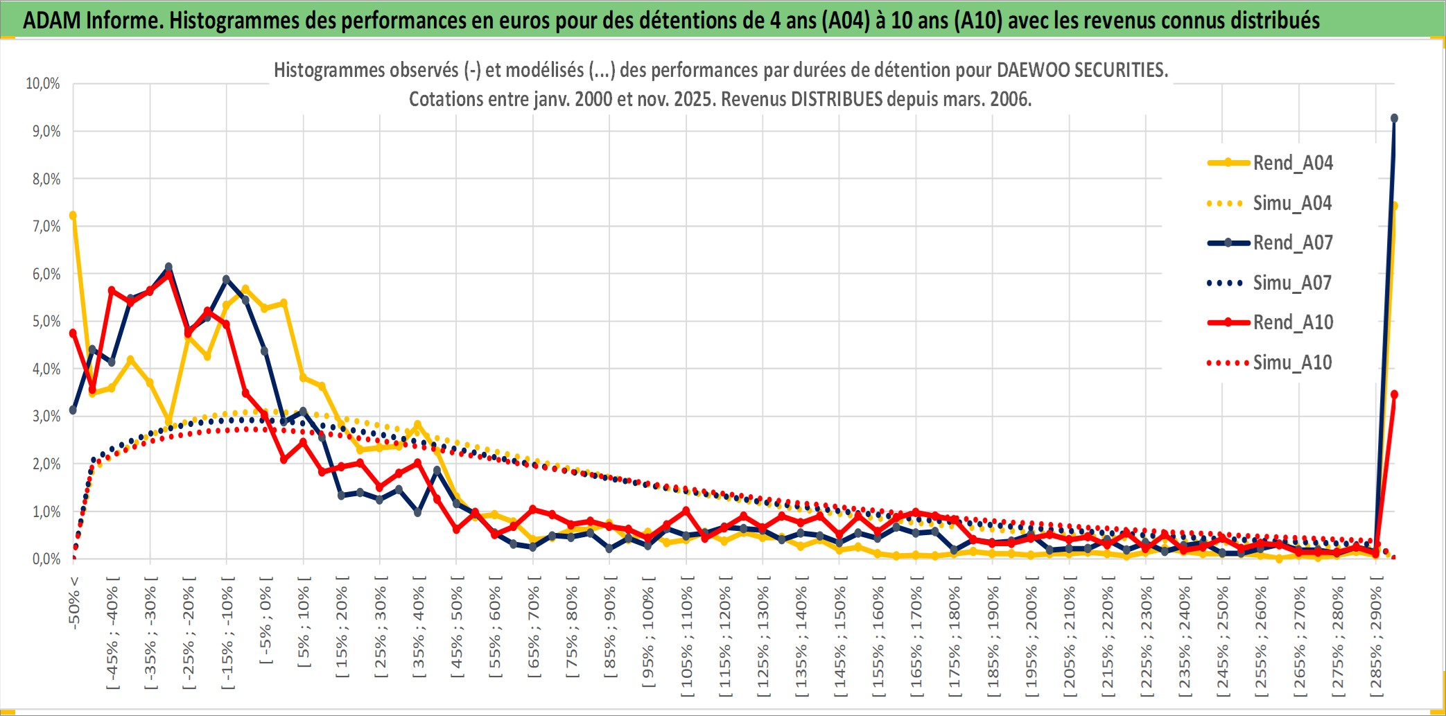 Site dédié aux investisseursPage dédiée sur site financeAnalyse des valorisations hebdomadaires de l'action DAEWOO SECURITIES. Cet actif est cote en KRW. Les valorisations sont en contrevaleur EURO et couvrent les semaines 2000W02 a 2025W48. Les revenus de cet actif financier sont pris en compte depuis la semaine 2006W13. La note globale ESG de cet actif est estimee a 8.0 (apres rebasage entre 0 et 20).