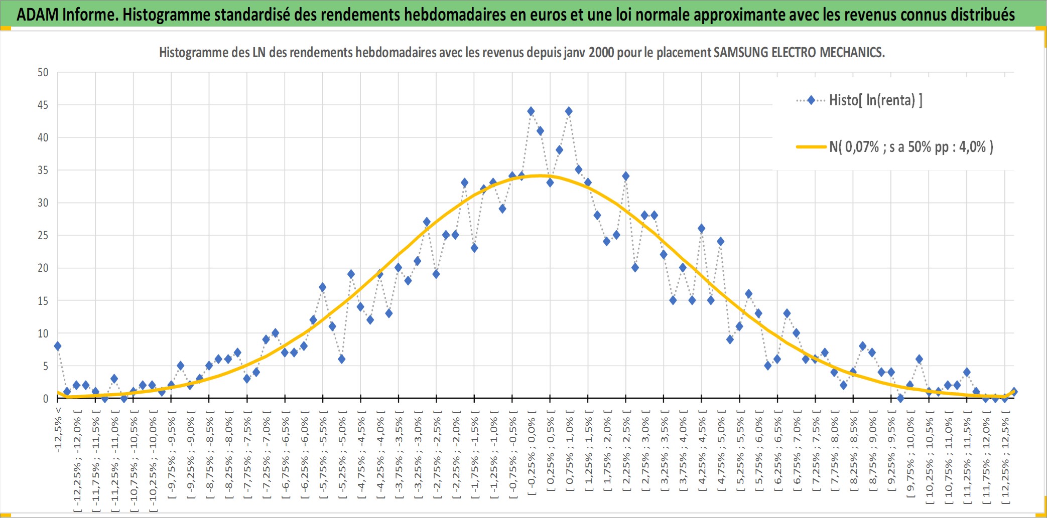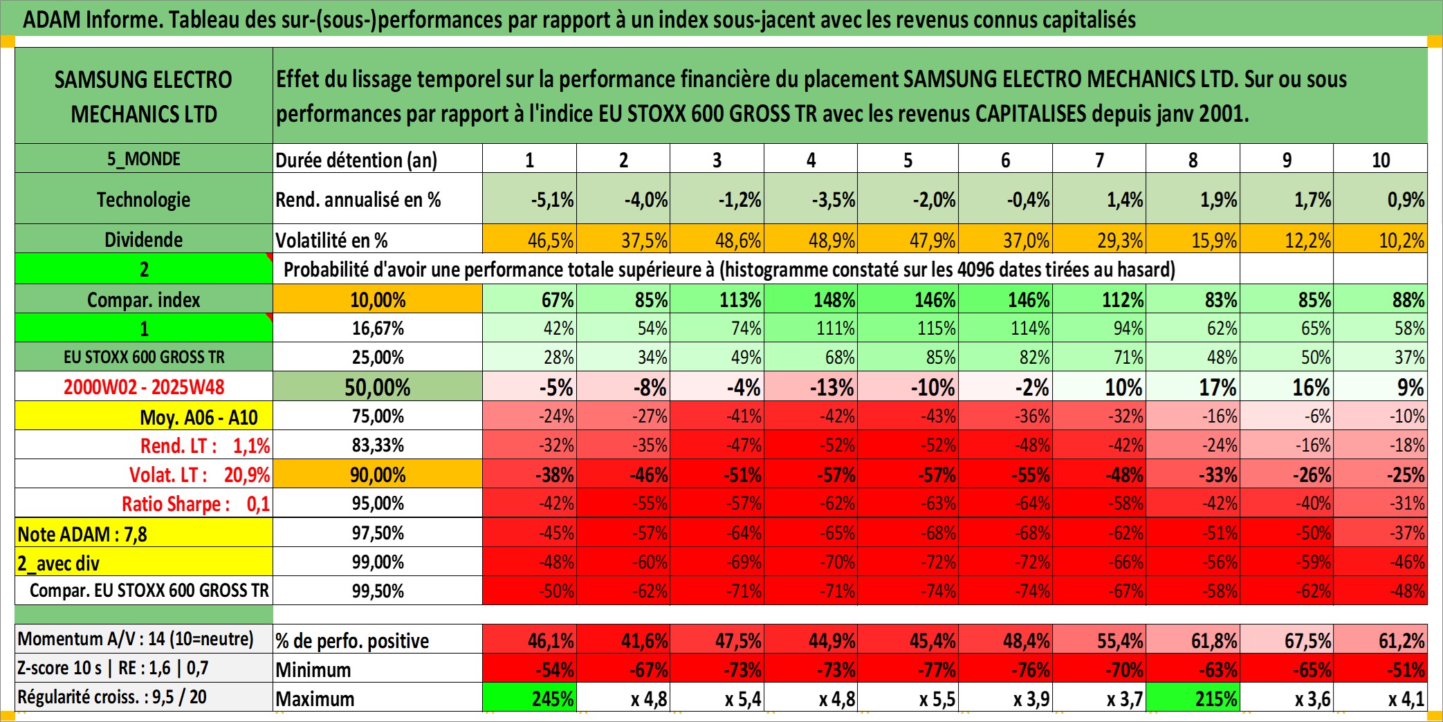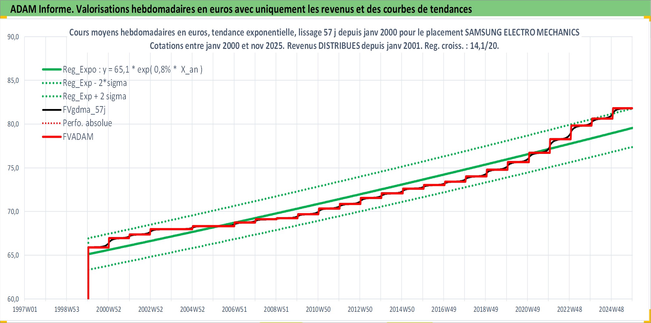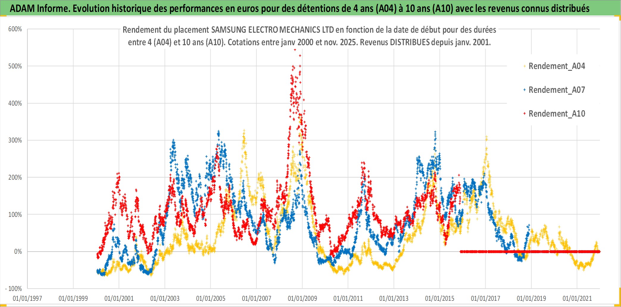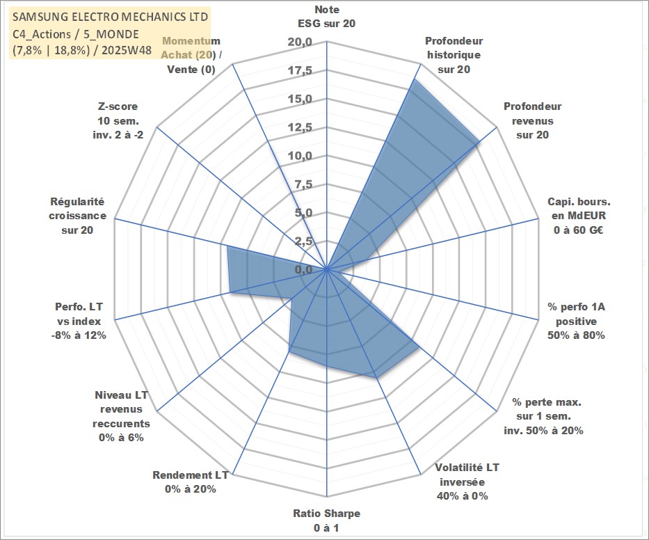 Site dédié aux investisseursPage dédiée sur site financeAnalyse des valorisations hebdomadaires de l'action SAMSUNG ELECTRO MECHANICS LTD. Cet actif est cote en KRW. Les valorisations sont en contrevaleur EURO et couvrent les semaines 2000W02 a 2025W48. Les revenus de cet actif financier sont pris en compte depuis la semaine 2001W01. La note ESG de cet actif n'est pas connue.