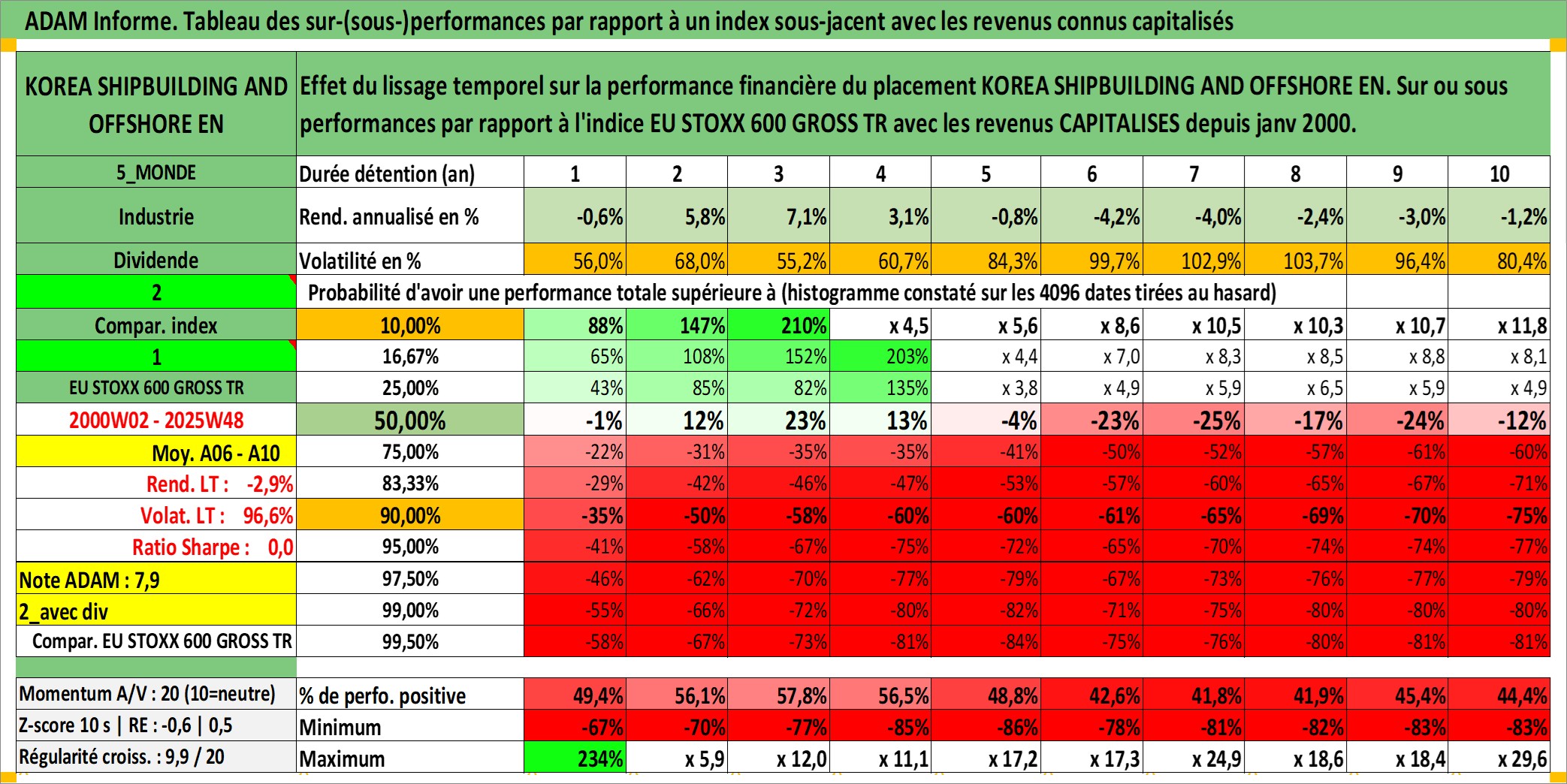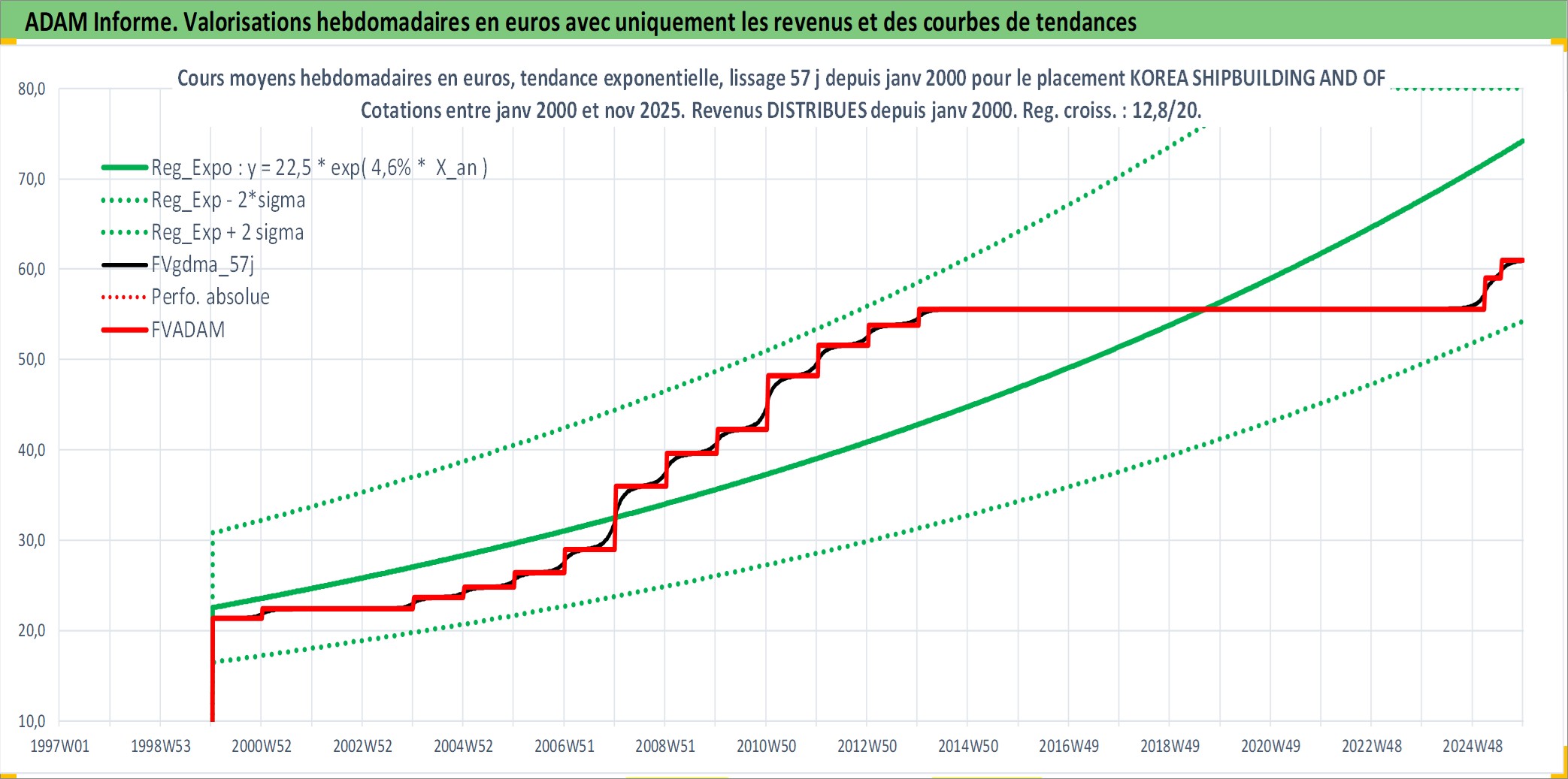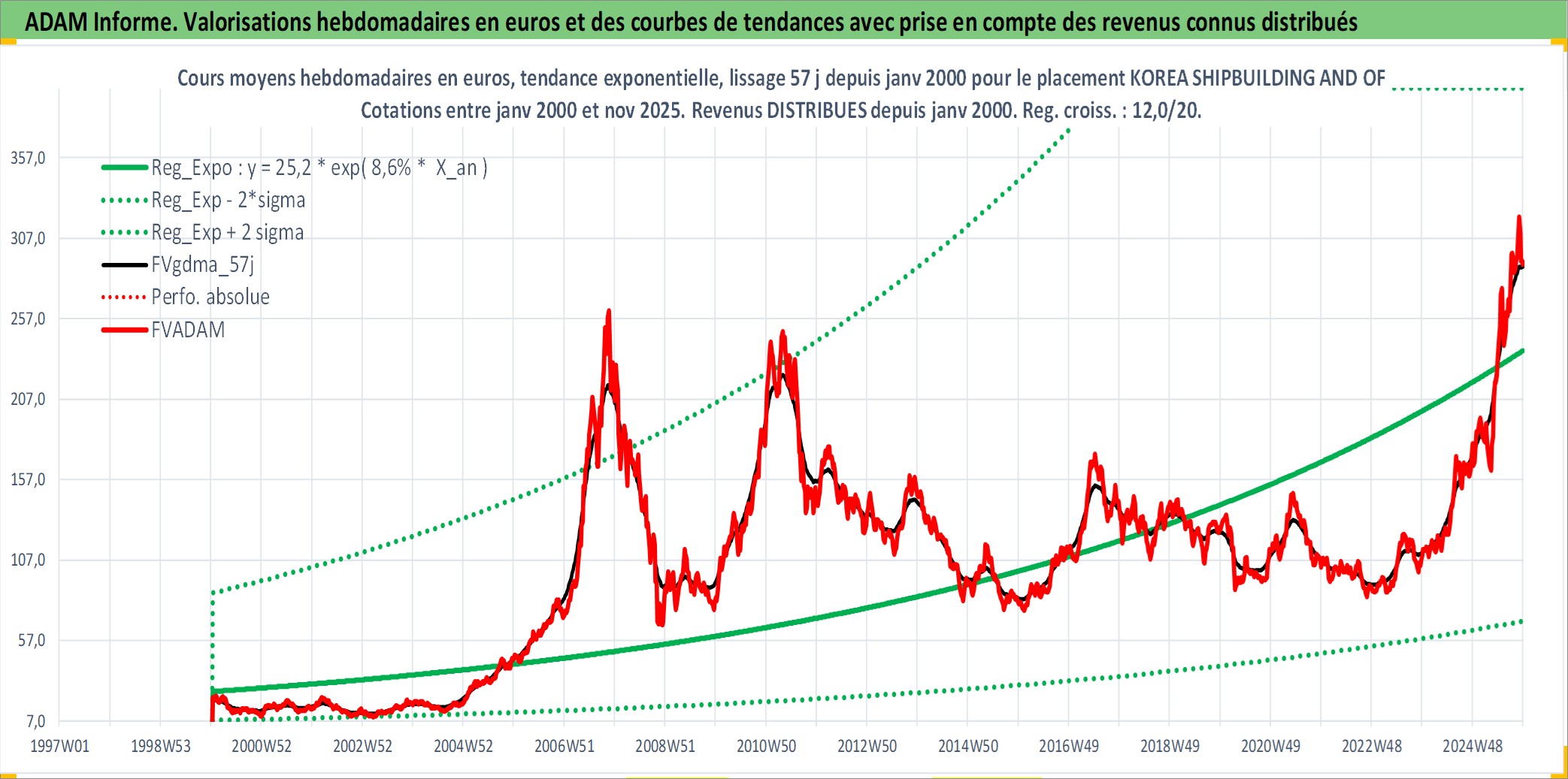Site dédié aux investisseursPage dédiée sur site financeAnalyse des valorisations hebdomadaires de l'action KOREA SHIPBUILDING AND OFFSHORE EN. Cet actif est cote en KRW. Les valorisations sont en contrevaleur EURO et couvrent les semaines 2000W02 a 2025W48. Les revenus de cet actif financier sont pris en compte depuis la semaine 2000W01. La note globale ESG de cet actif est estimee a 6.0 (apres rebasage entre 0 et 20).