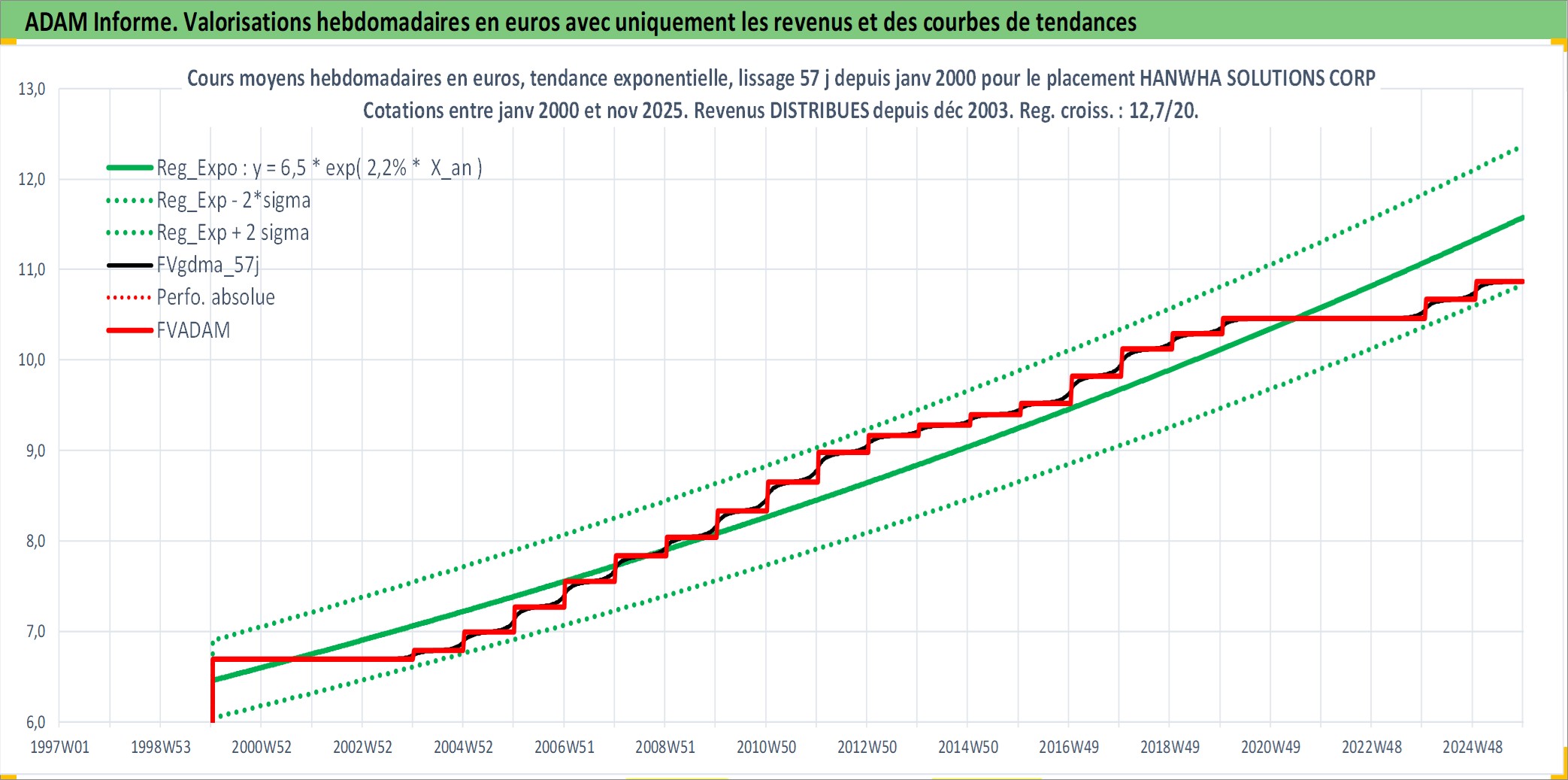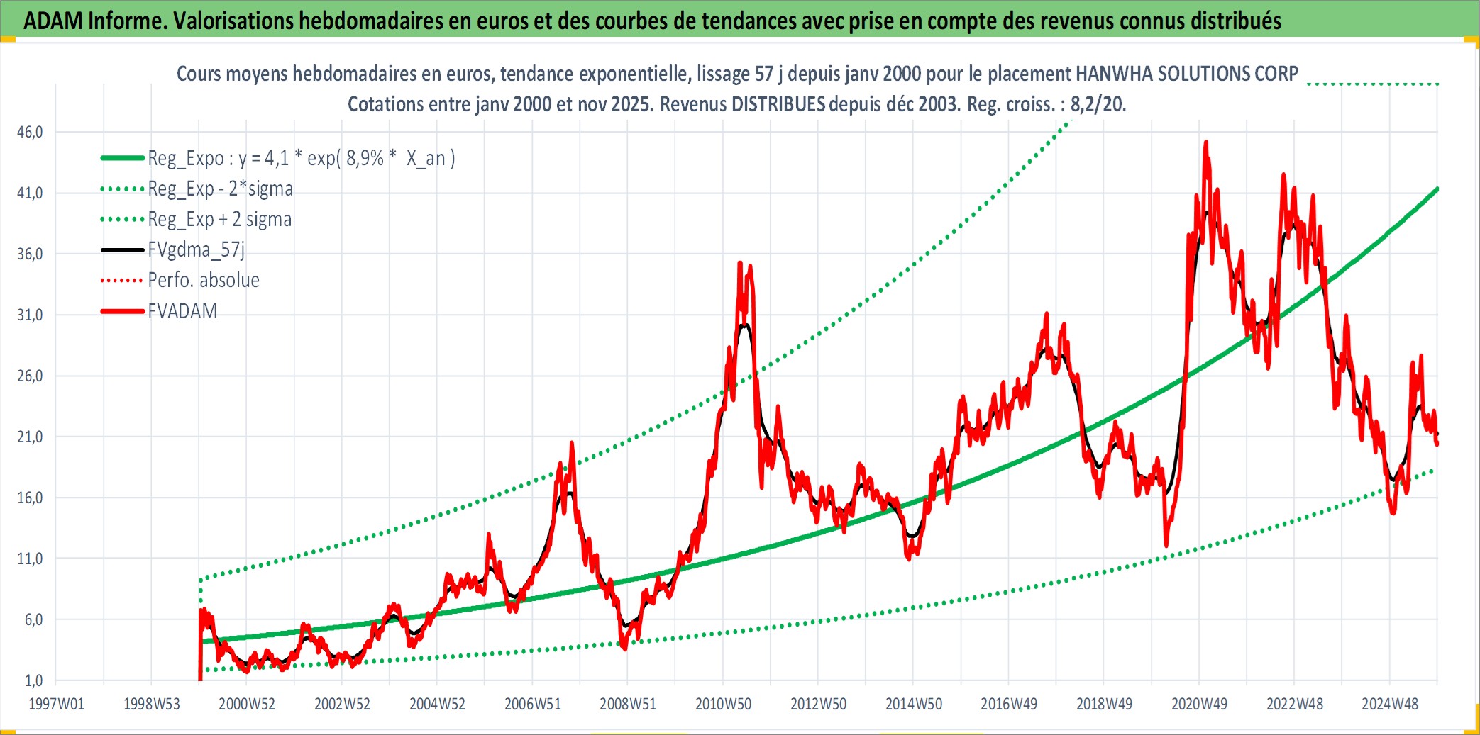 Site dédié aux investisseursPage dédiée sur site financeAnalyse des valorisations hebdomadaires de l'action HANWHA SOLUTIONS CORP. Cet actif est cote en KRW. Les valorisations sont en contrevaleur EURO et couvrent les semaines 2000W02 a 2025W48. Les revenus de cet actif financier sont pris en compte depuis la semaine 2004W01. La note ESG de cet actif n'est pas connue.