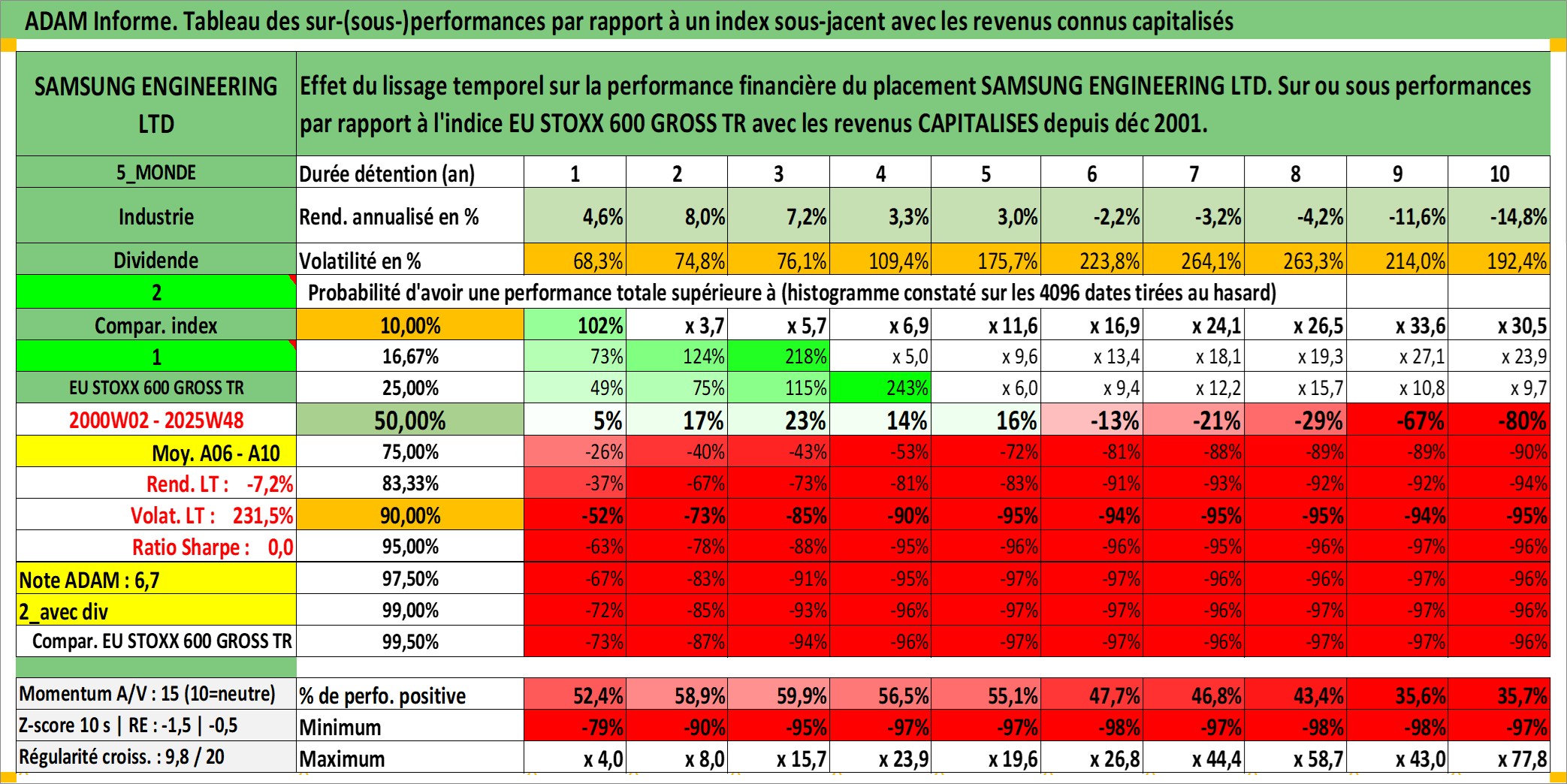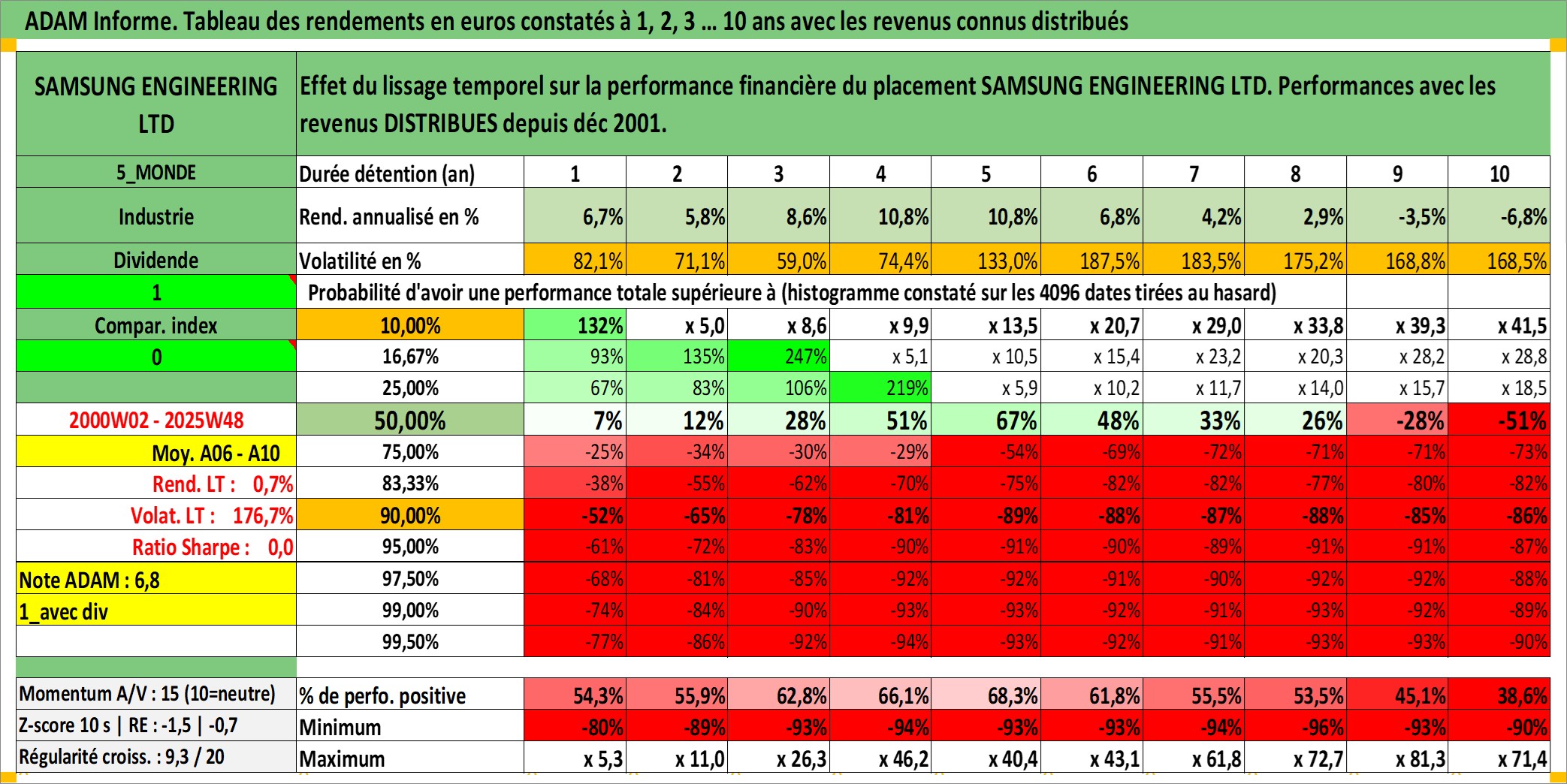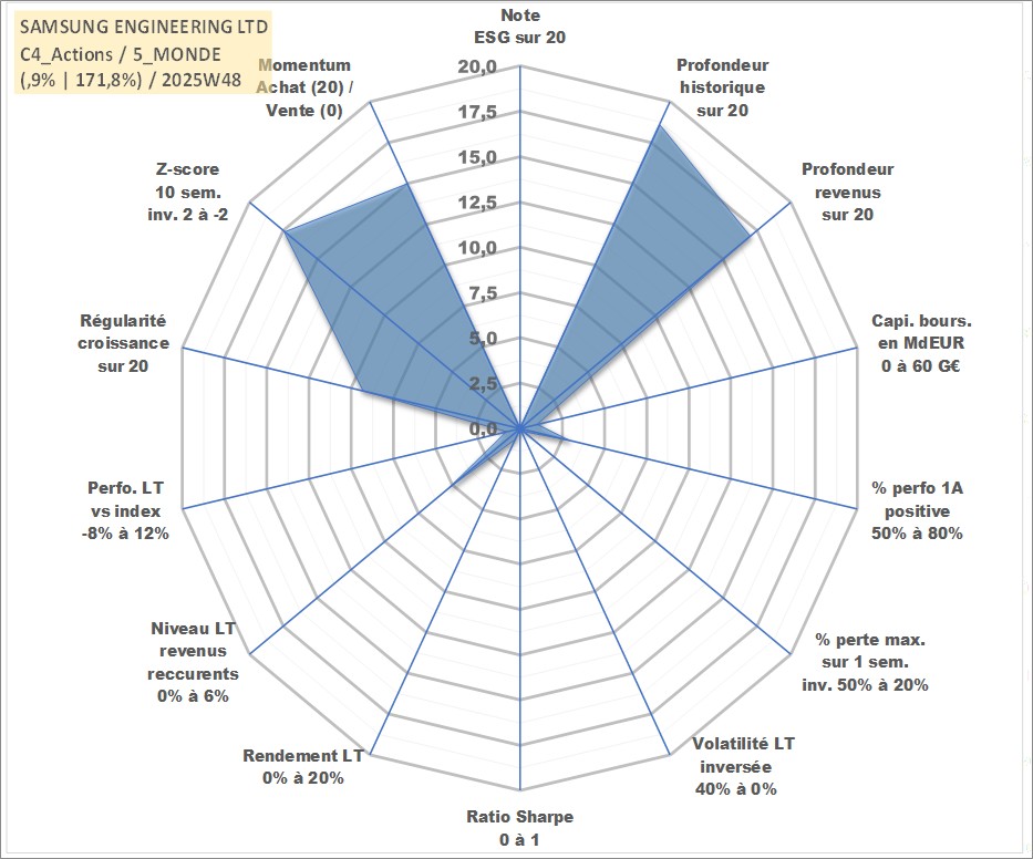 Site dédié aux investisseursPage dédiée sur site financeAnalyse des valorisations hebdomadaires de l'action SAMSUNG ENGINEERING LTD. Cet actif est cote en KRW. Les valorisations sont en contrevaleur EURO et couvrent les semaines 2000W02 a 2025W48. Les revenus de cet actif financier sont pris en compte depuis la semaine 2001W52. La note ESG de cet actif n'est pas connue.