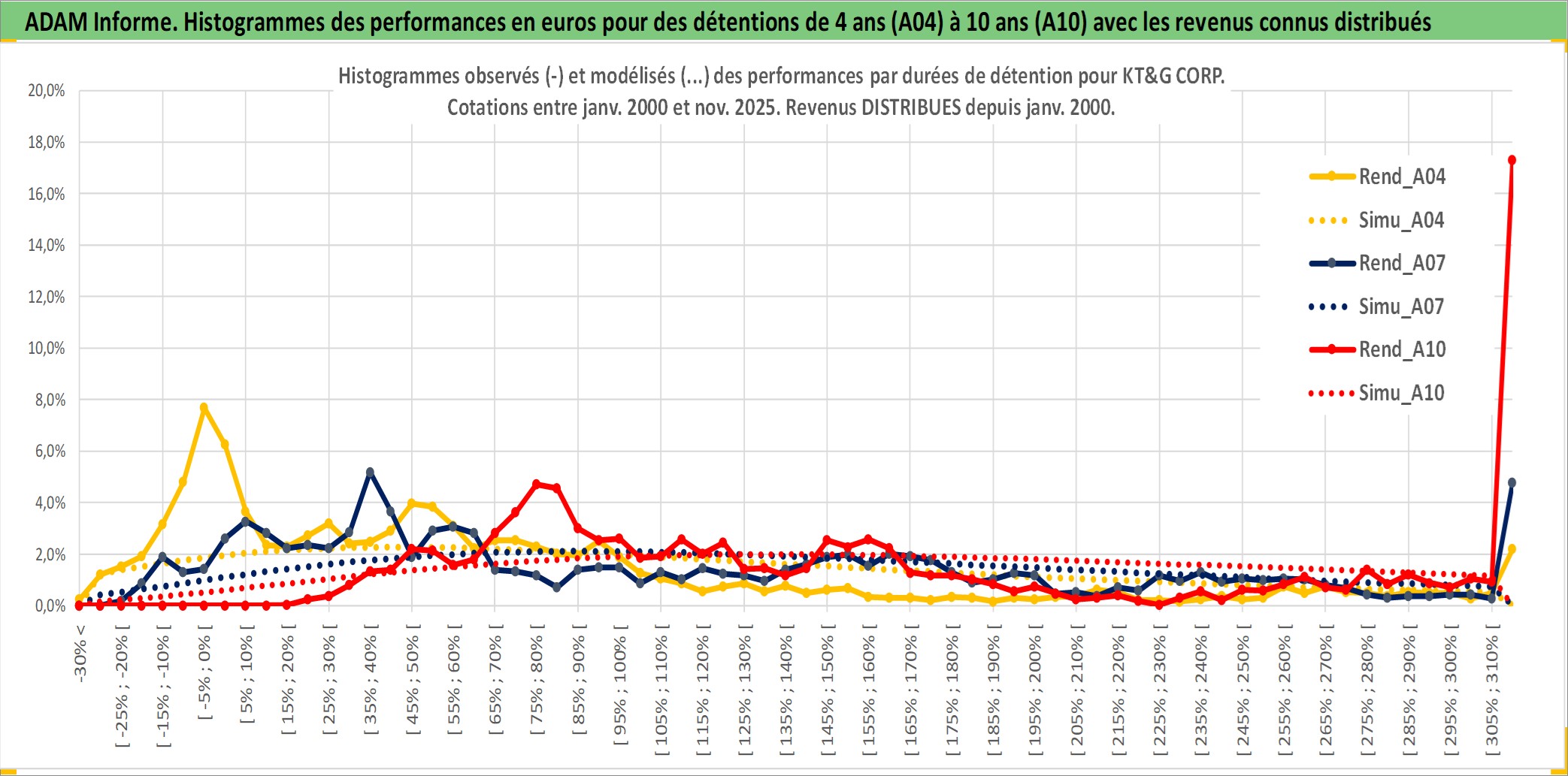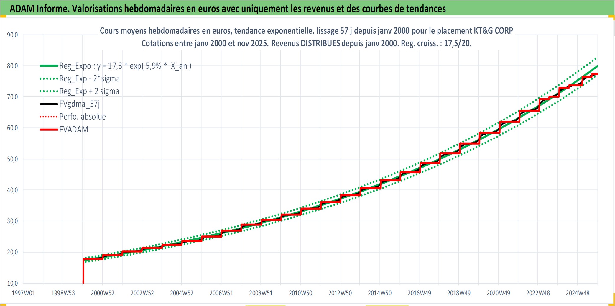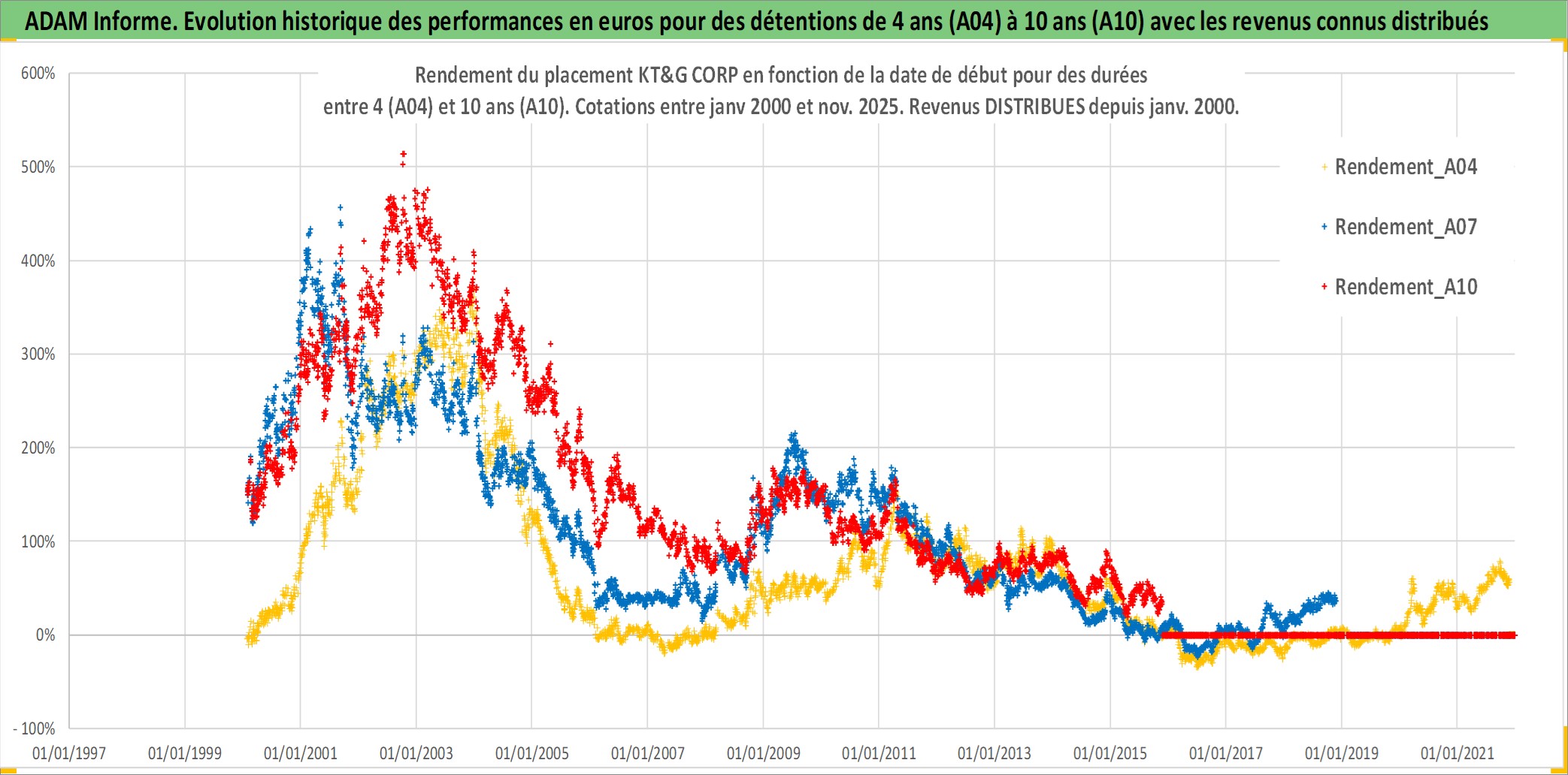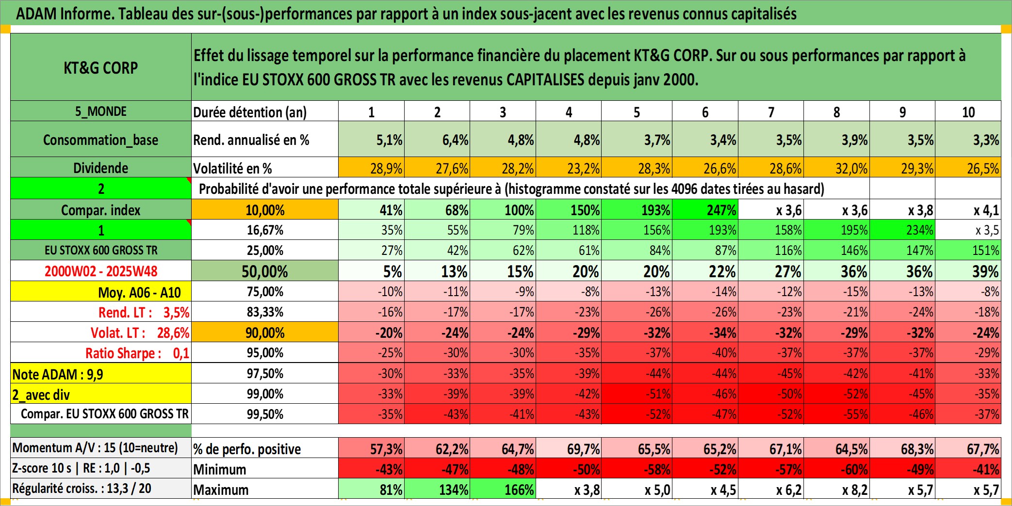 Site dédié aux investisseursPage dédiée sur site financeAnalyse des valorisations hebdomadaires de l'action KT&G CORP. Cet actif est cote en KRW. Les valorisations sont en contrevaleur EURO et couvrent les semaines 2000W02 a 2025W48. Les revenus de cet actif financier sont pris en compte depuis la semaine 2000W01. La note globale ESG de cet actif est estimee a 5.0 (apres rebasage entre 0 et 20).