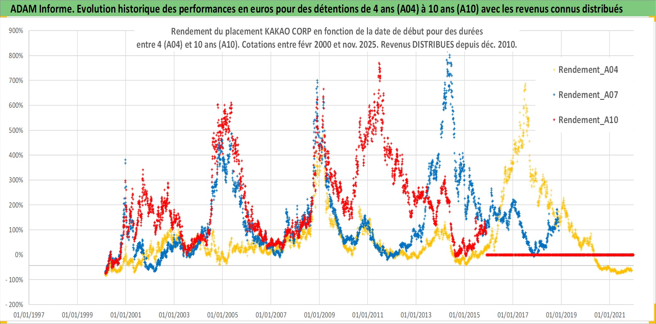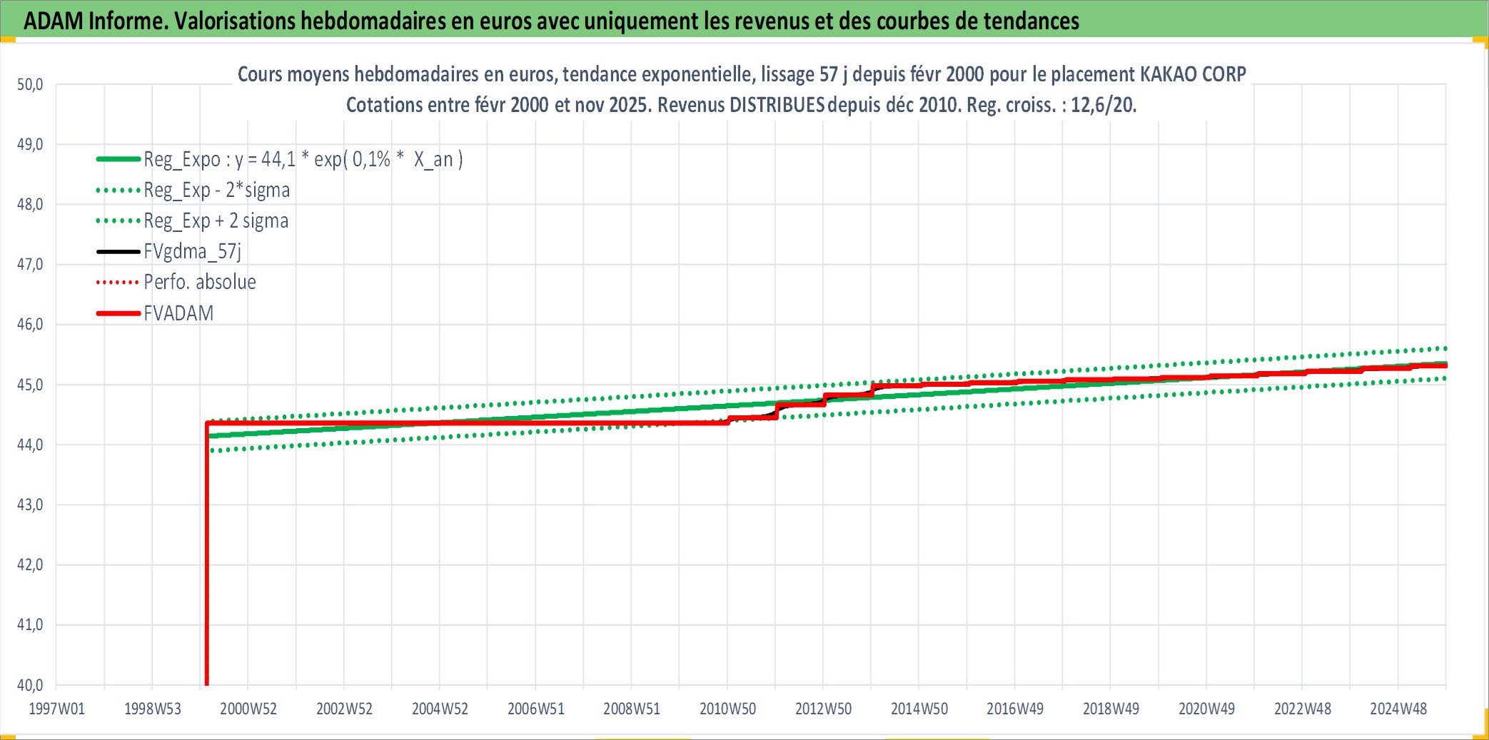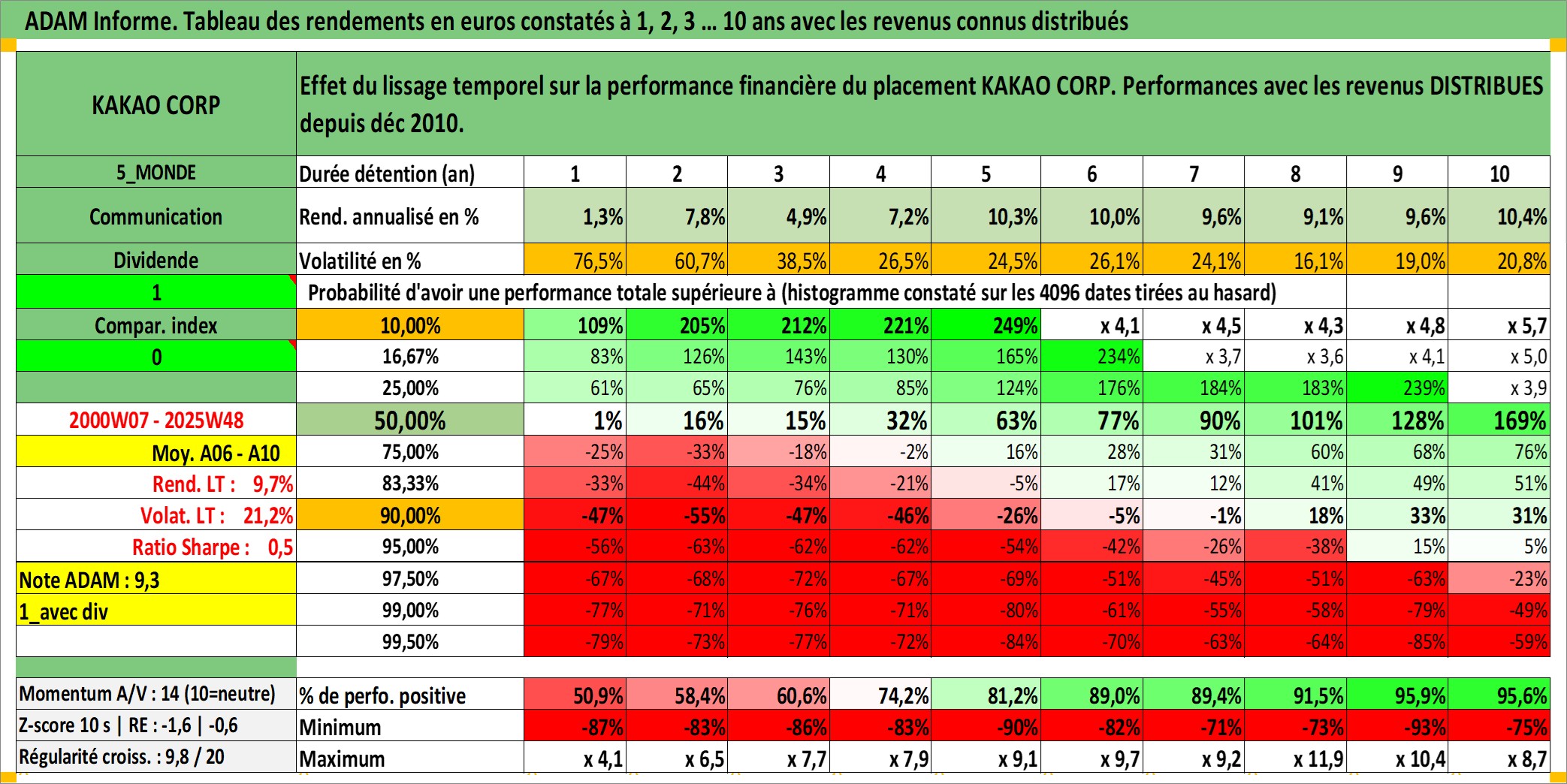 Site dédié aux investisseursPage dédiée sur site financeAnalyse des valorisations hebdomadaires de l'action KAKAO CORP. Cet actif est cote en KRW. Les valorisations sont en contrevaleur EURO et couvrent les semaines 2000W07 a 2025W48. Les revenus de cet actif financier sont pris en compte depuis la semaine 2010W52. La note globale ESG de cet actif est estimee a 7.0 (apres rebasage entre 0 et 20).