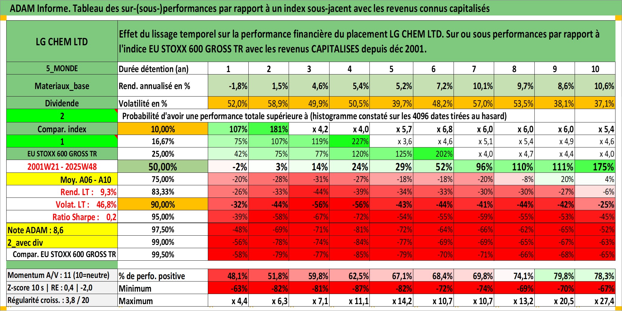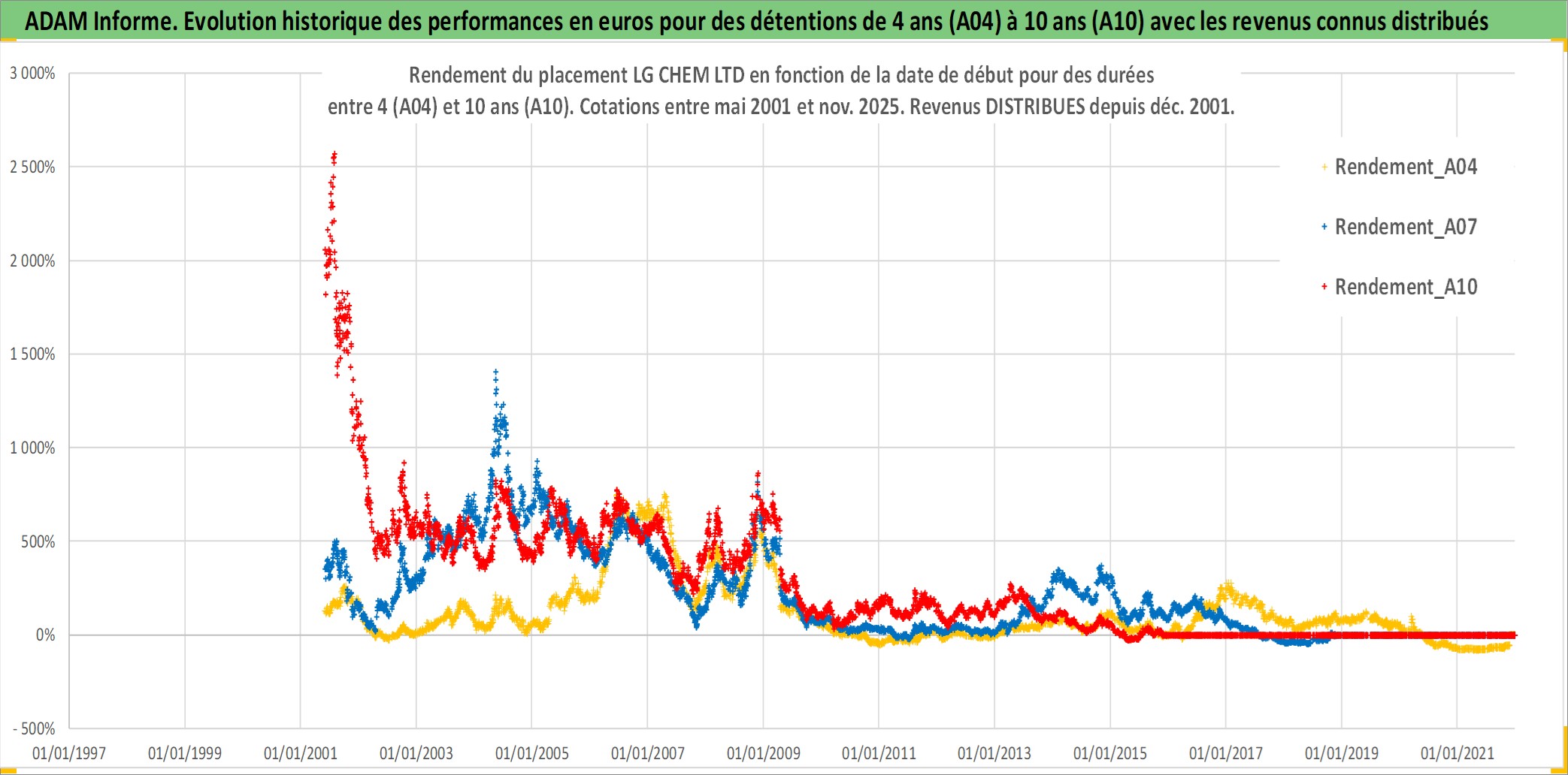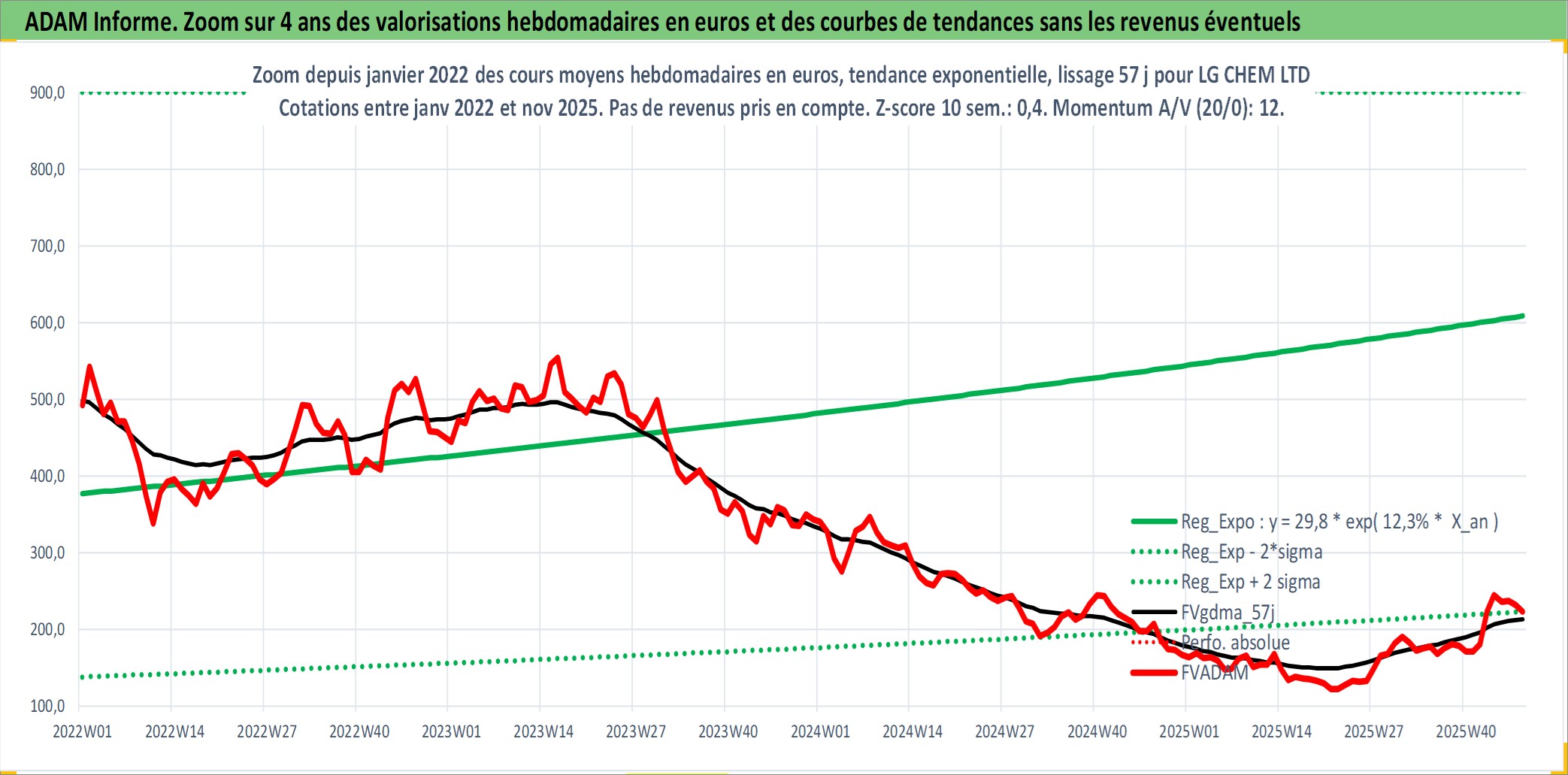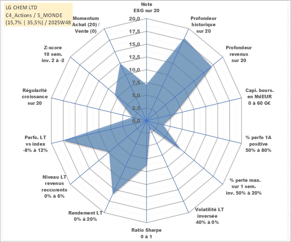 Site dédié aux investisseursPage dédiée sur site financeAnalyse des valorisations hebdomadaires de l'action LG CHEM LTD. Cet actif est cote en KRW. Les valorisations sont en contrevaleur EURO et couvrent les semaines 2001W21 a 2025W48. Les revenus de cet actif financier sont pris en compte depuis la semaine 2001W52. La note globale ESG de cet actif est estimee a 7.0 (apres rebasage entre 0 et 20).