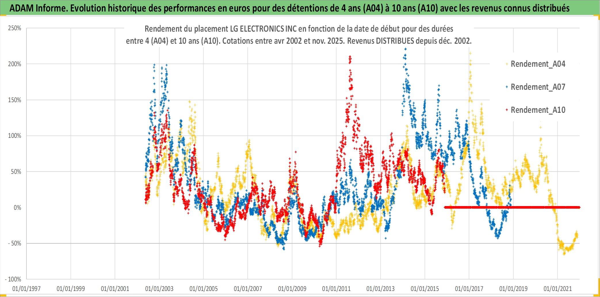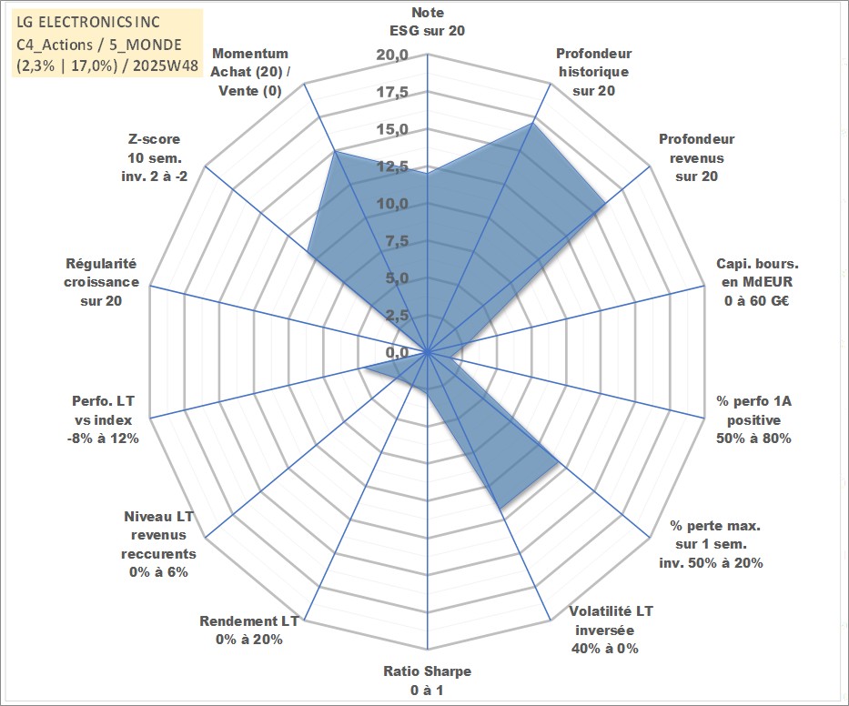 Site dédié aux investisseursPage dédiée sur site financeAnalyse des valorisations hebdomadaires de l'action LG ELECTRONICS INC. Cet actif est cote en KRW. Les valorisations sont en contrevaleur EURO et couvrent les semaines 2002W18 a 2025W48. Les revenus de cet actif financier sont pris en compte depuis la semaine 2002W52. La note globale ESG de cet actif est estimee a 12.0 (apres rebasage entre 0 et 20).
