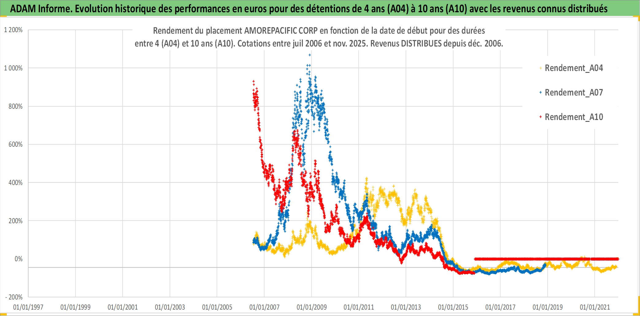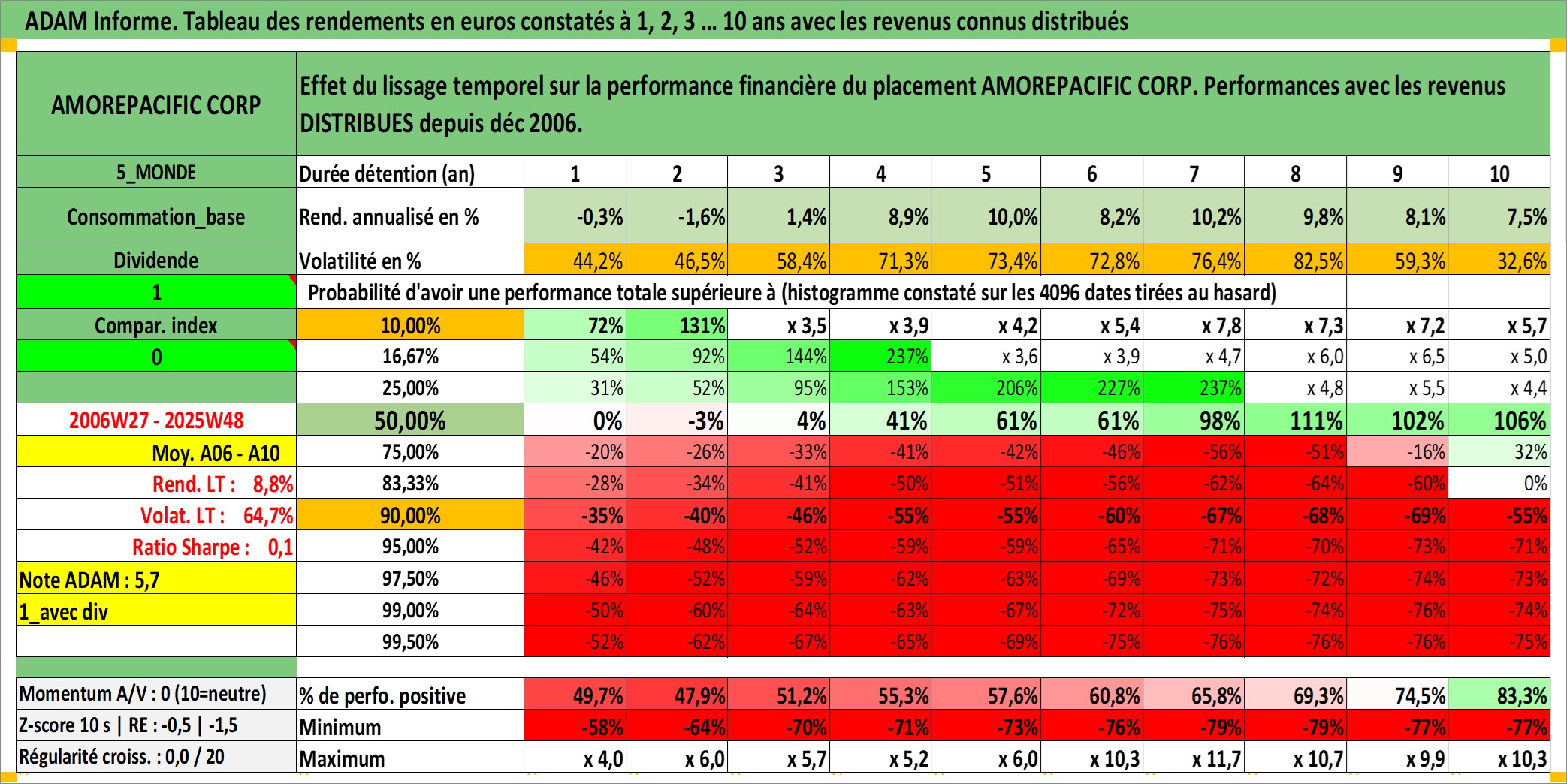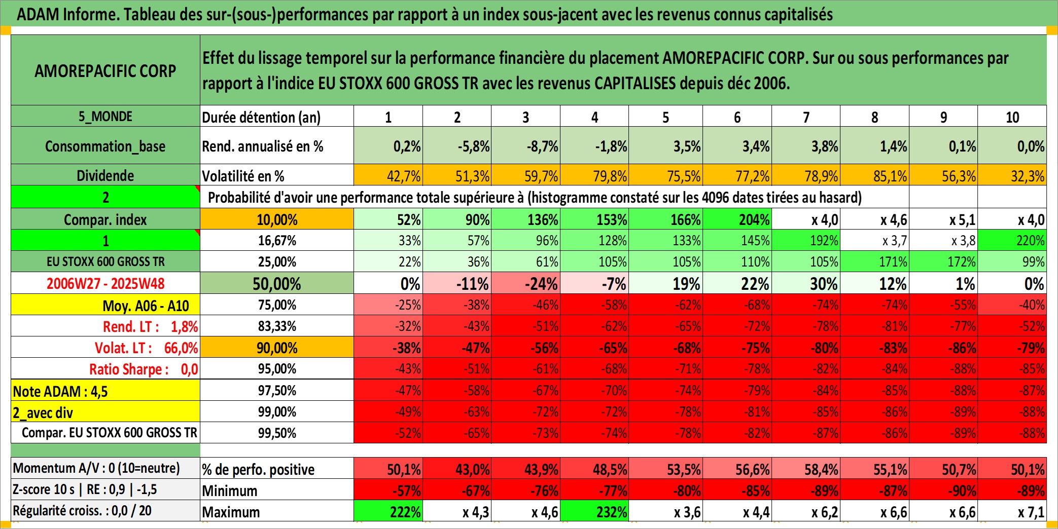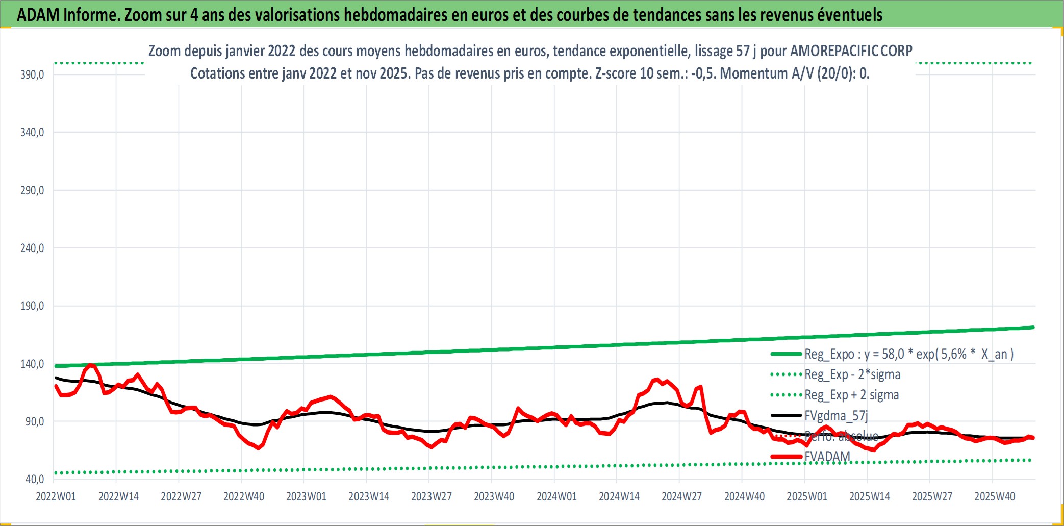 Site dédié aux investisseursPage dédiée sur site financeAnalyse des valorisations hebdomadaires de l'action AMOREPACIFIC CORP. Cet actif est cote en KRW. Les valorisations sont en contrevaleur EURO et couvrent les semaines 2006W27 a 2025W48. Les revenus de cet actif financier sont pris en compte depuis la semaine 2006W52. La note globale ESG de cet actif est estimee a 3.0 (apres rebasage entre 0 et 20).