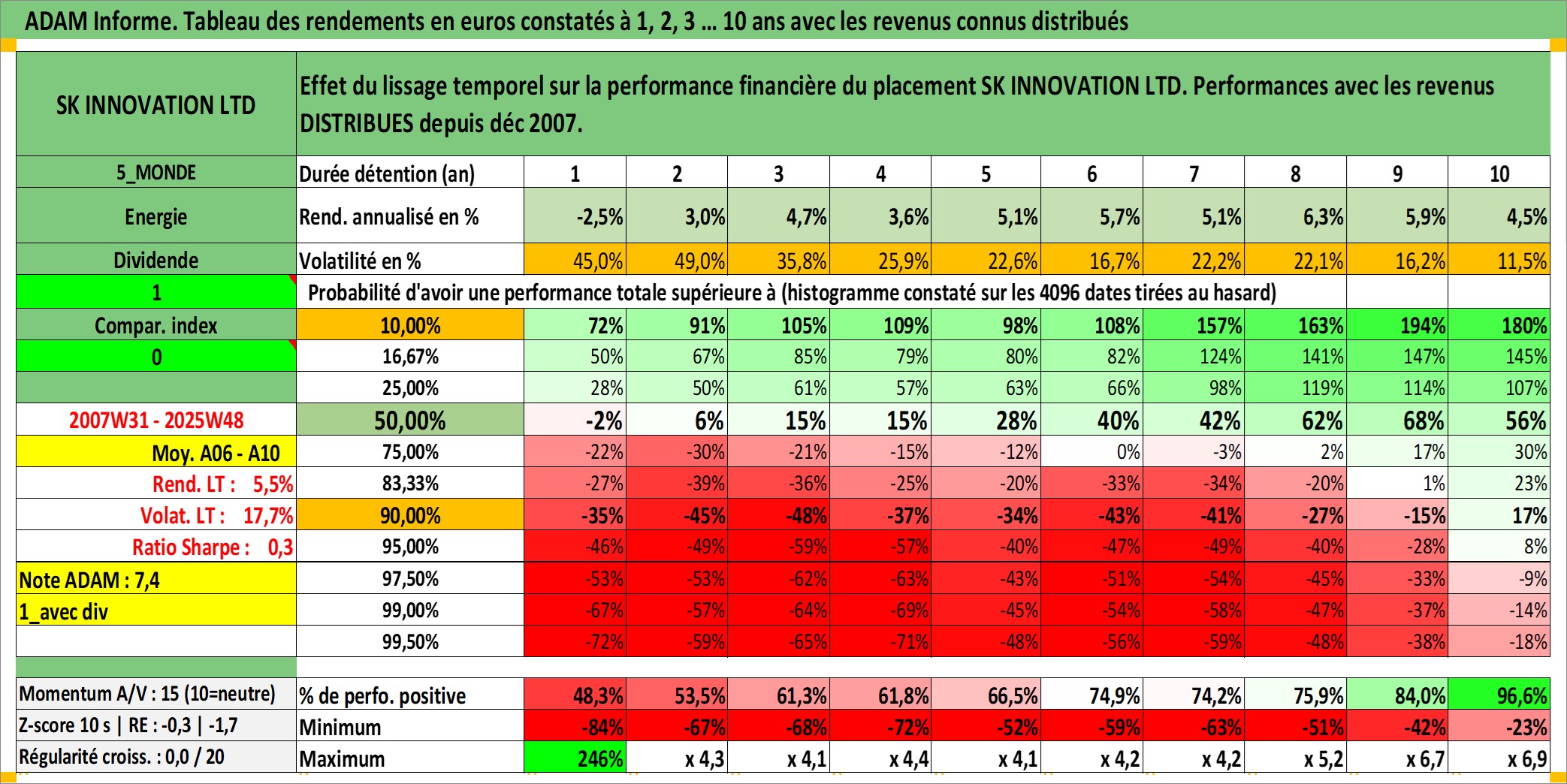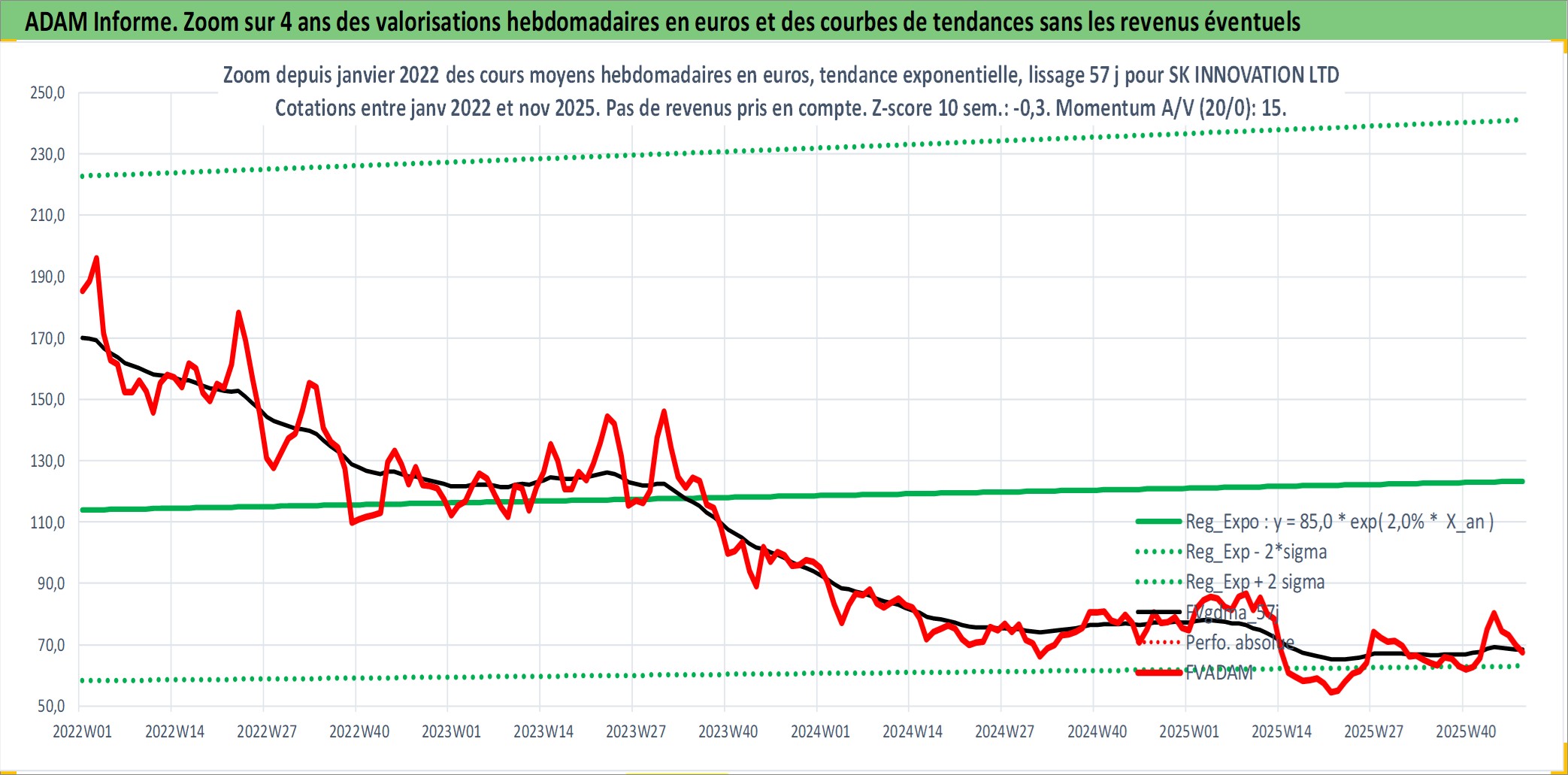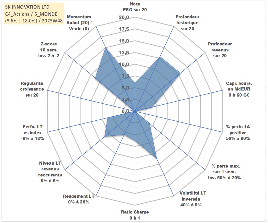 Site dédié aux investisseursPage dédiée sur site financeAnalyse des valorisations hebdomadaires de l'action SK INNOVATION LTD. Cet actif est cote en KRW. Les valorisations sont en contrevaleur EURO et couvrent les semaines 2007W31 a 2025W48. Les revenus de cet actif financier sont pris en compte depuis la semaine 2007W52. La note globale ESG de cet actif est estimee a 6.0 (apres rebasage entre 0 et 20).