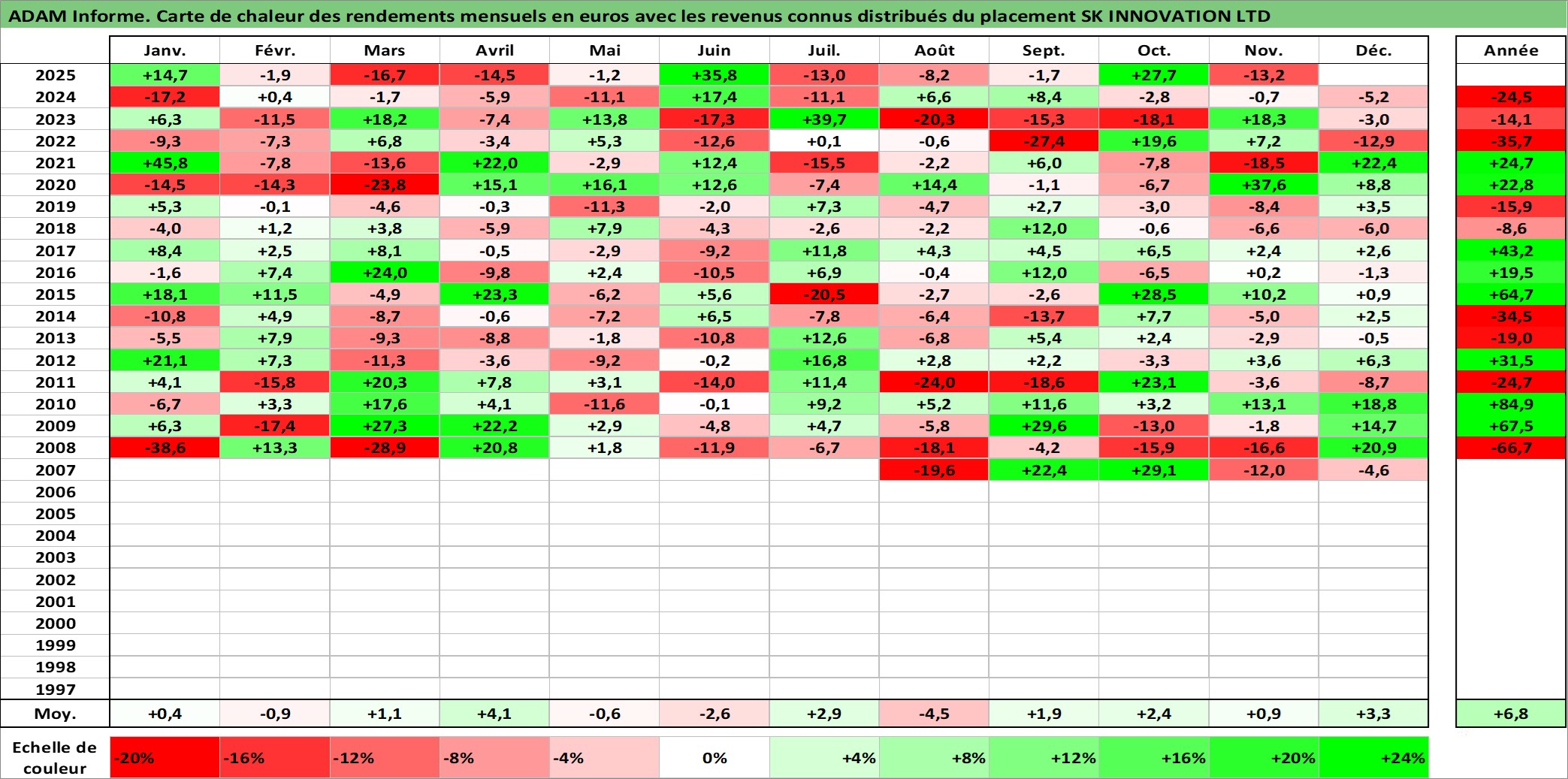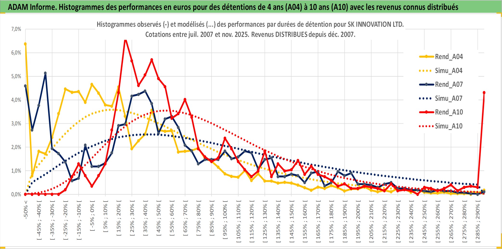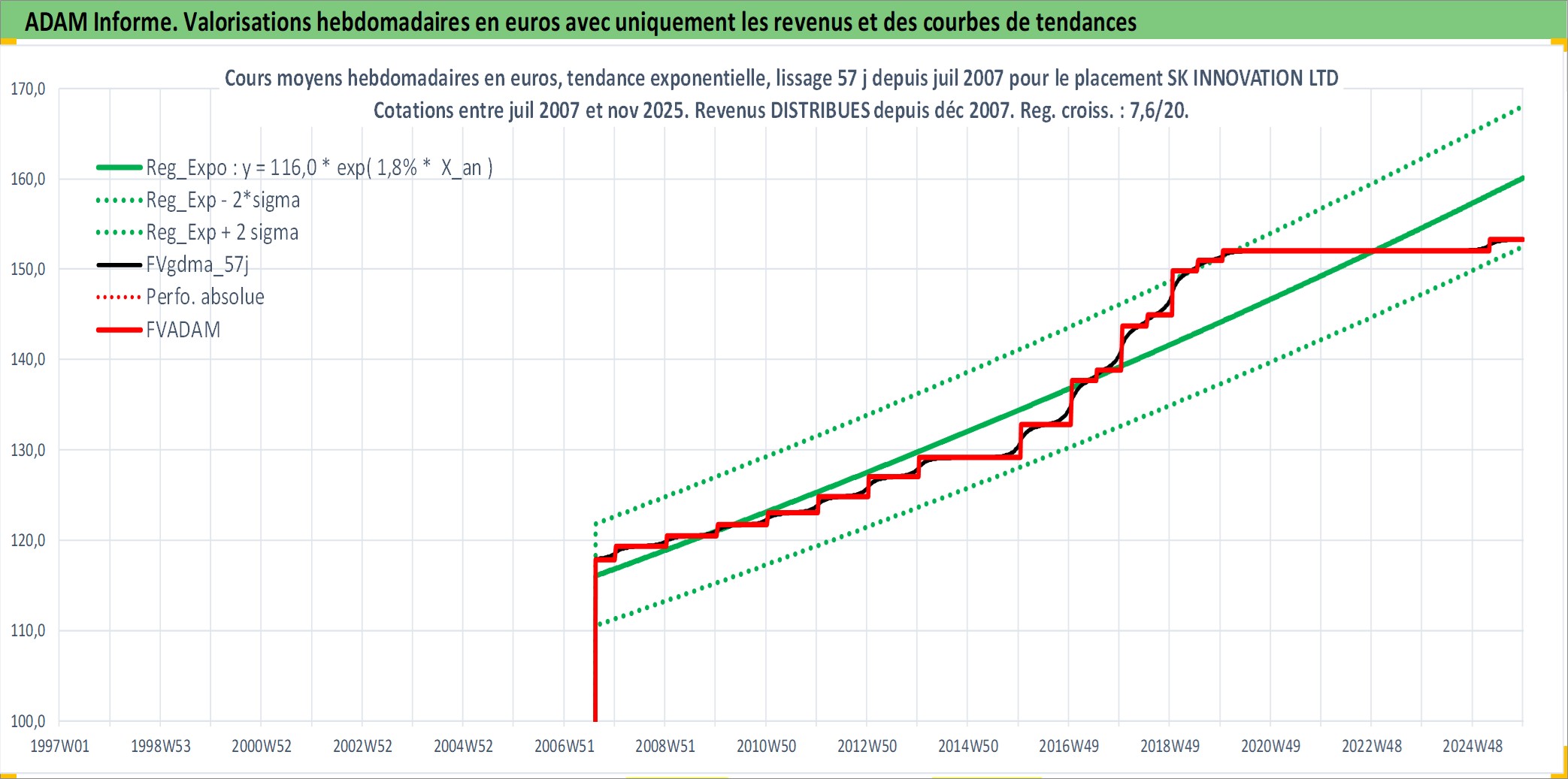 Site dédié aux investisseursPage dédiée sur site financeAnalyse des valorisations hebdomadaires de l'action SK INNOVATION LTD. Cet actif est cote en KRW. Les valorisations sont en contrevaleur EURO et couvrent les semaines 2007W31 a 2025W48. Les revenus de cet actif financier sont pris en compte depuis la semaine 2007W52. La note globale ESG de cet actif est estimee a 6.0 (apres rebasage entre 0 et 20).