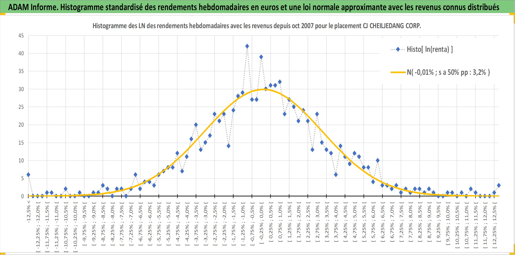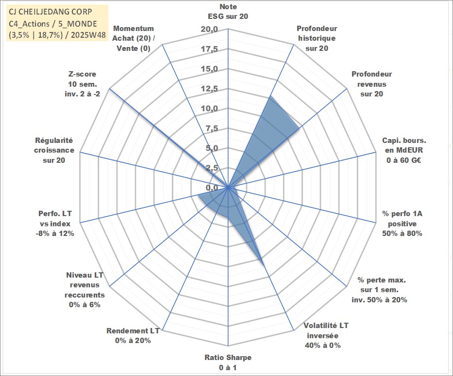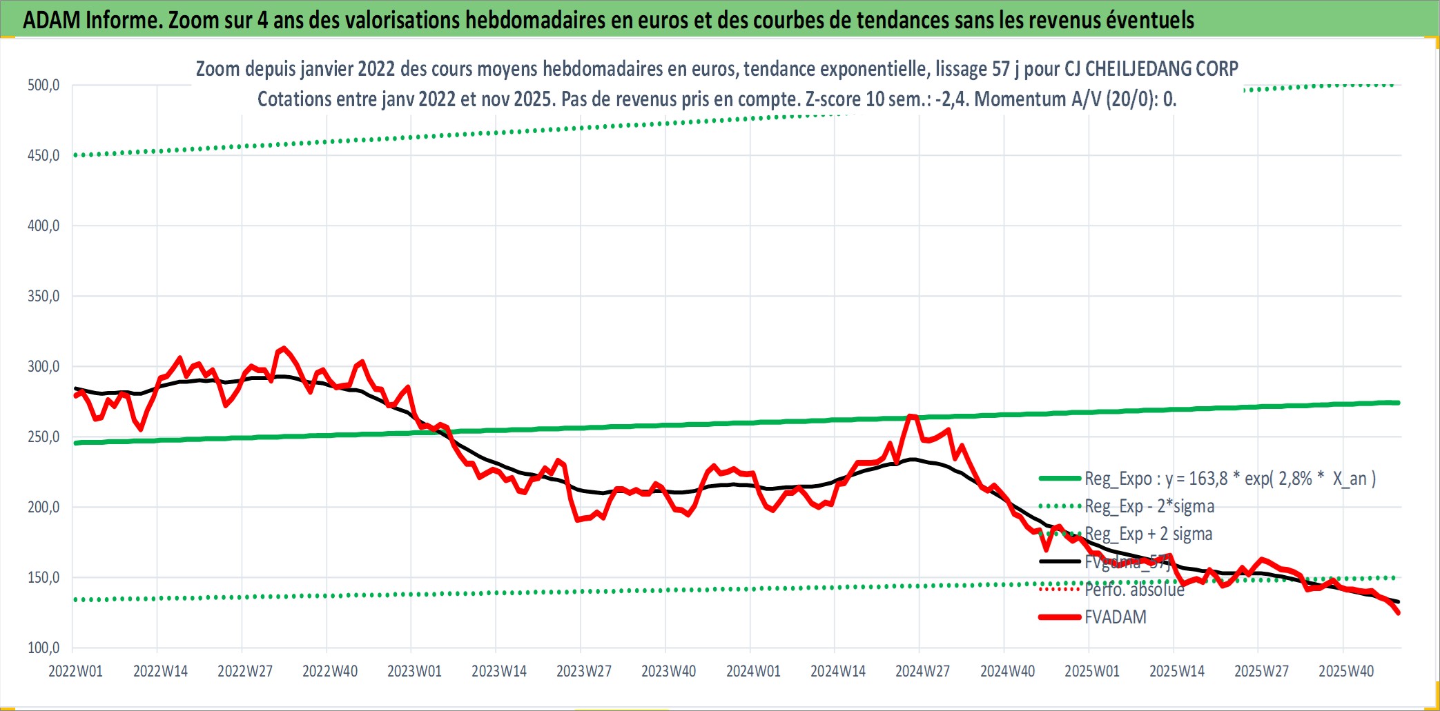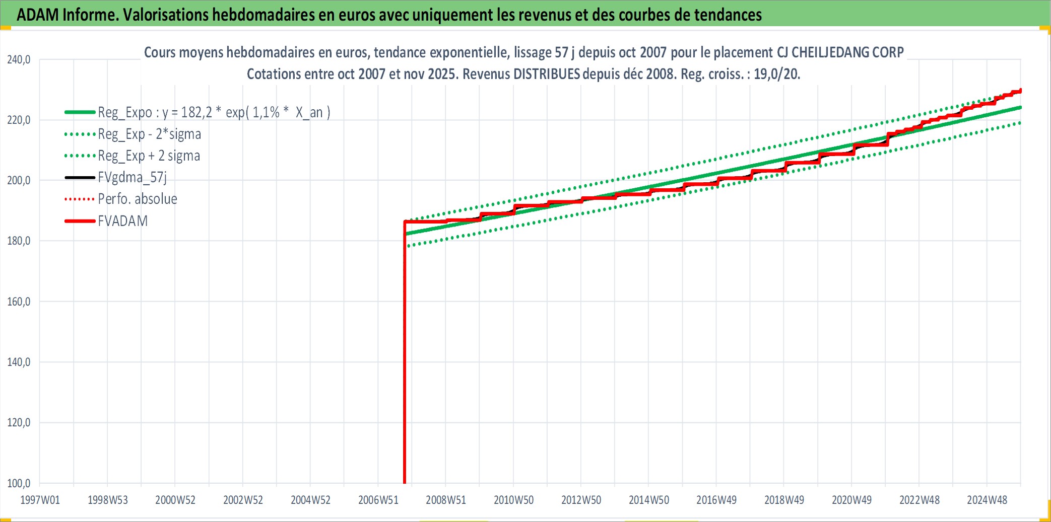 Site dédié aux investisseursPage dédiée sur site financeAnalyse des valorisations hebdomadaires de l'action CJ CHEILJEDANG CORP. Cet actif est cote en KRW. Les valorisations sont en contrevaleur EURO et couvrent les semaines 2007W40 a 2025W48. Les revenus de cet actif financier sont pris en compte depuis la semaine 2009W01. La note ESG de cet actif n'est pas connue.