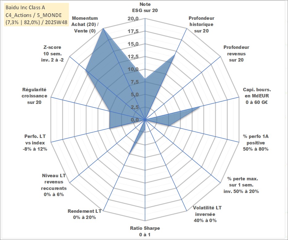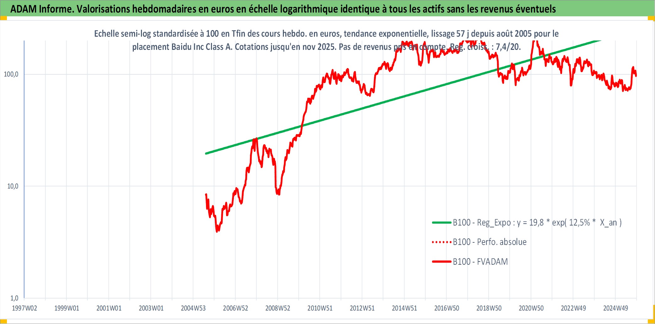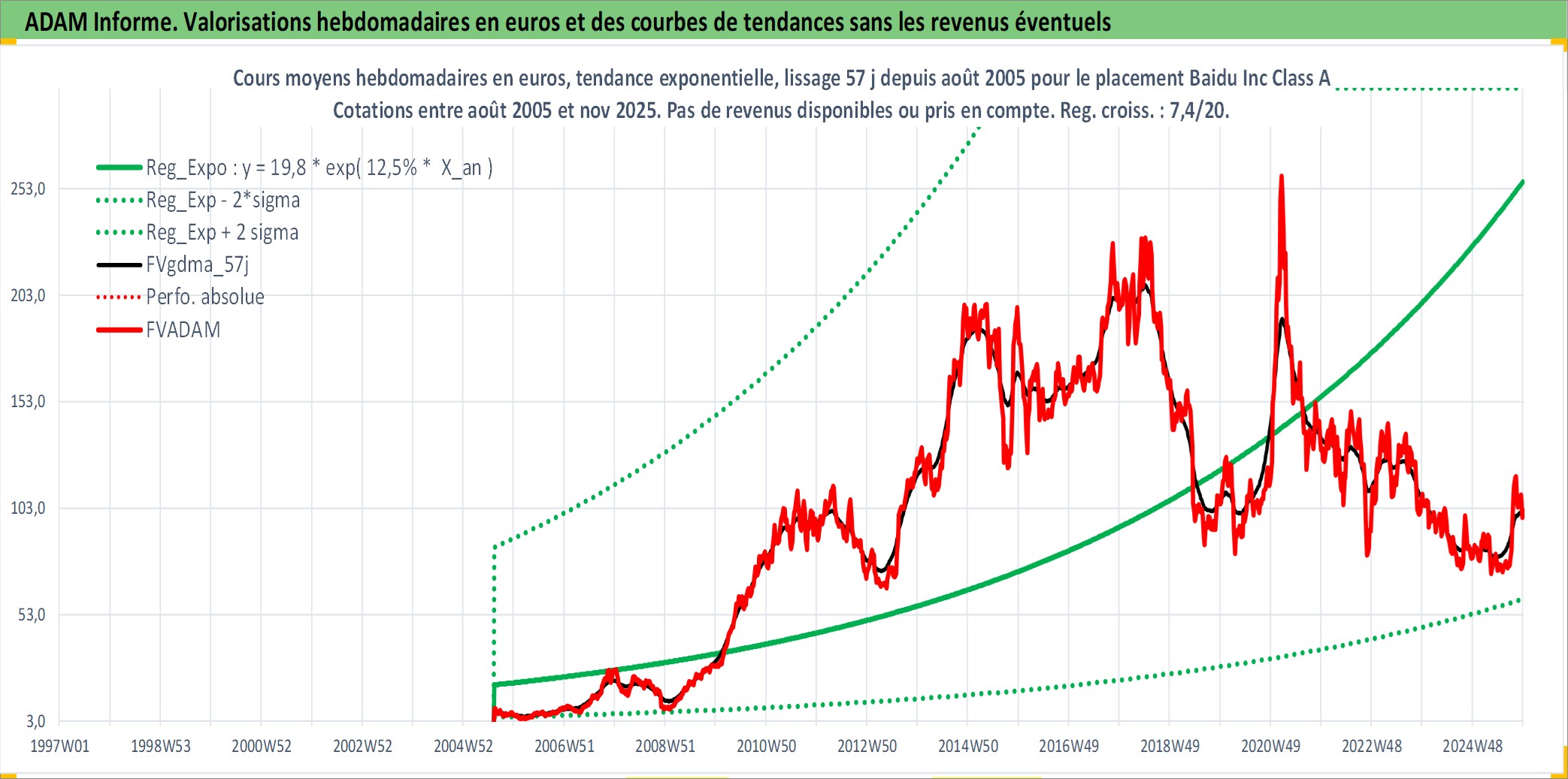 Site dédié aux investisseursPage dédiée sur site financeAnalyse des valorisations hebdomadaires de l'action Baidu Inc Class A. Cet actif est cote en USD. Les valorisations sont en contrevaleur EURO et couvrent les semaines 2005W31 a 2025W48. Les revenus de cet actif financier ne sont pas connus car non existants ou non disponibles sur le site Yahoo Finance. La note globale ESG de cet actif est estimee a 8.0 (apres rebasage entre 0 et 20).