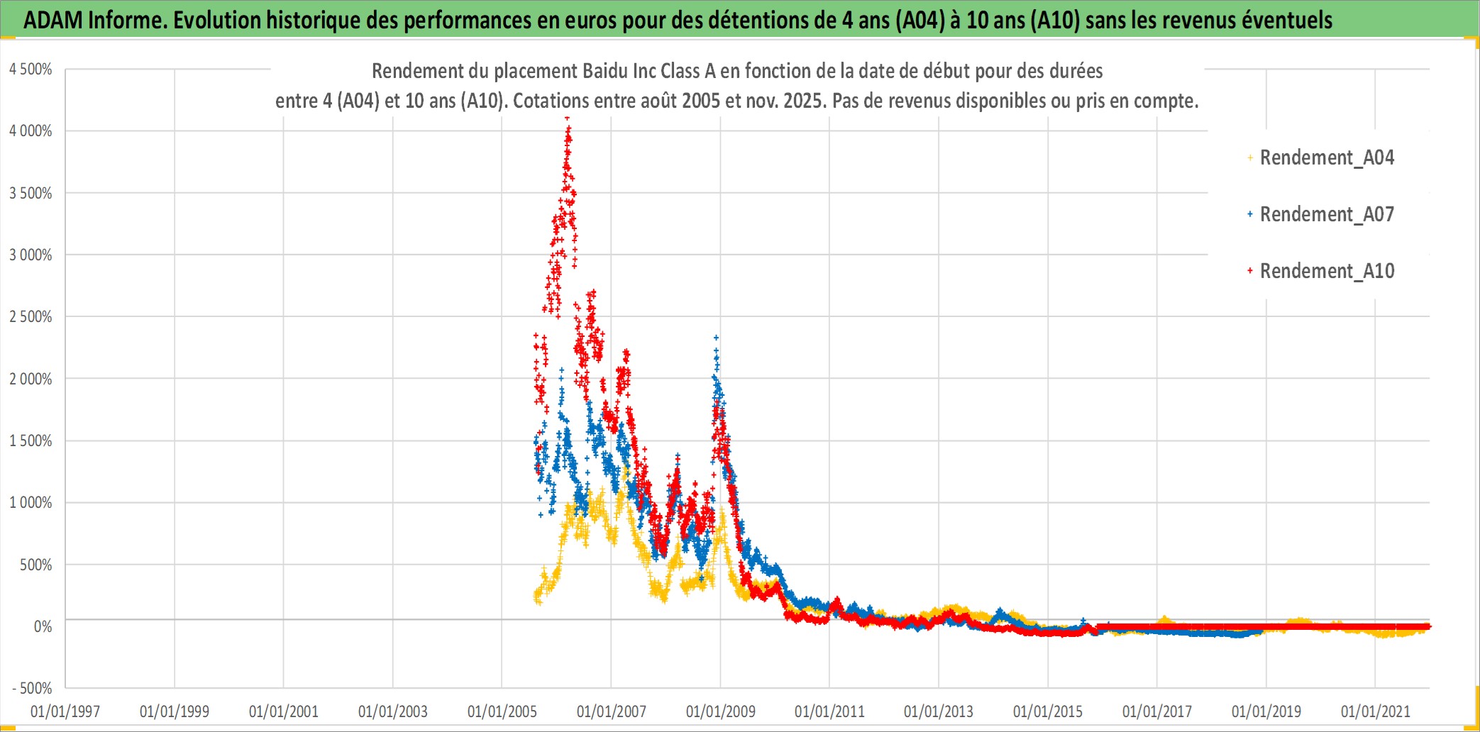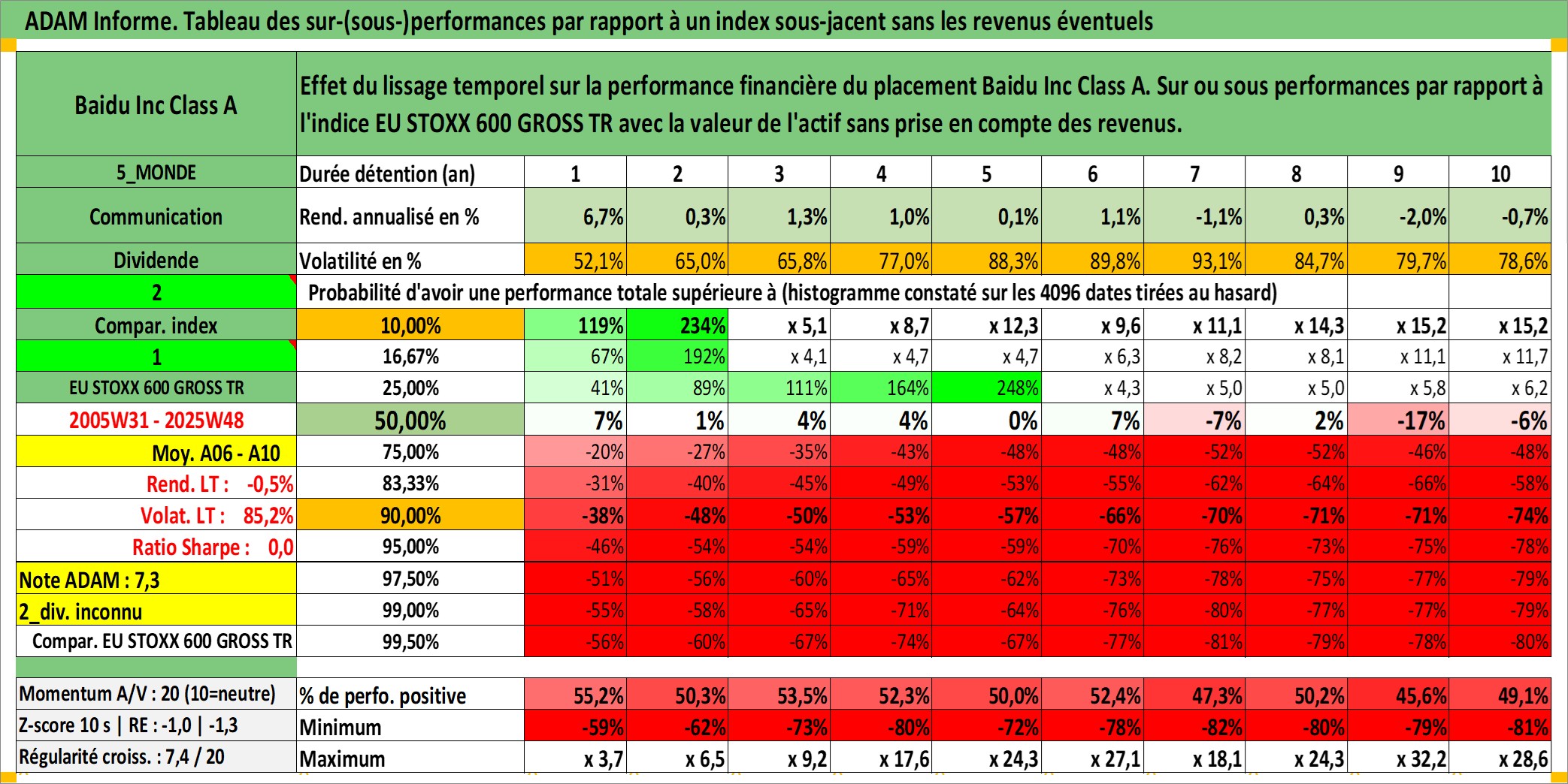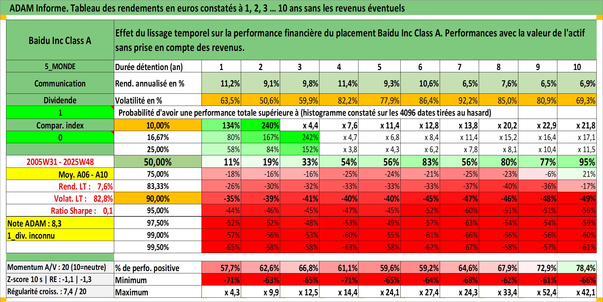 Site dédié aux investisseursPage dédiée sur site financeAnalyse des valorisations hebdomadaires de l'action Baidu Inc Class A. Cet actif est cote en USD. Les valorisations sont en contrevaleur EURO et couvrent les semaines 2005W31 a 2025W48. Les revenus de cet actif financier ne sont pas connus car non existants ou non disponibles sur le site Yahoo Finance. La note globale ESG de cet actif est estimee a 8.0 (apres rebasage entre 0 et 20).