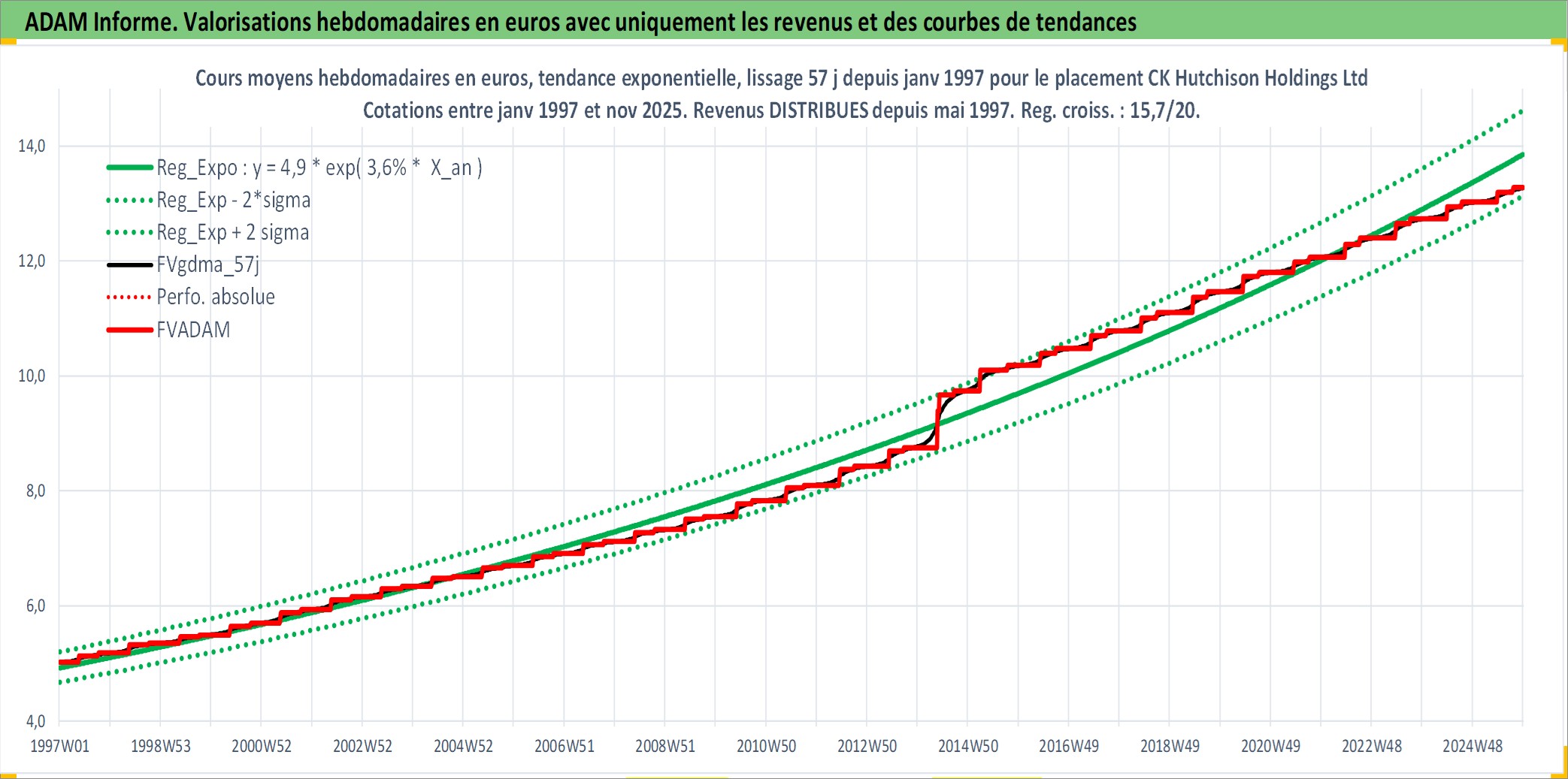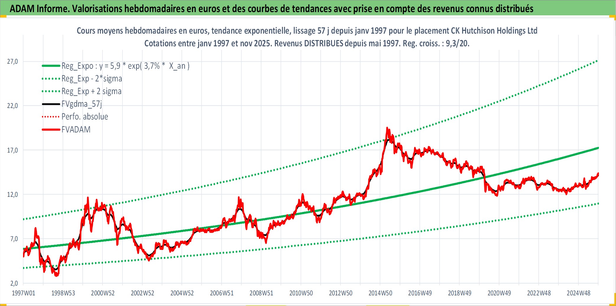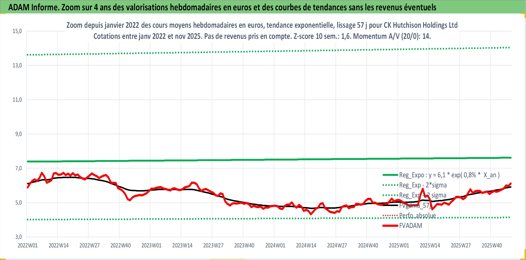 Site dédié aux investisseursPage dédiée sur site financeAnalyse des valorisations hebdomadaires de l'action CK Hutchison Holdings Ltd. Cet actif est cote en HKD. Les valorisations sont en contrevaleur EURO et couvrent les semaines 1997W01 a 2025W48. Les revenus de cet actif financier sont pris en compte depuis la semaine 1997W21. La note globale ESG de cet actif est estimee a 6.0 (apres rebasage entre 0 et 20).