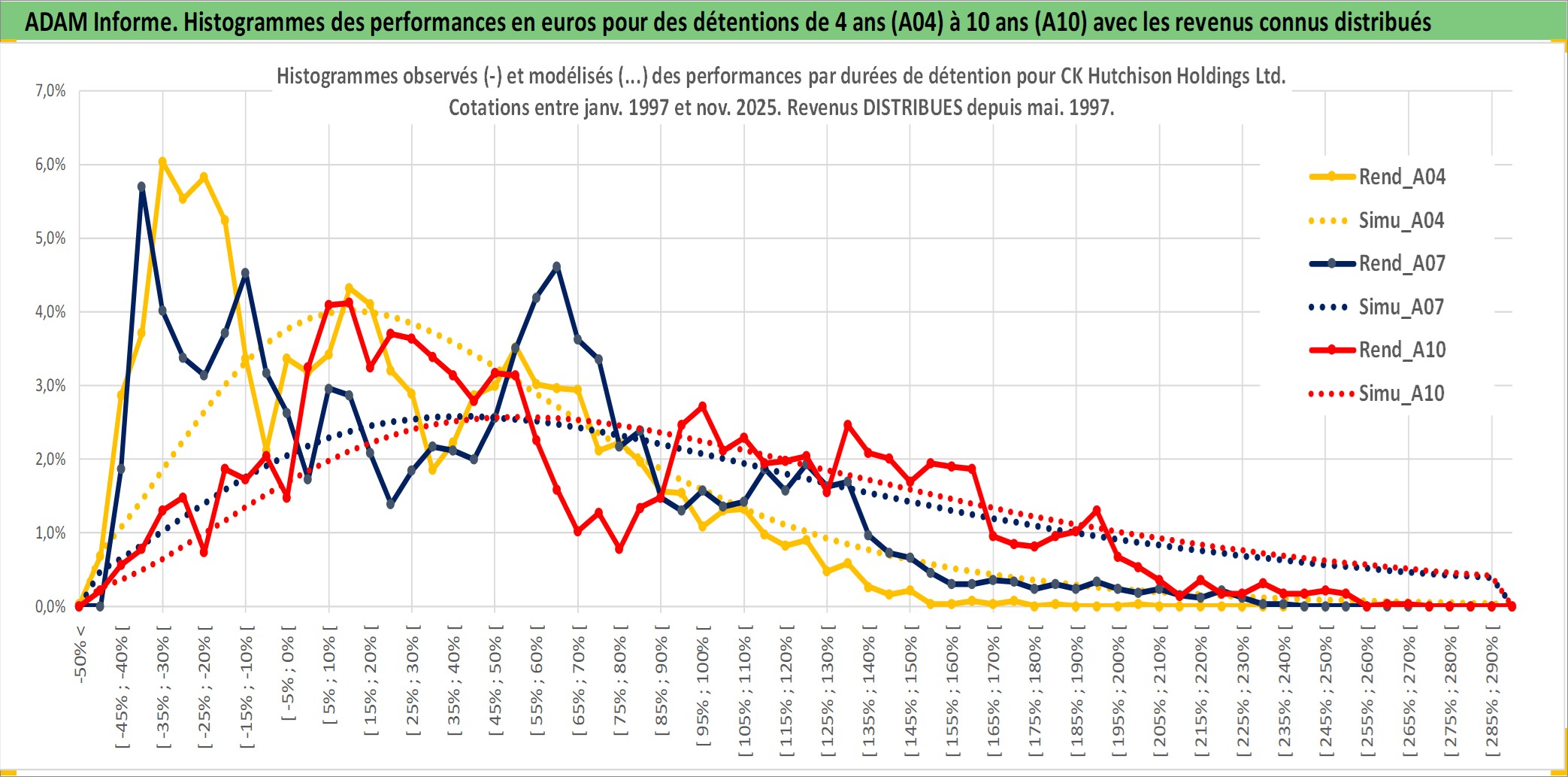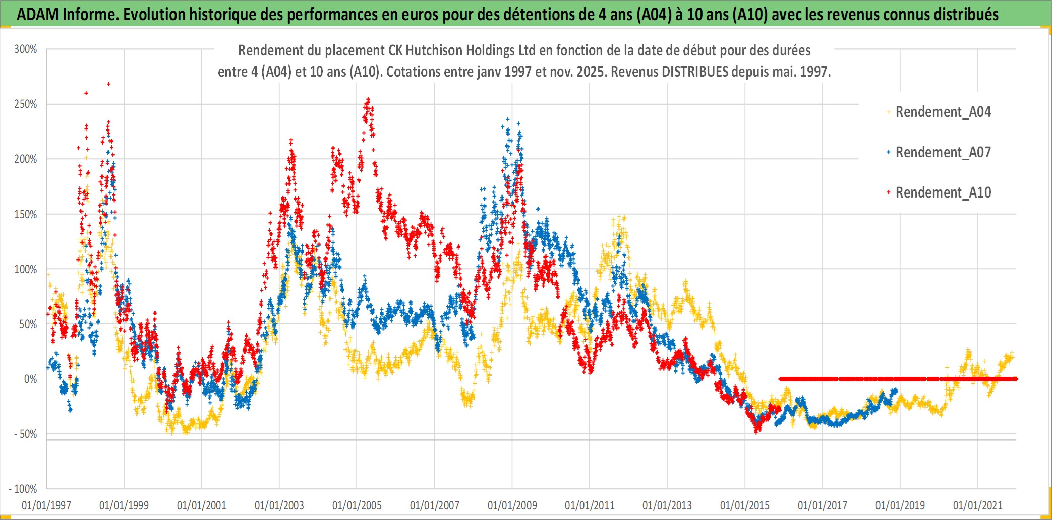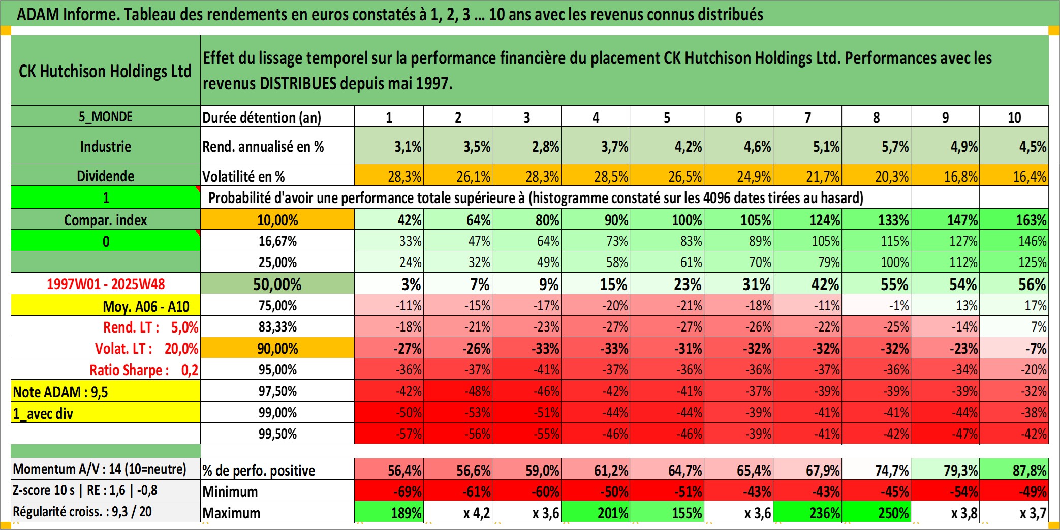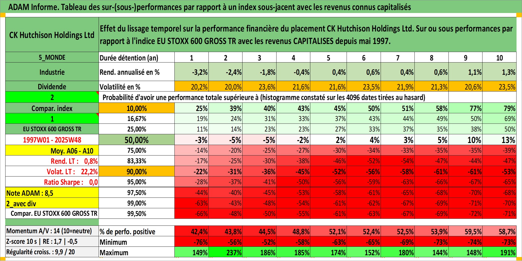 Site dédié aux investisseursPage dédiée sur site financeAnalyse des valorisations hebdomadaires de l'action CK Hutchison Holdings Ltd. Cet actif est cote en HKD. Les valorisations sont en contrevaleur EURO et couvrent les semaines 1997W01 a 2025W48. Les revenus de cet actif financier sont pris en compte depuis la semaine 1997W21. La note globale ESG de cet actif est estimee a 6.0 (apres rebasage entre 0 et 20).