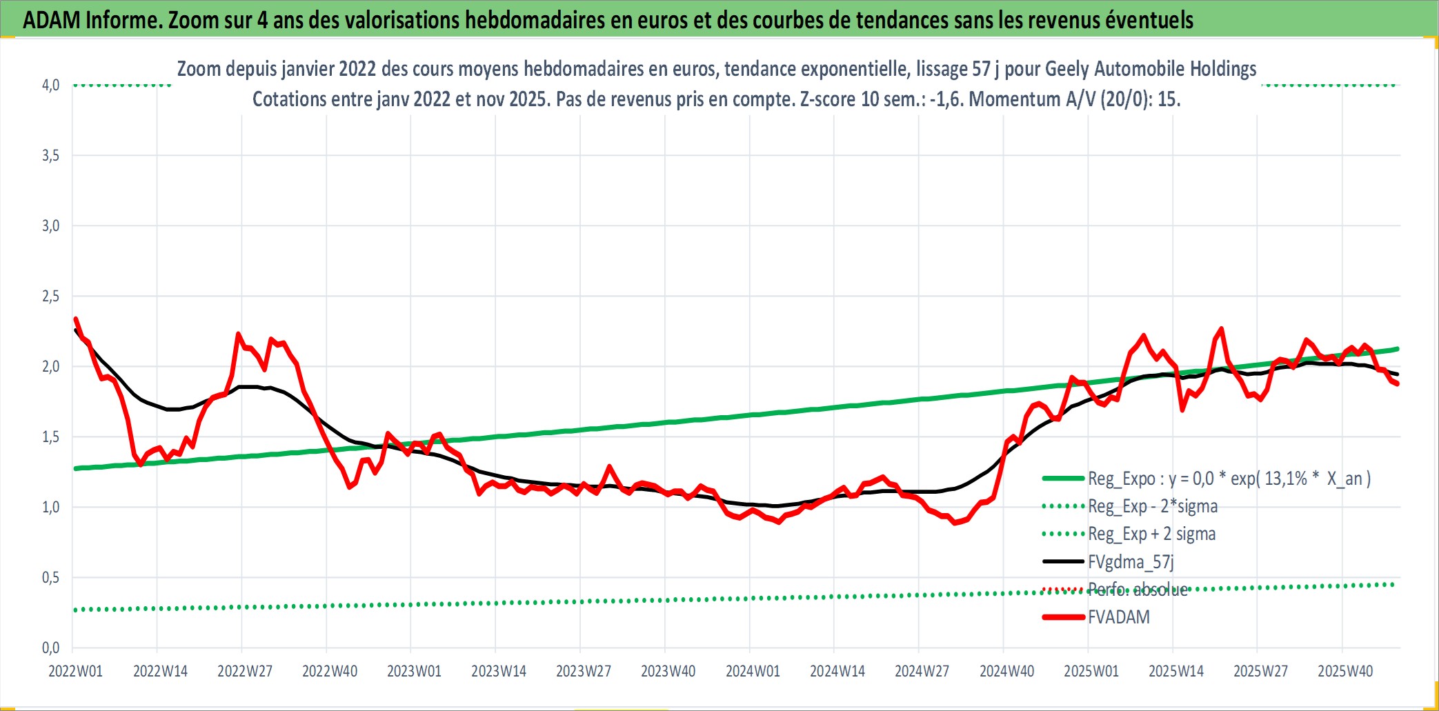 Site dédié aux investisseursPage dédiée sur site financeAnalyse des valorisations hebdomadaires de l'action Geely Automobile Holdings Ltd. Cet actif est cote en HKD. Les valorisations sont en contrevaleur EURO et couvrent les semaines 1997W01 a 2025W48. Les revenus de cet actif financier sont pris en compte depuis la semaine 2005W20. La note globale ESG de cet actif est estimee a 11.0 (apres rebasage entre 0 et 20).
