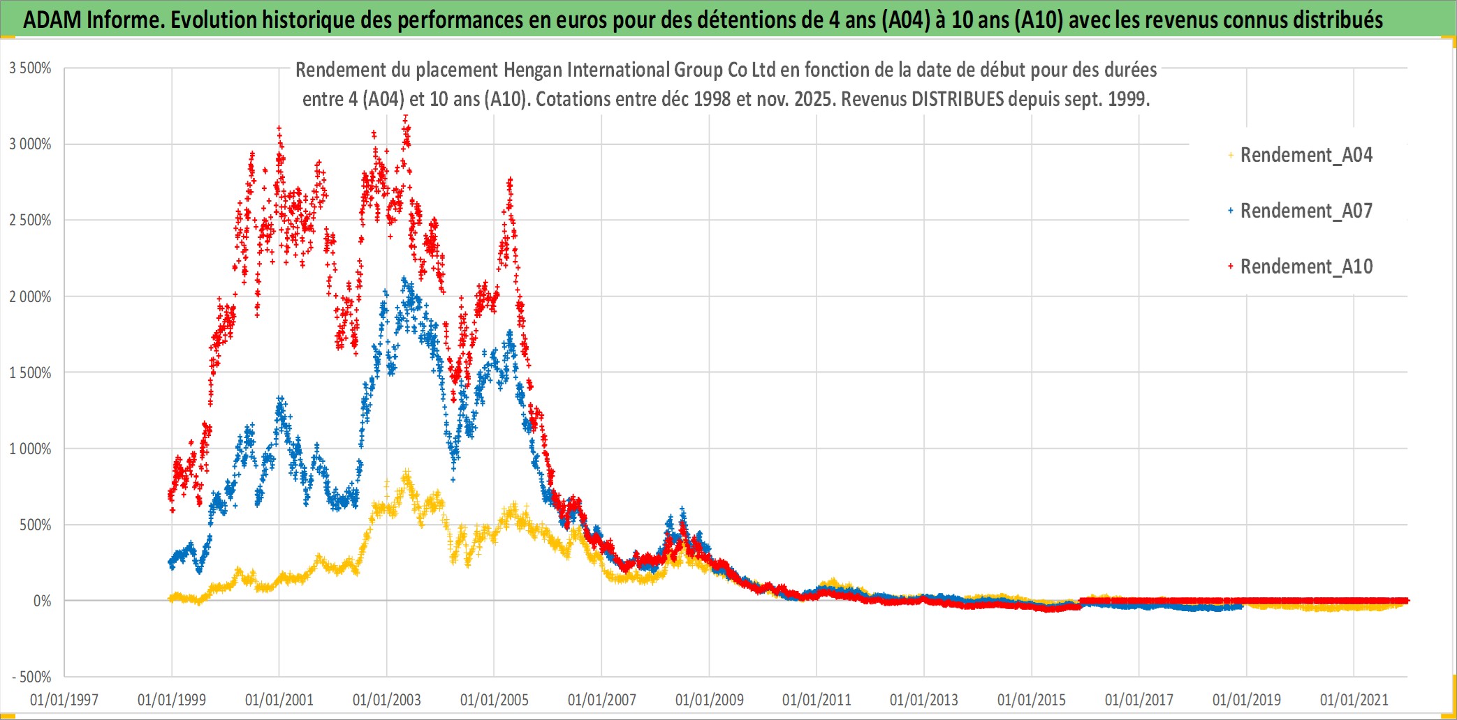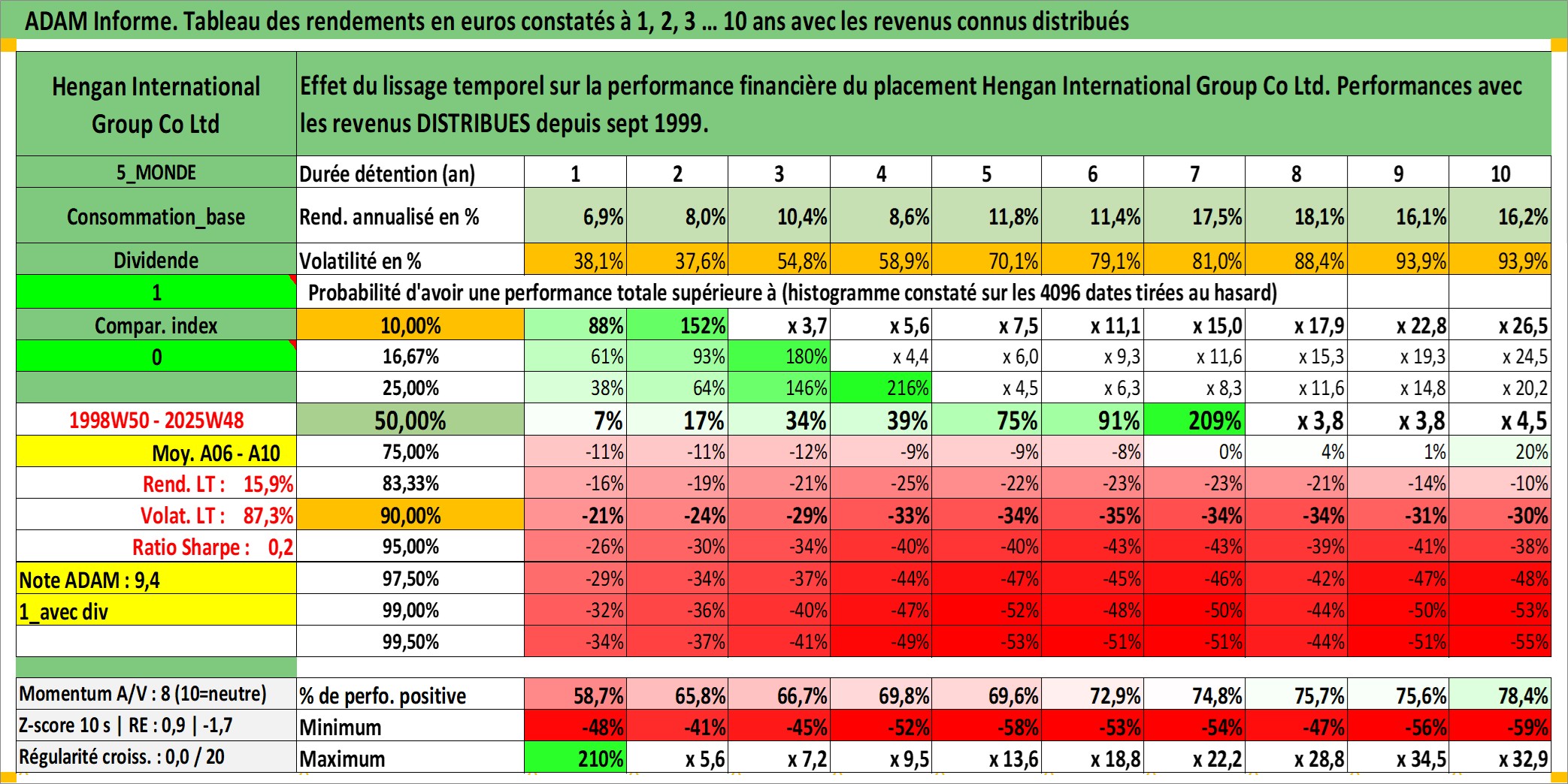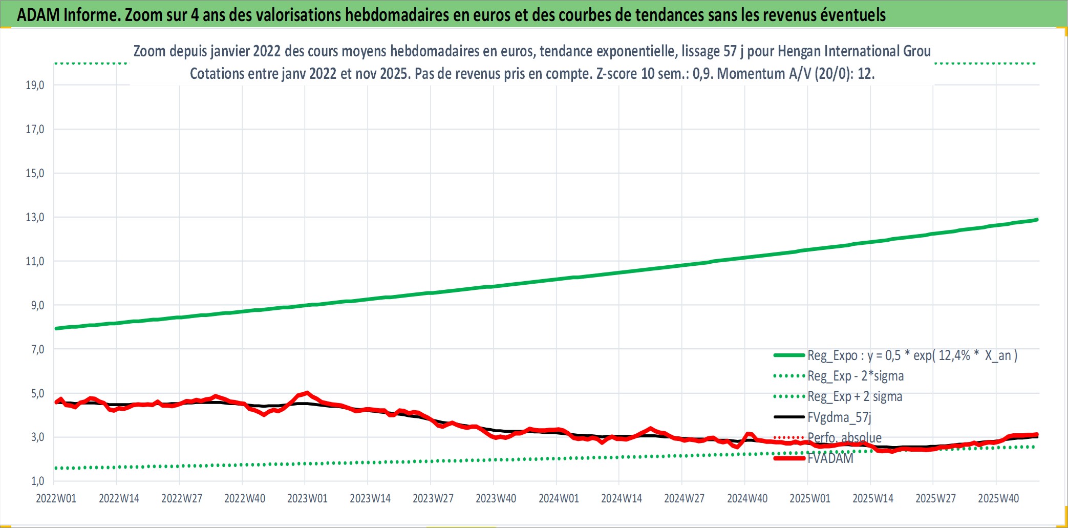 Site dédié aux investisseursPage dédiée sur site financeAnalyse des valorisations hebdomadaires de l'action Hengan International Group Co Ltd. Cet actif est cote en HKD. Les valorisations sont en contrevaleur EURO et couvrent les semaines 1998W50 a 2025W48. Les revenus de cet actif financier sont pris en compte depuis la semaine 1999W37. La note globale ESG de cet actif est estimee a 5.0 (apres rebasage entre 0 et 20).