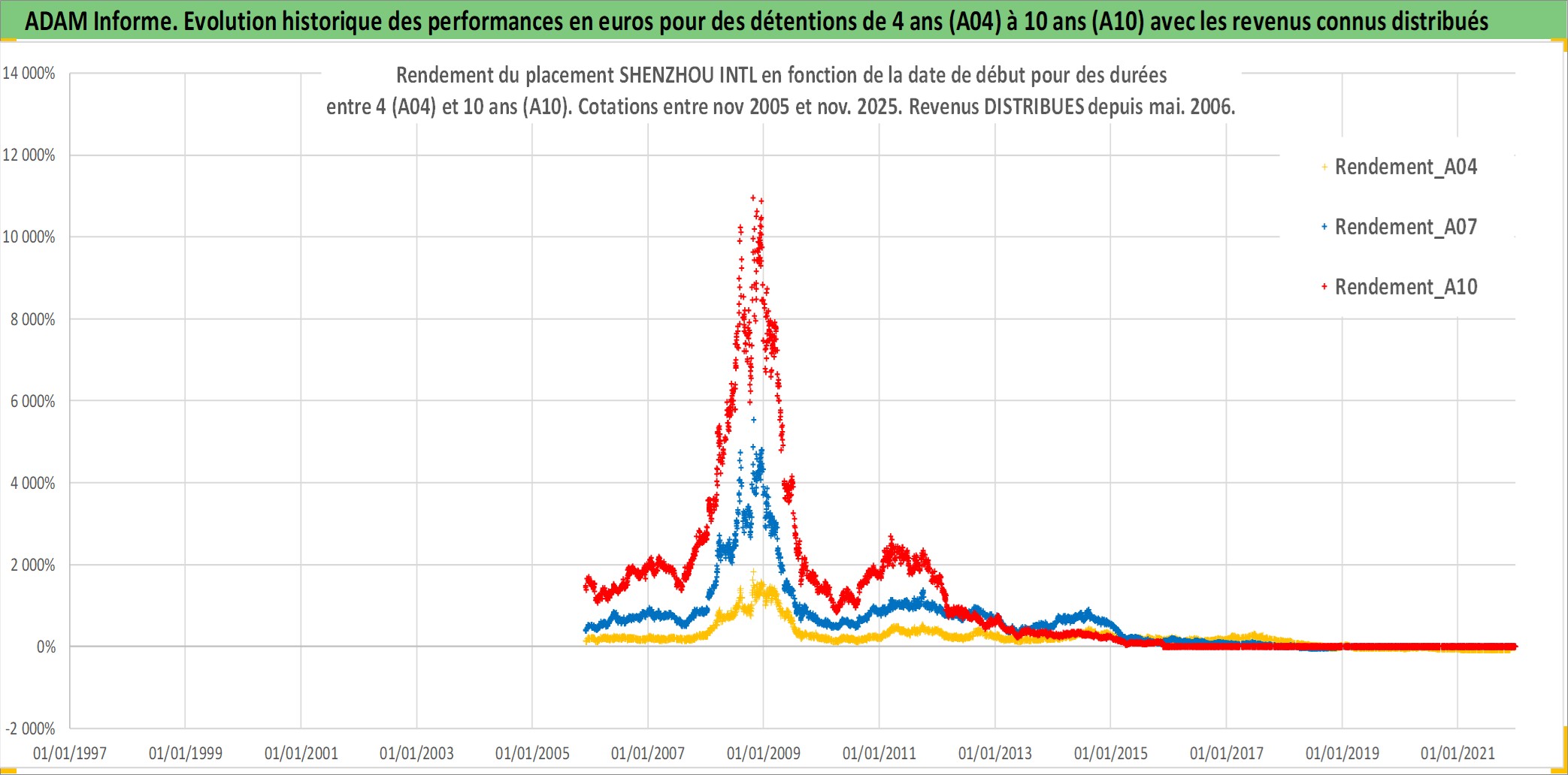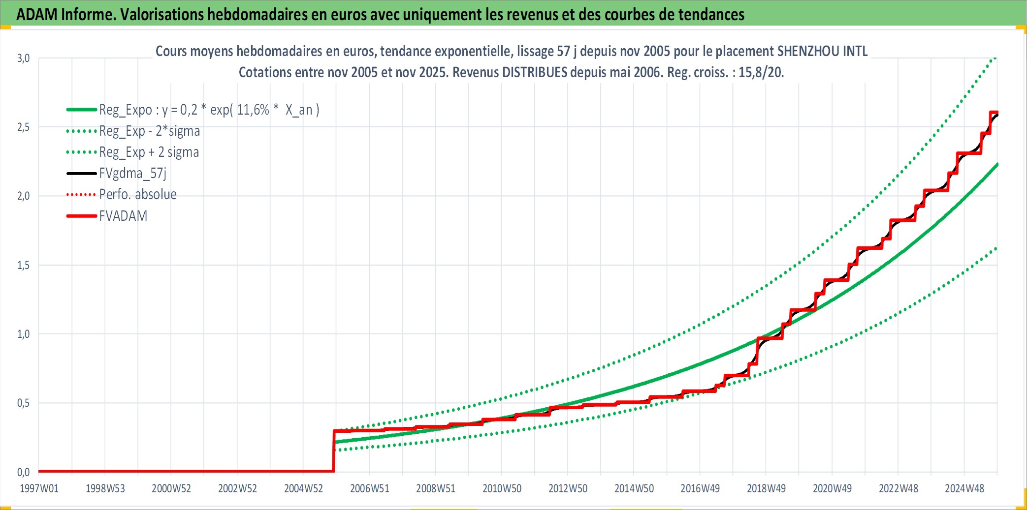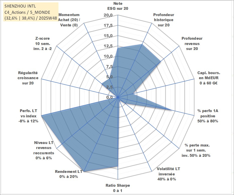Site dédié aux investisseursPage dédiée sur site financeAnalyse des valorisations hebdomadaires de l'action SHENZHOU INTL. Cet actif est cote en HKD. Les valorisations sont en contrevaleur EURO et couvrent les semaines 2005W47 a 2025W48. Les revenus de cet actif financier sont pris en compte depuis la semaine 2006W22. La note globale ESG de cet actif est estimee a 12.0 (apres rebasage entre 0 et 20).