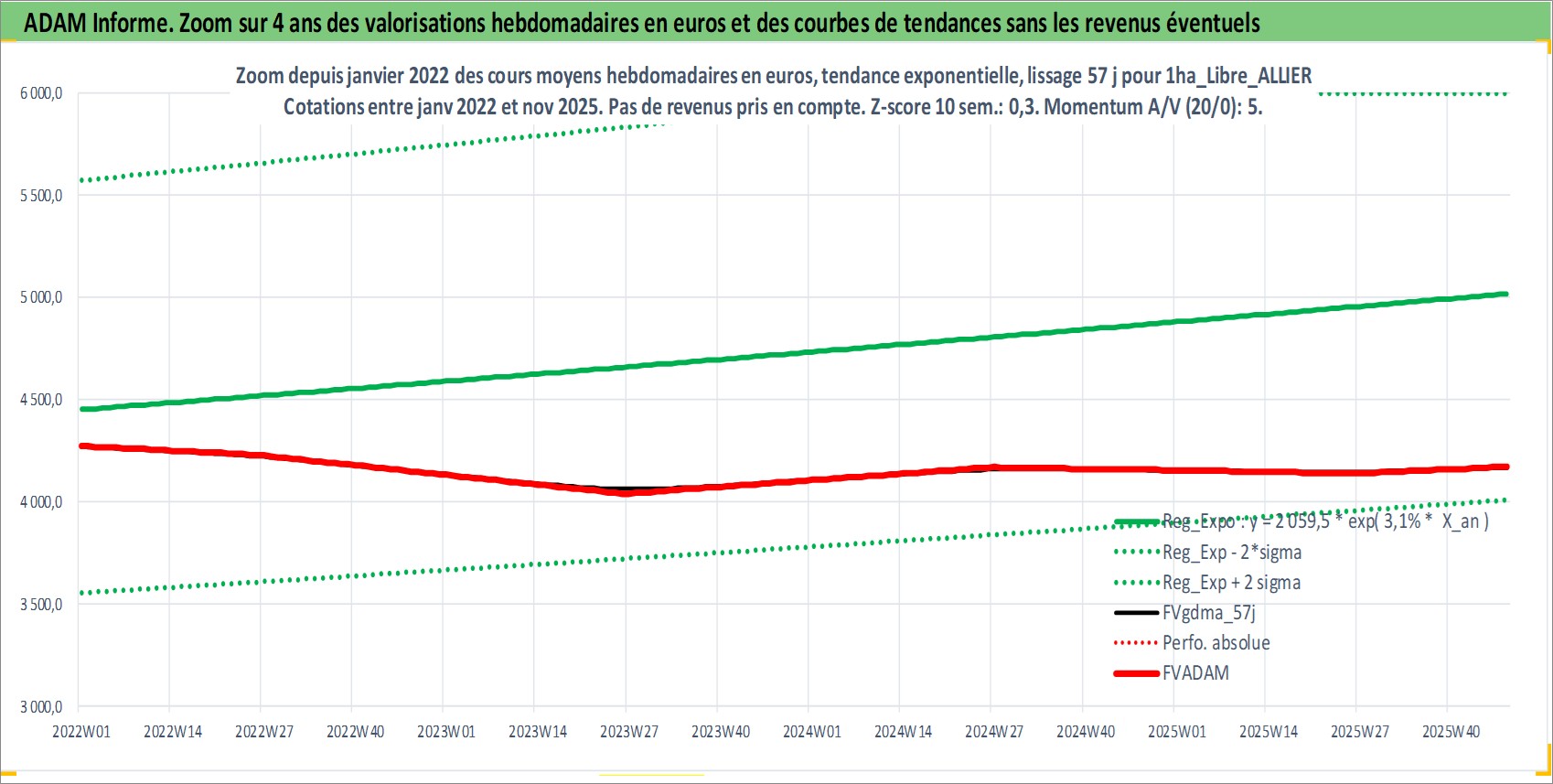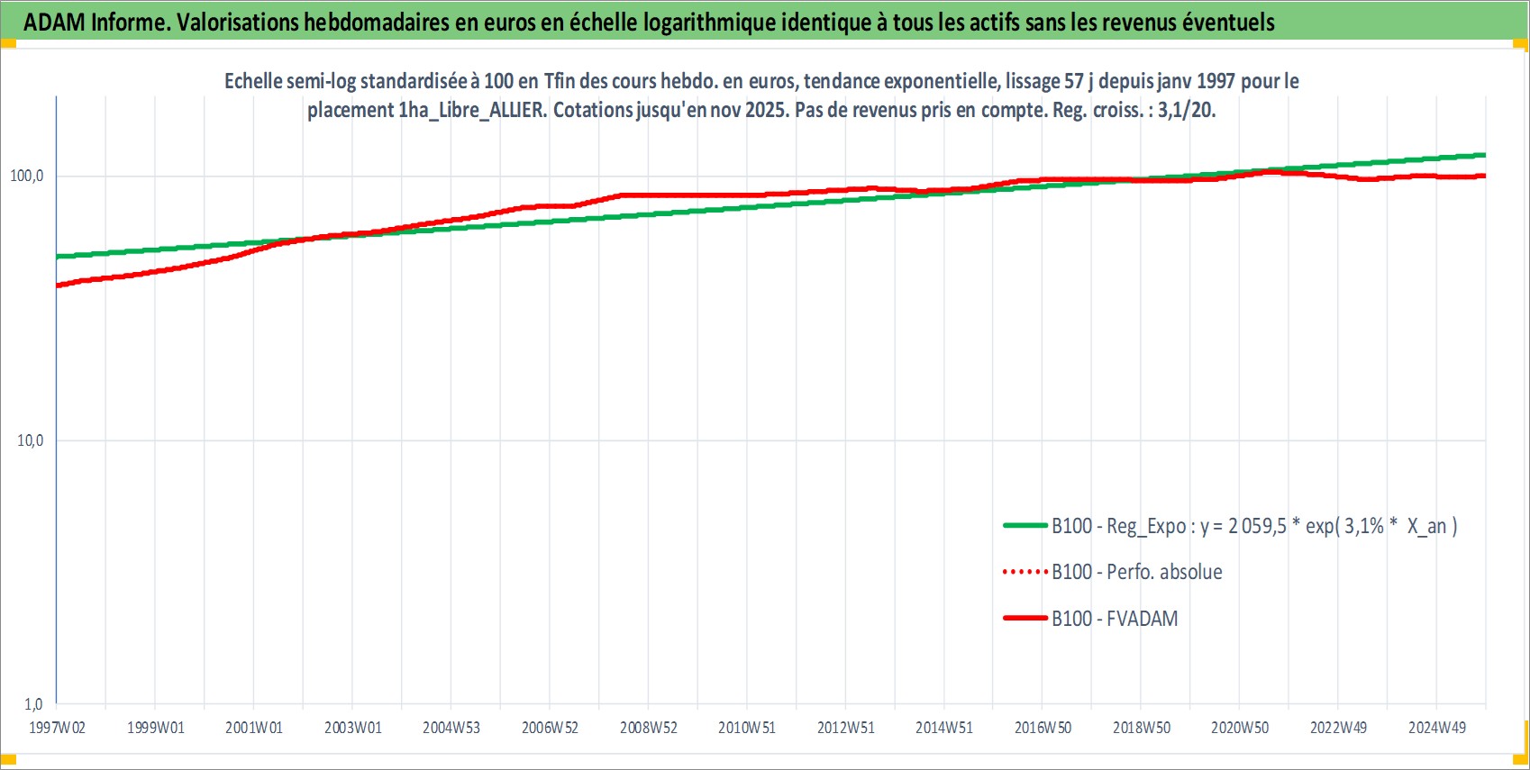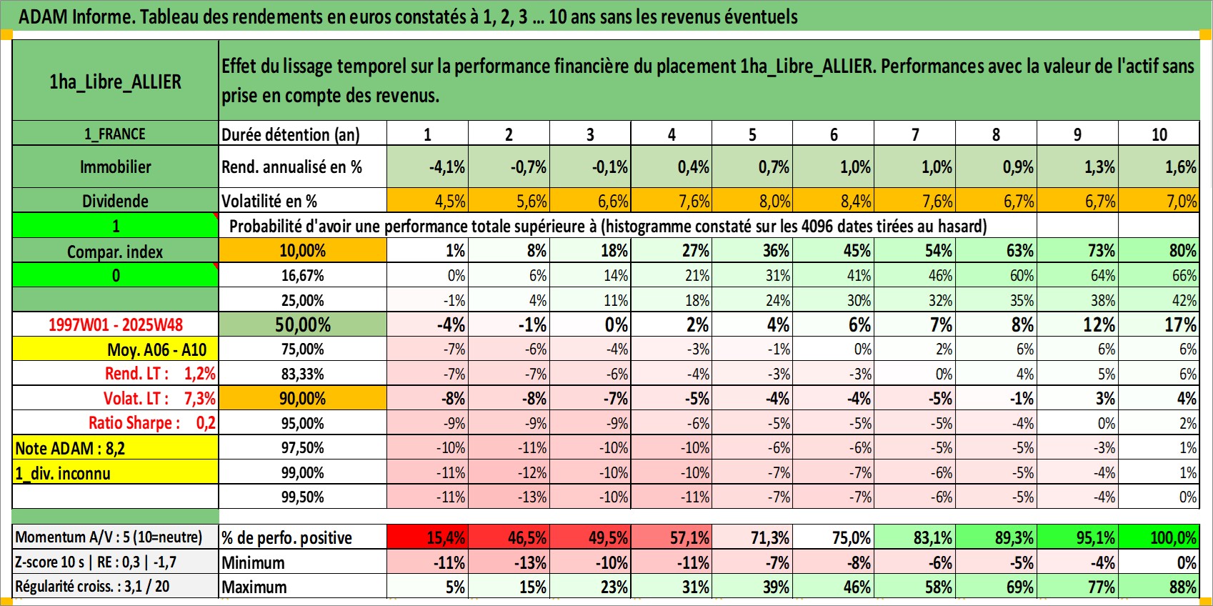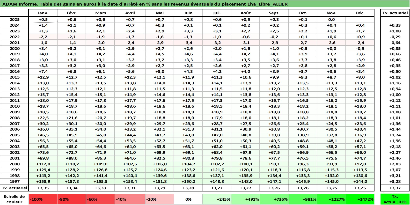Site dédié aux investisseursPage dédiée sur site financeAnalyse des valorisations hebdomadaires de l'actif 1ha_Libre_ALLIER. Cet actif est cote en EUR. Les valorisations couvrent les semaines 1997W01 a 2025W48. Les fermages de ce bien foncier sont pris egaux a 2,5% annuels de la valeur venale du bien.