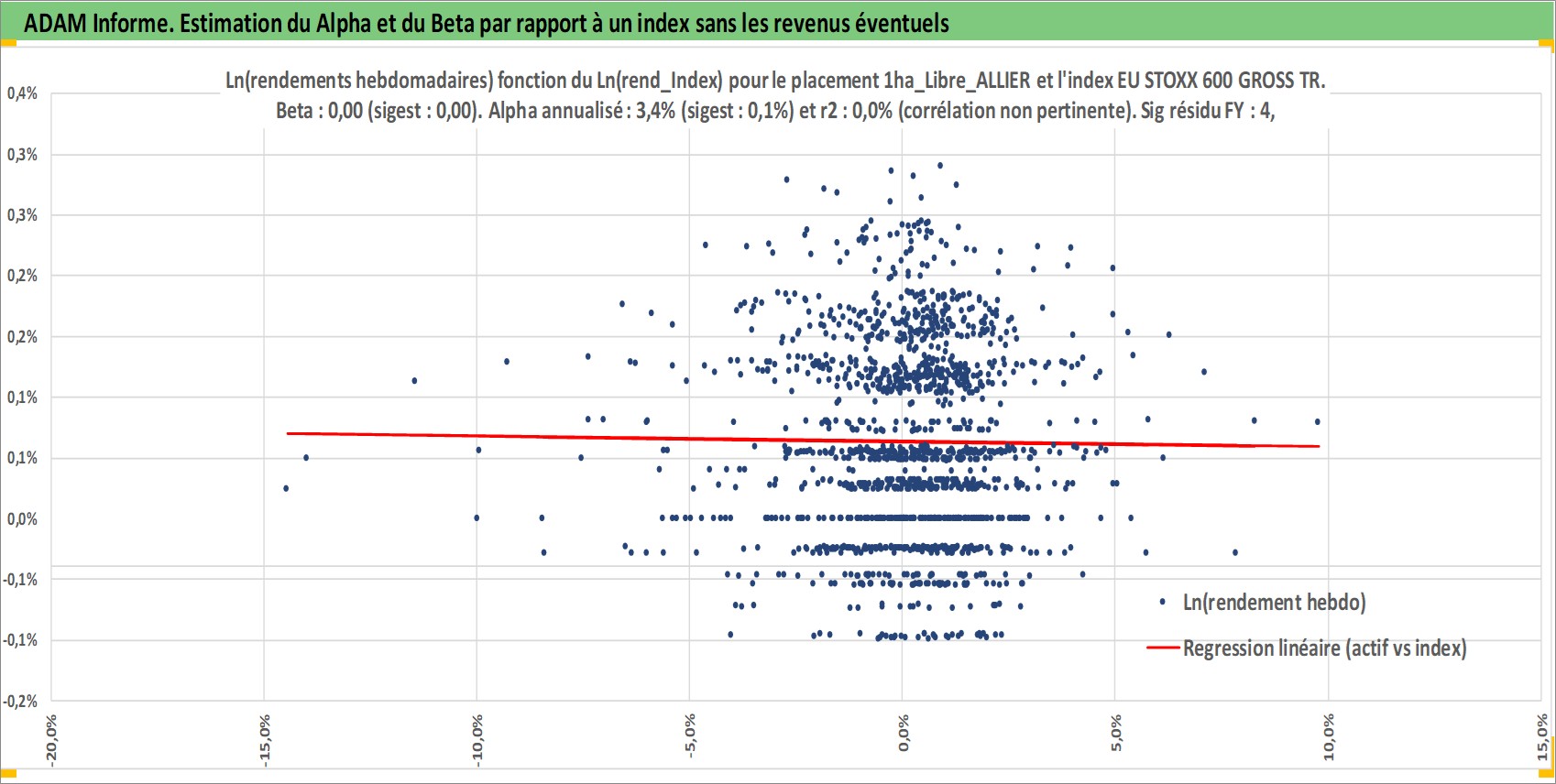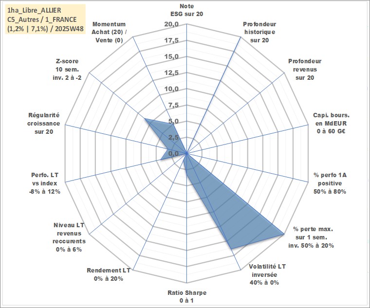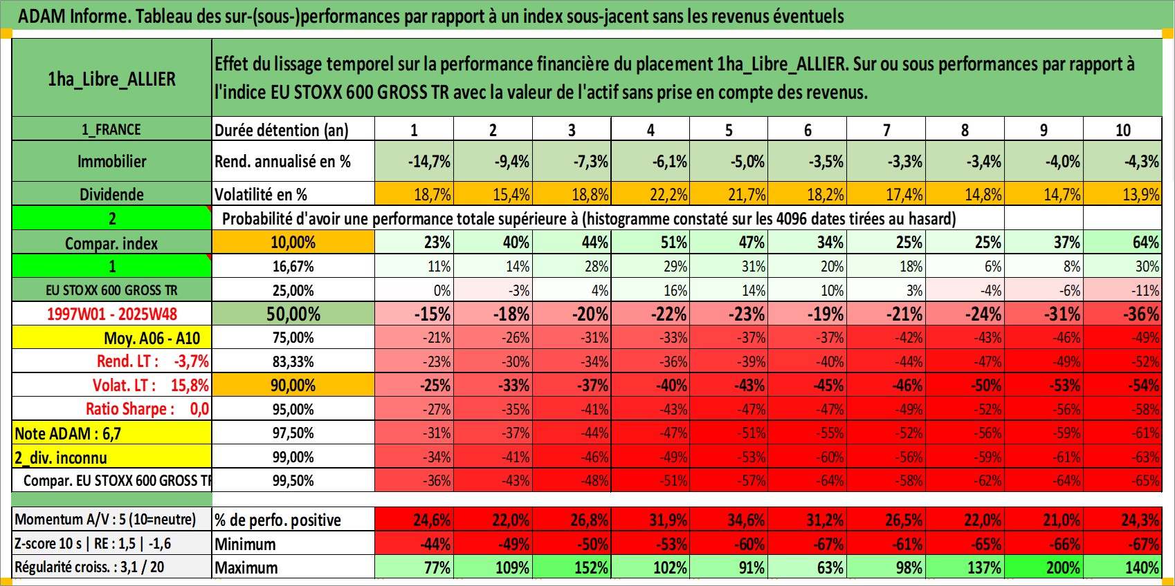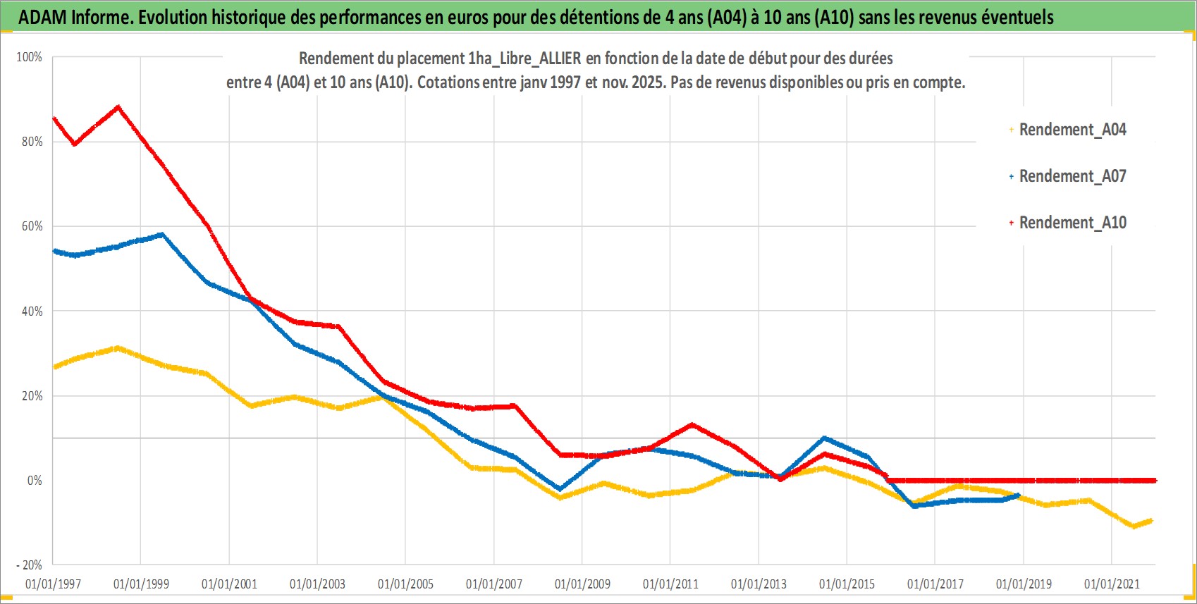 Site dédié aux investisseursPage dédiée sur site financeAnalyse des valorisations hebdomadaires de l'actif 1ha_Libre_ALLIER. Cet actif est cote en EUR. Les valorisations couvrent les semaines 1997W01 a 2025W48. Les fermages de ce bien foncier sont pris egaux a 2,5% annuels de la valeur venale du bien.