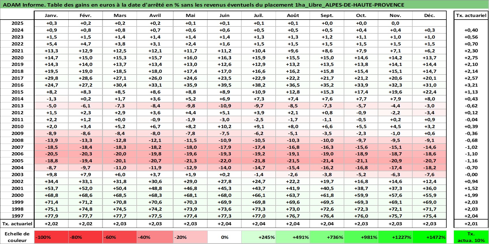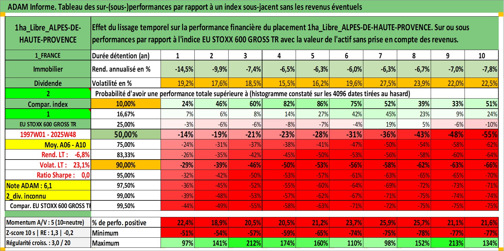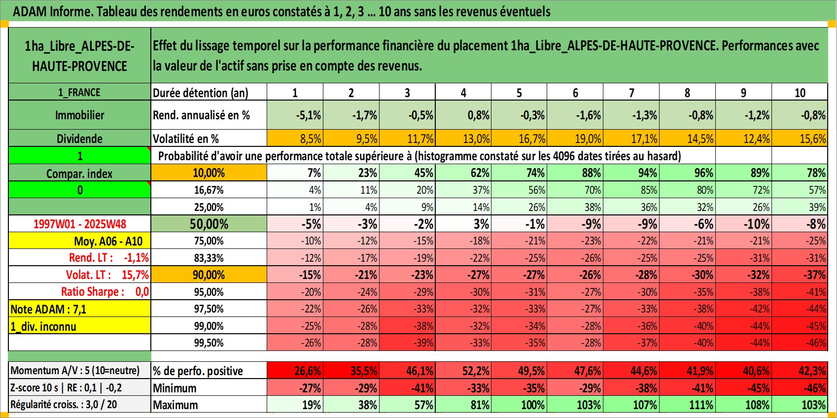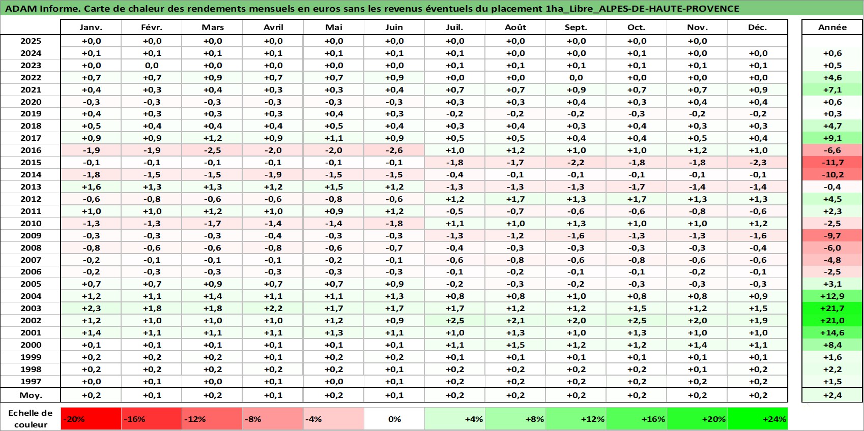 Site dédié aux investisseursPage dédiée sur site financeAnalyse des valorisations hebdomadaires de l'actif 1ha_Libre_ALPES-DE-HAUTE-PROVENCE. Cet actif est cote en EUR. Les valorisations couvrent les semaines 1997W01 a 2025W48. Les fermages de ce bien foncier sont pris egaux a 2,5% annuels de la valeur venale du bien.