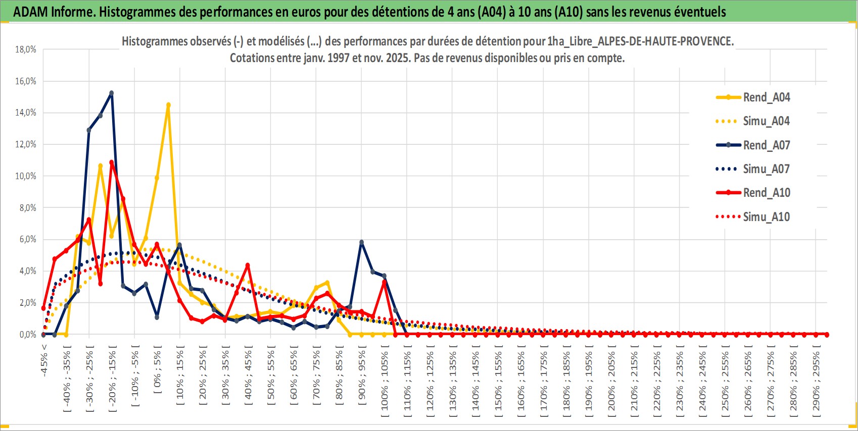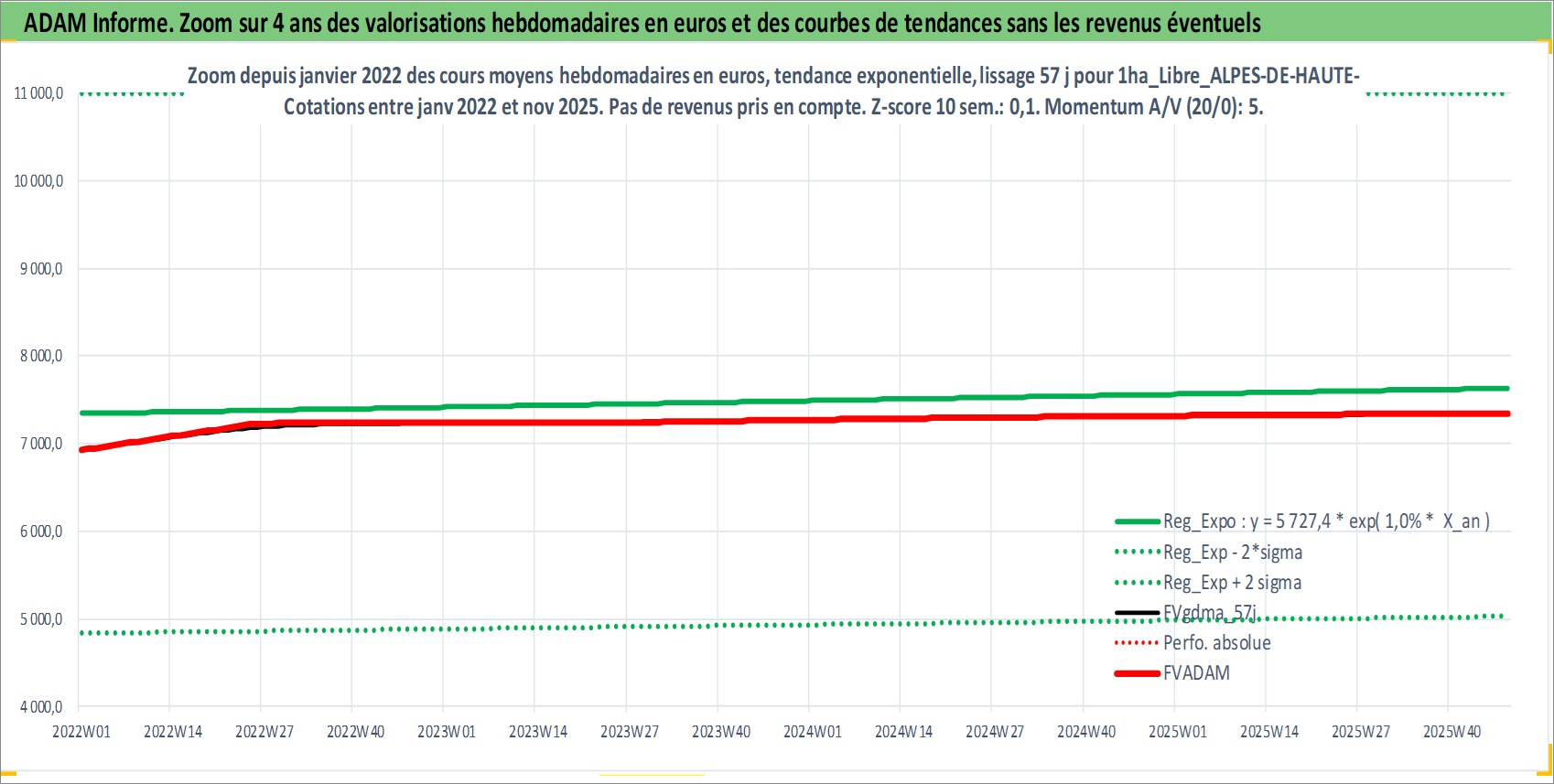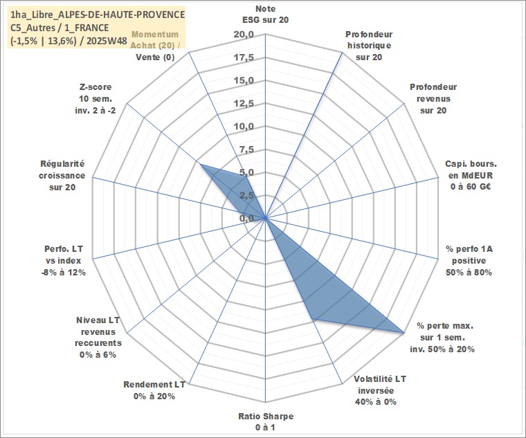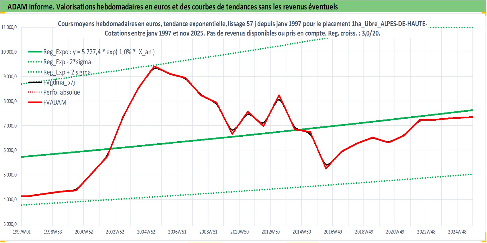 Site dédié aux investisseursPage dédiée sur site financeAnalyse des valorisations hebdomadaires de l'actif 1ha_Libre_ALPES-DE-HAUTE-PROVENCE. Cet actif est cote en EUR. Les valorisations couvrent les semaines 1997W01 a 2025W48. Les fermages de ce bien foncier sont pris egaux a 2,5% annuels de la valeur venale du bien.