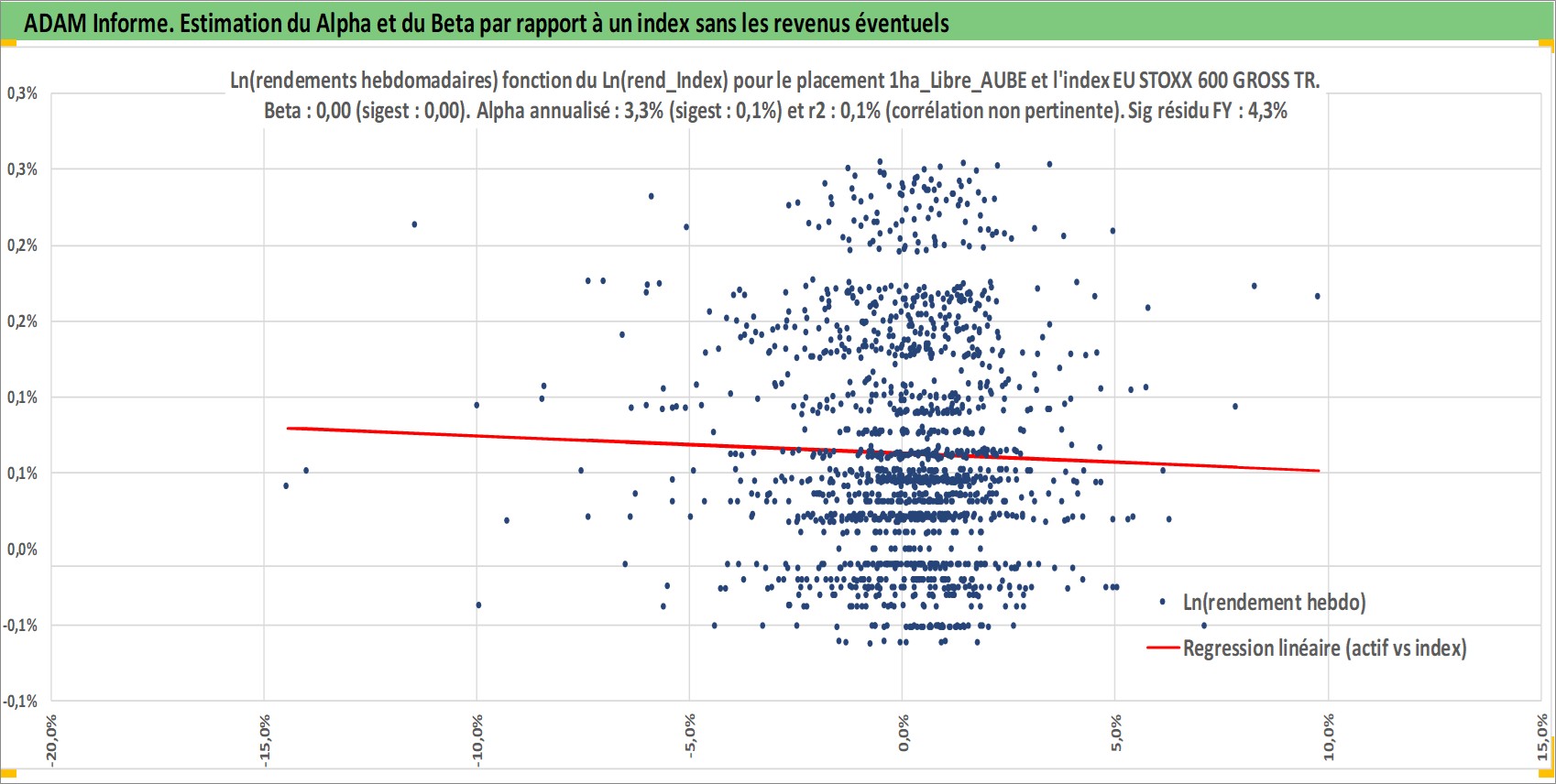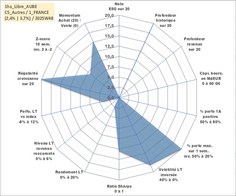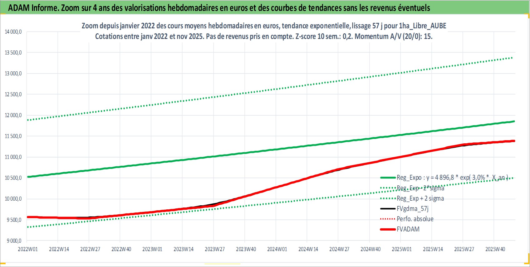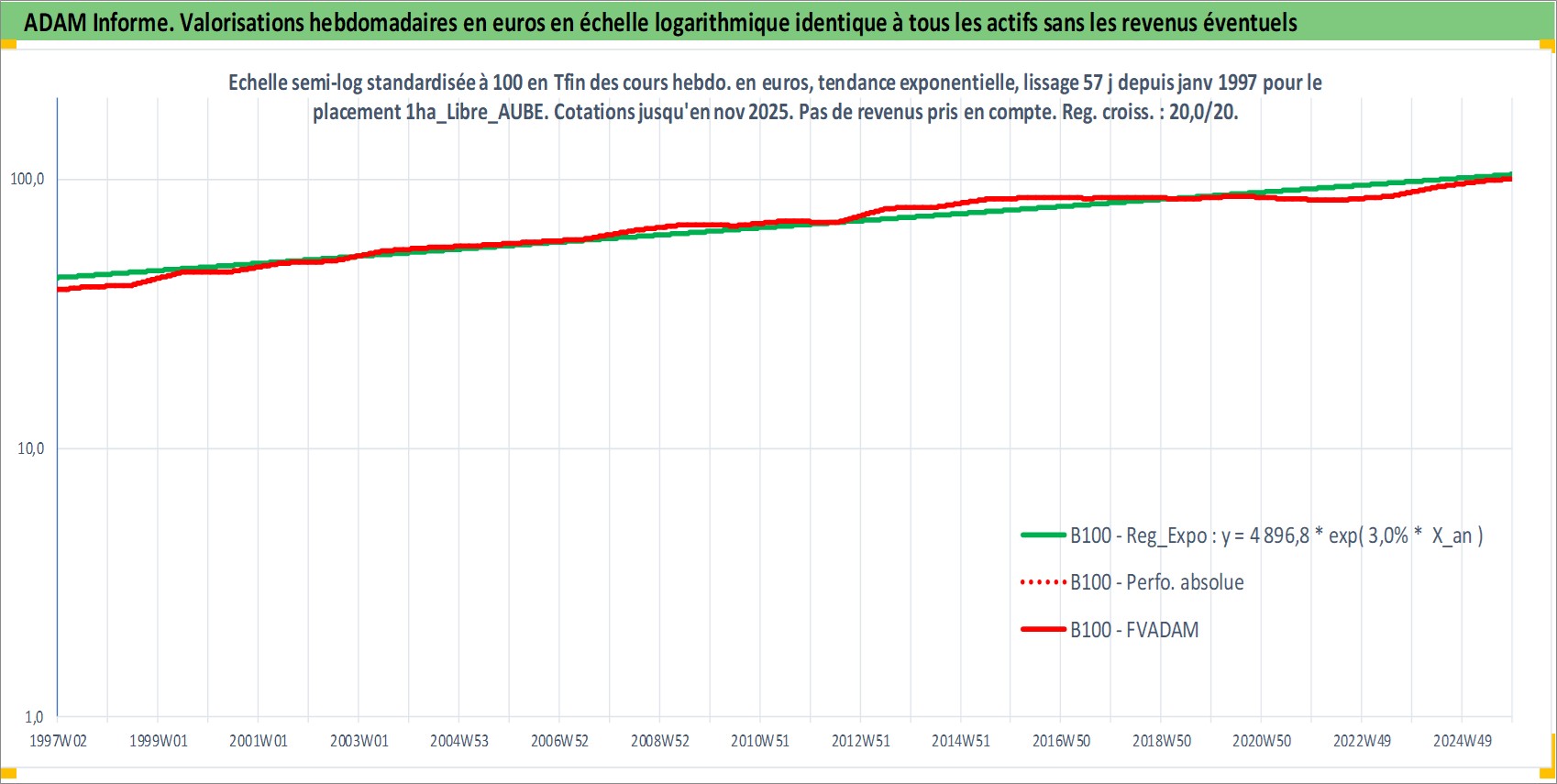 Site dédié aux investisseursPage dédiée sur site financeAnalyse des valorisations hebdomadaires de l'actif 1ha_Libre_AUBE. Cet actif est cote en EUR. Les valorisations couvrent les semaines 1997W01 a 2025W48. Les fermages de ce bien foncier sont pris egaux a 2,5% annuels de la valeur venale du bien.