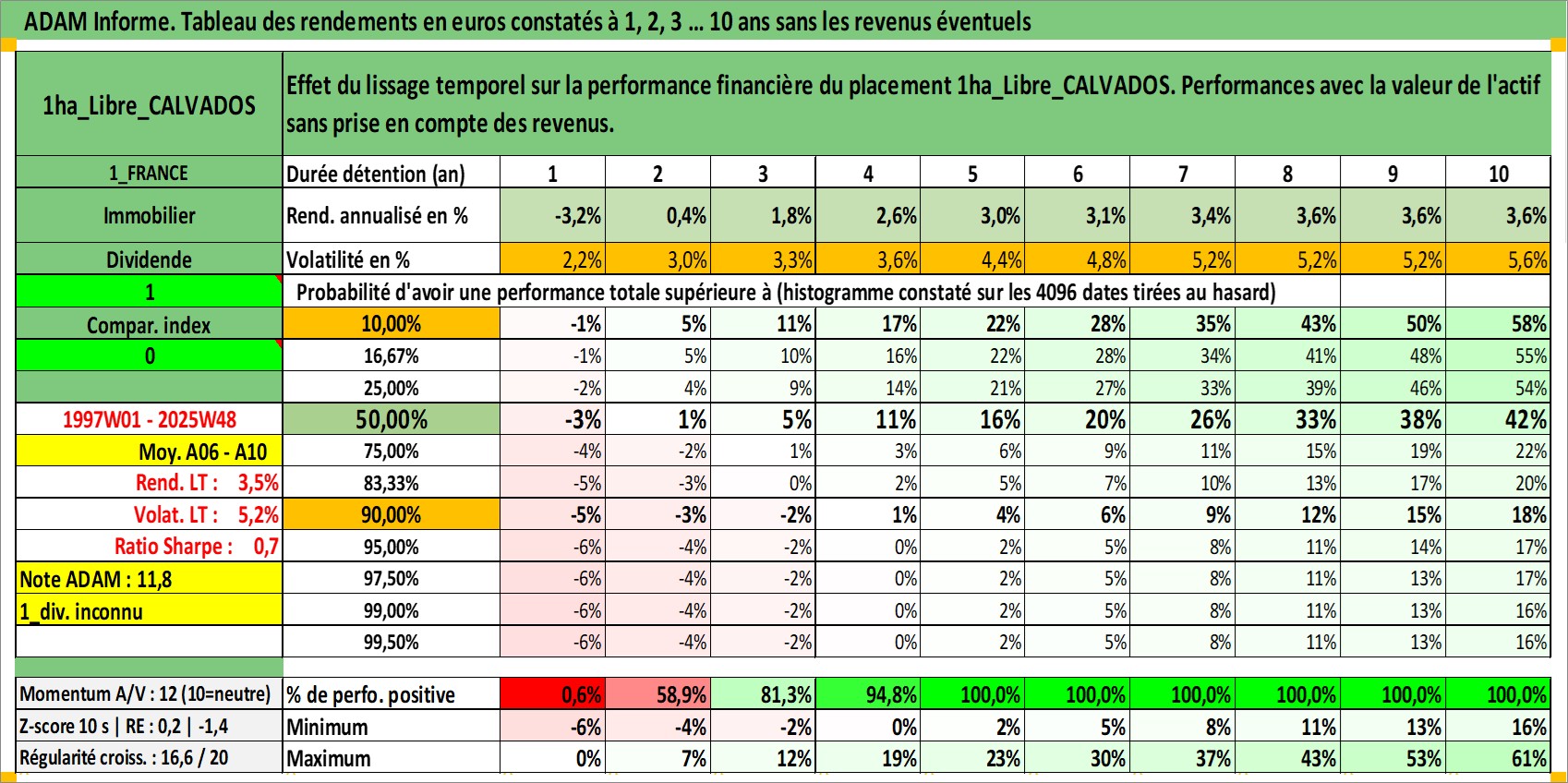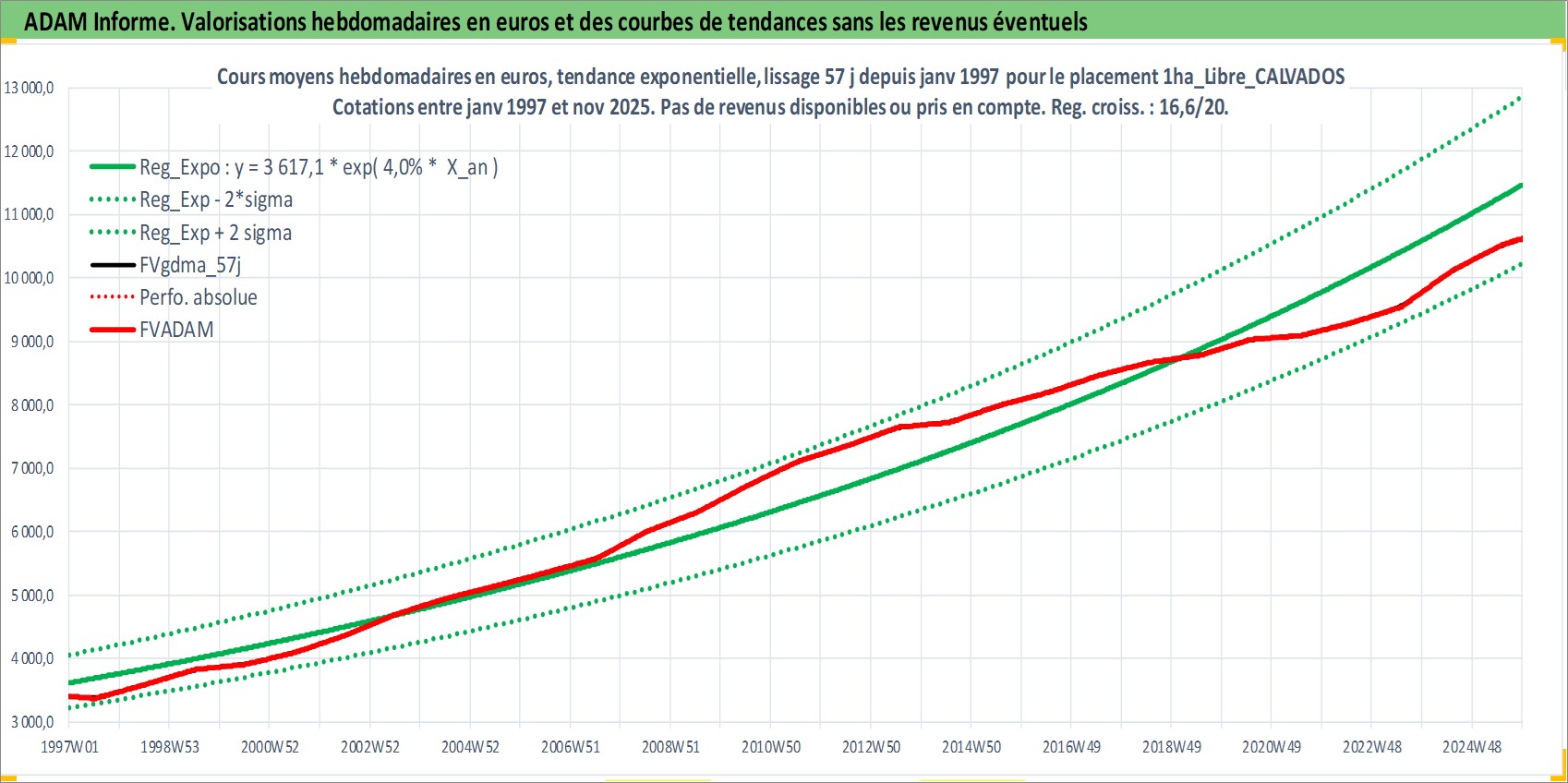 Site dédié aux investisseursPage dédiée sur site financeAnalyse des valorisations hebdomadaires de l'actif 1ha_Libre_CALVADOS. Cet actif est cote en EUR. Les valorisations couvrent les semaines 1997W01 a 2025W48. Les fermages de ce bien foncier sont pris egaux a 2,5% annuels de la valeur venale du bien.