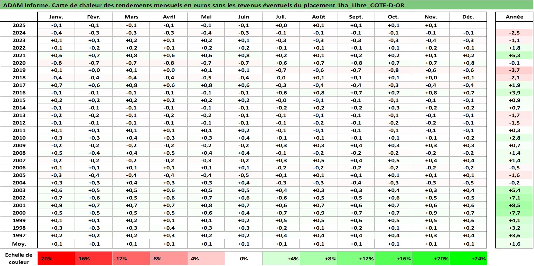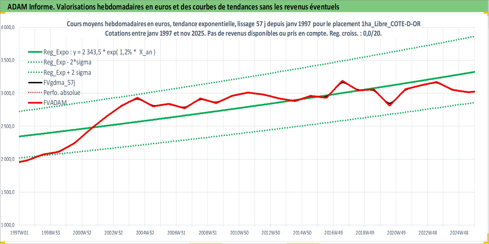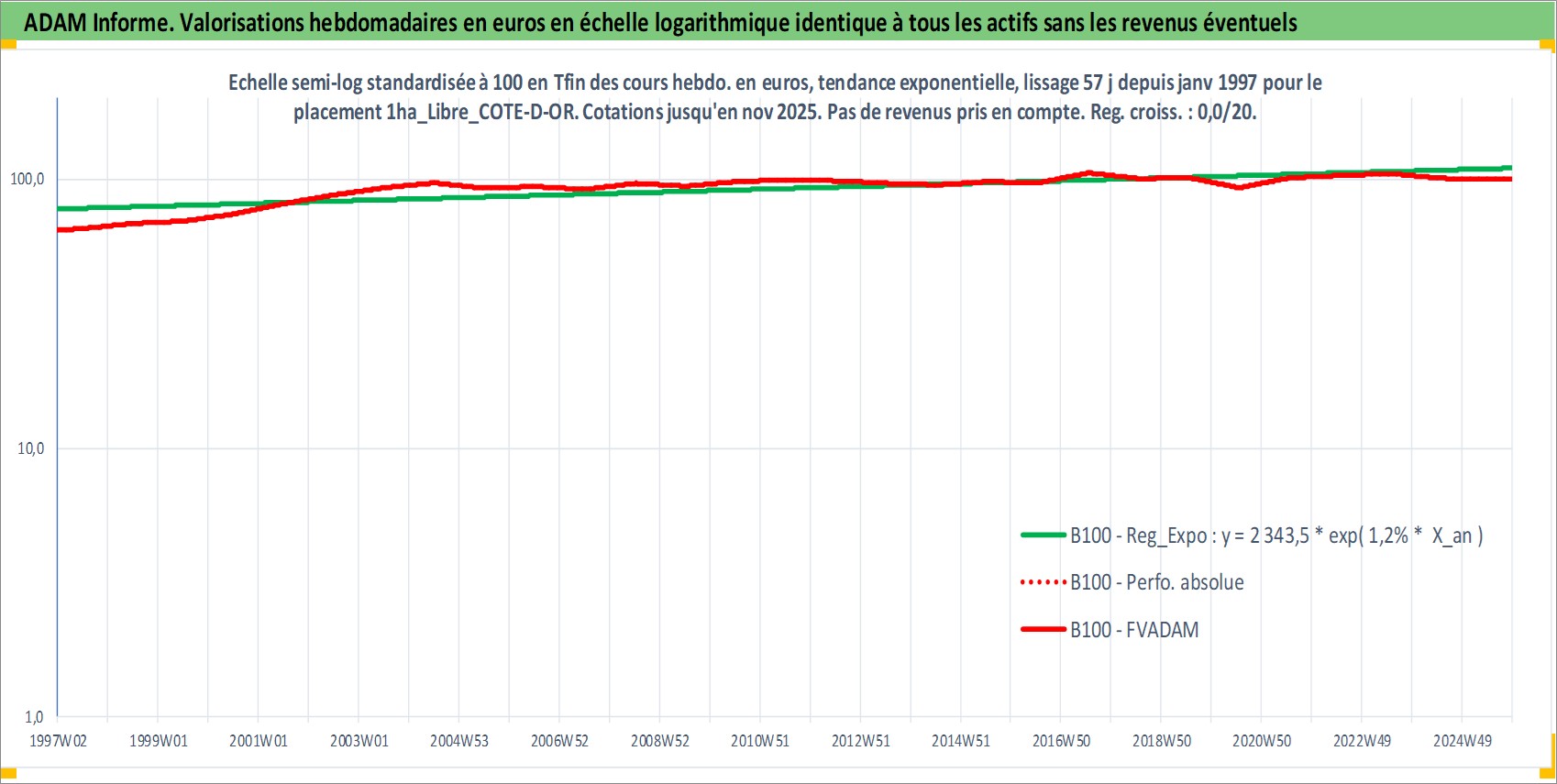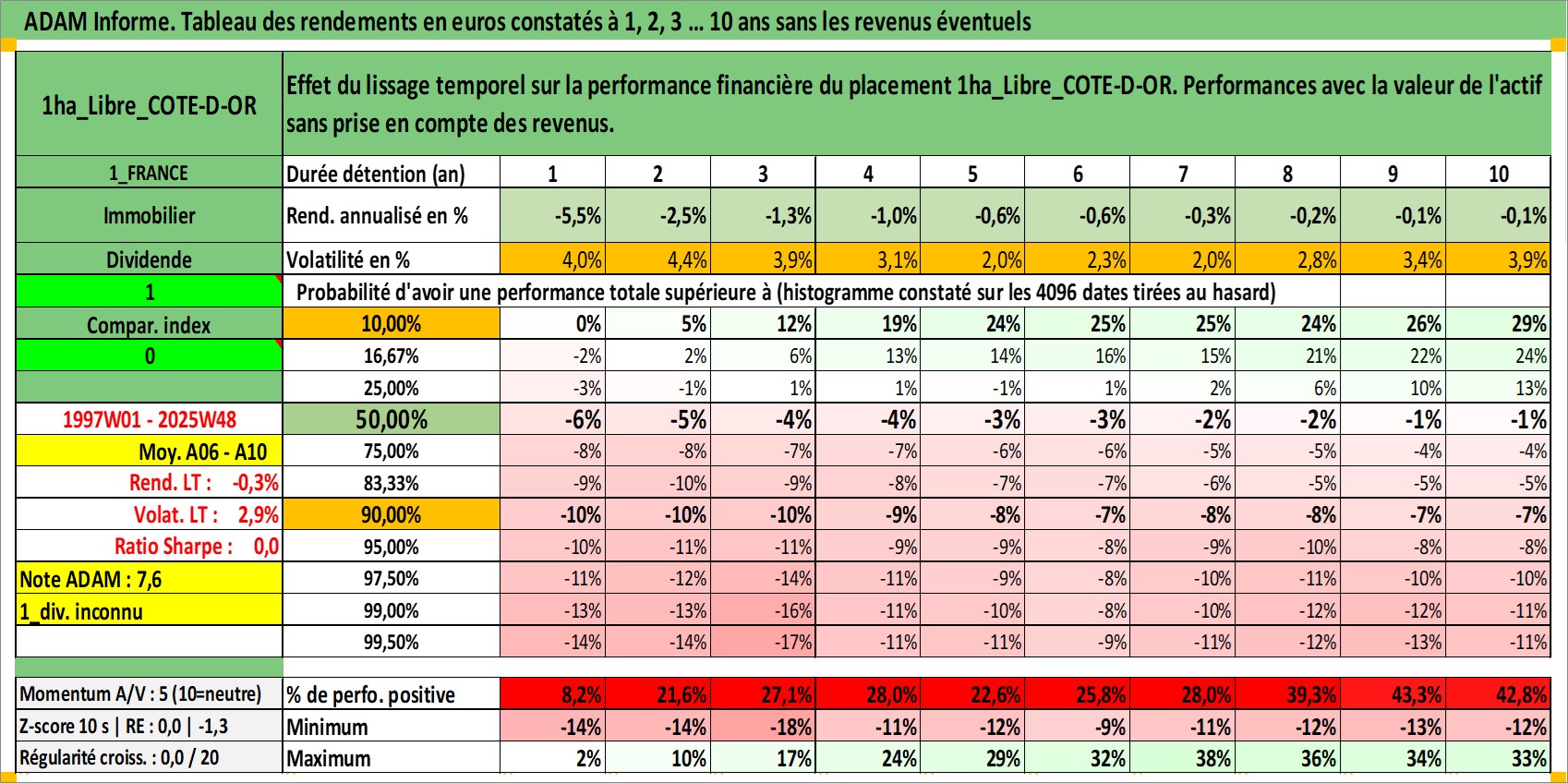 Site dédié aux investisseursPage dédiée sur site financeAnalyse des valorisations hebdomadaires de l'actif 1ha_Libre_COTE-D-OR. Cet actif est cote en EUR. Les valorisations couvrent les semaines 1997W01 a 2025W48. Les fermages de ce bien foncier sont pris egaux a 2,5% annuels de la valeur venale du bien.