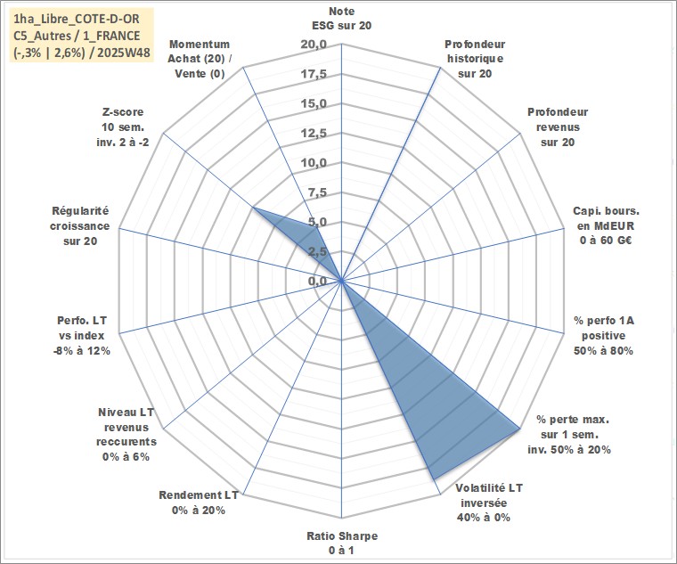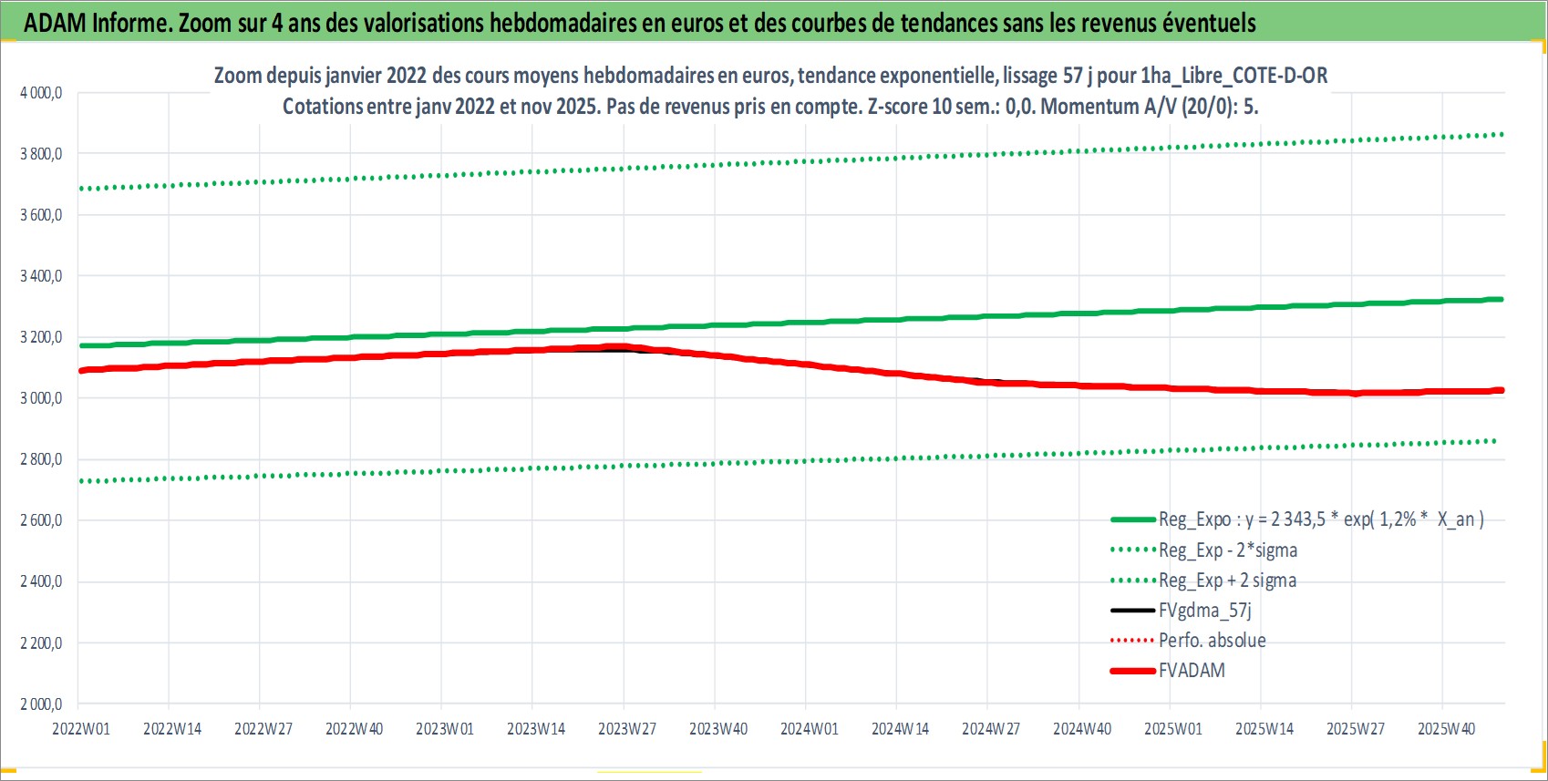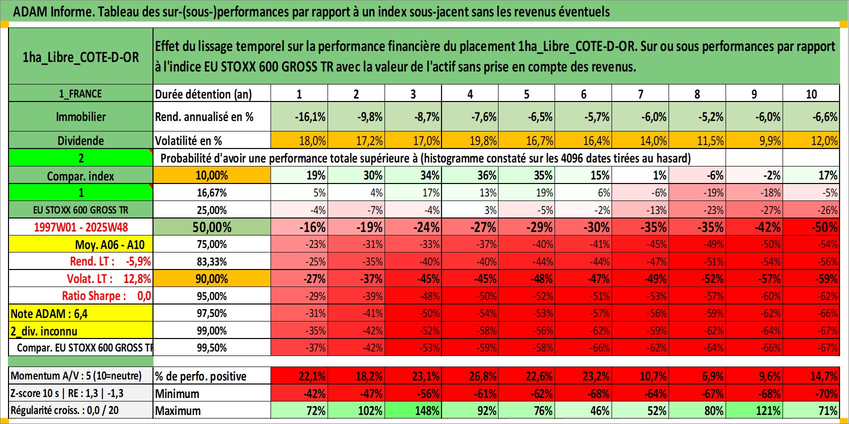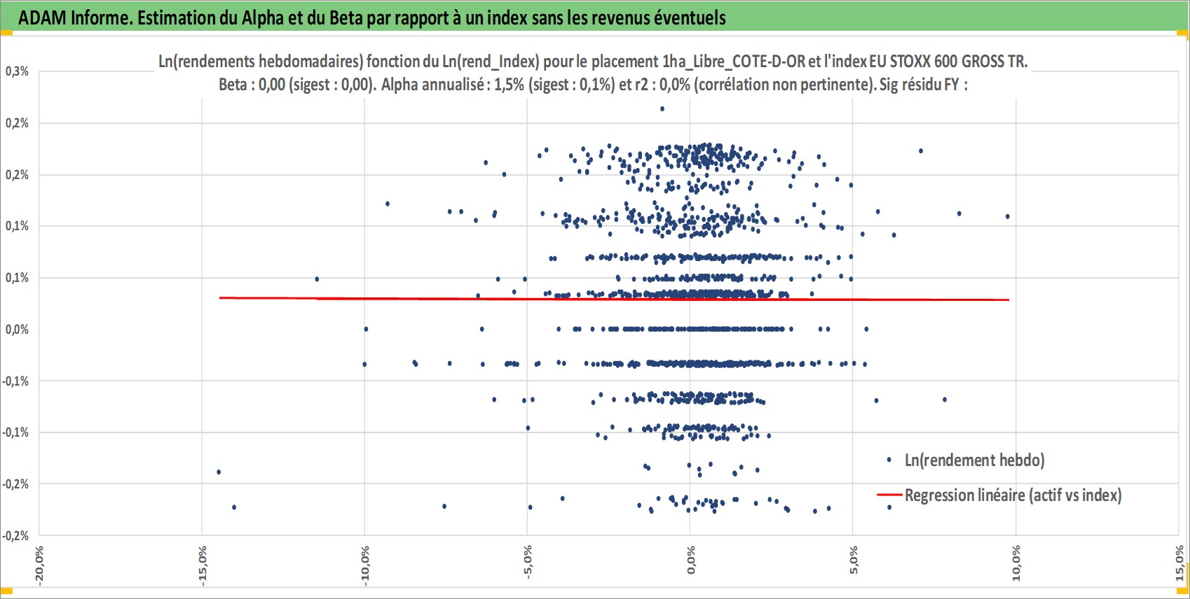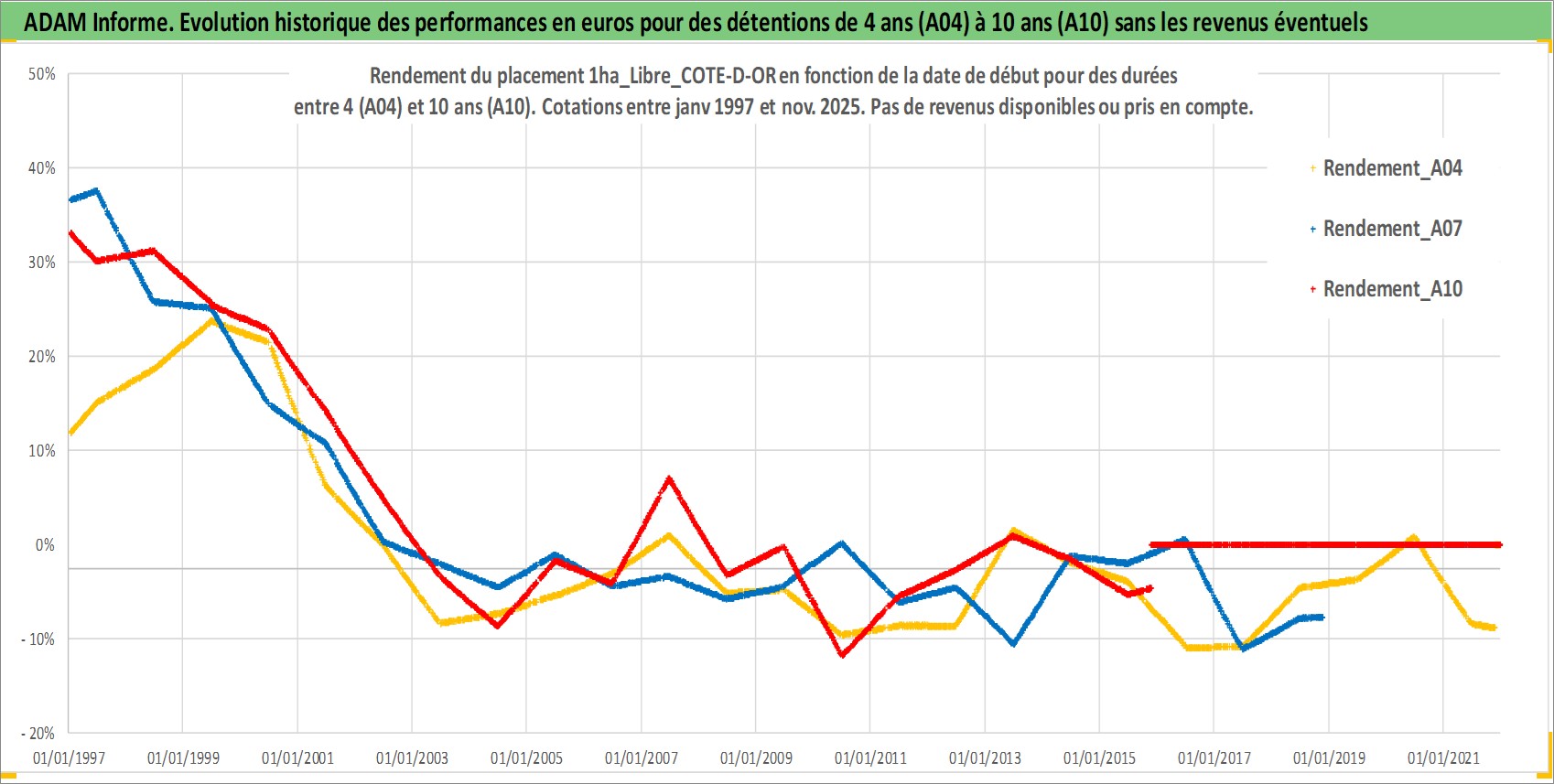 Site dédié aux investisseursPage dédiée sur site financeAnalyse des valorisations hebdomadaires de l'actif 1ha_Libre_COTE-D-OR. Cet actif est cote en EUR. Les valorisations couvrent les semaines 1997W01 a 2025W48. Les fermages de ce bien foncier sont pris egaux a 2,5% annuels de la valeur venale du bien.