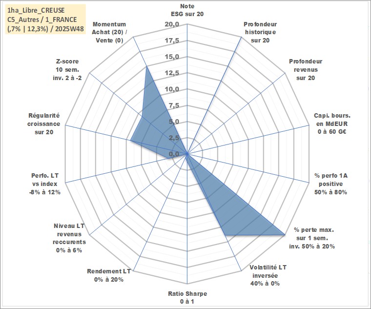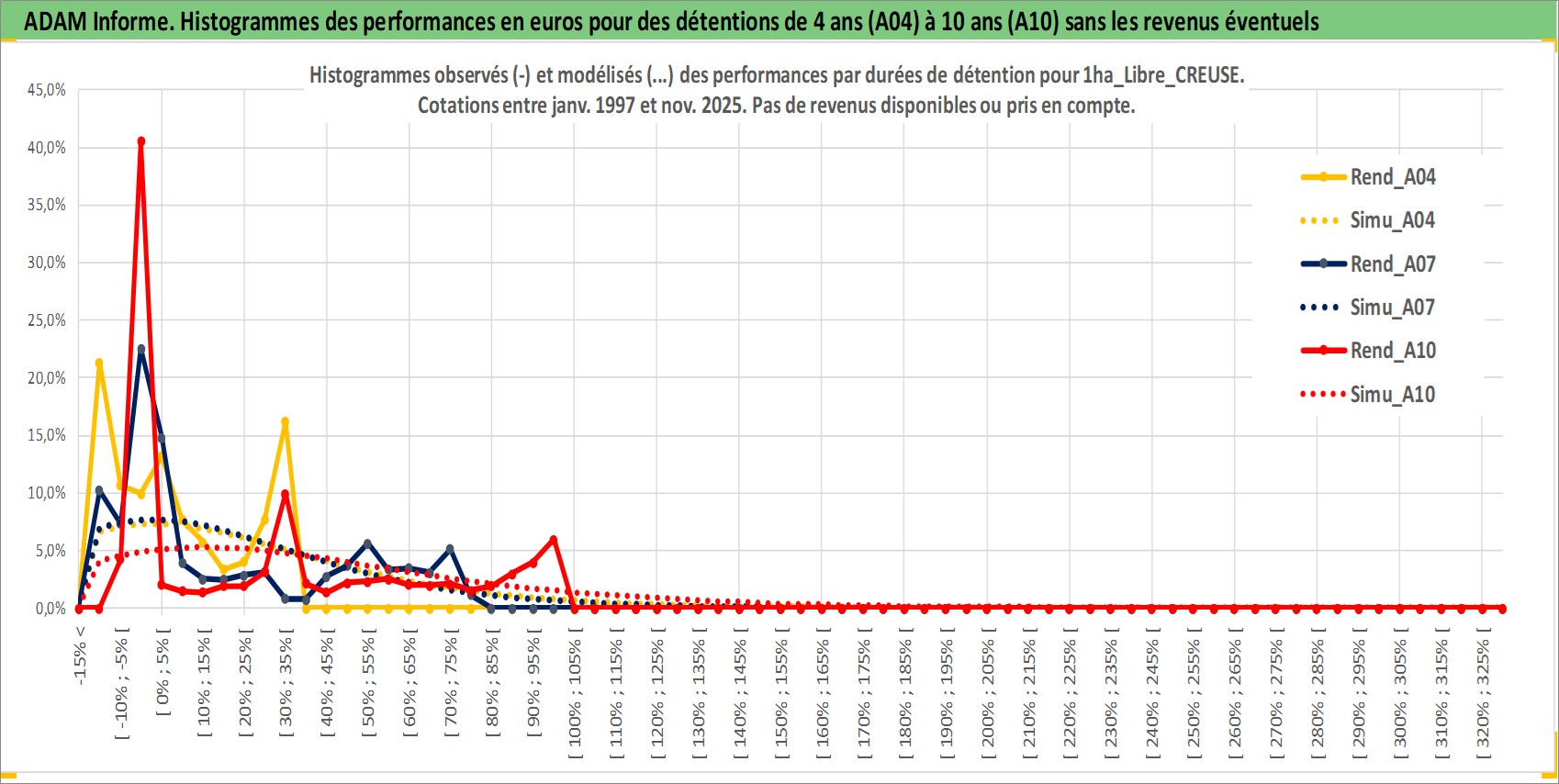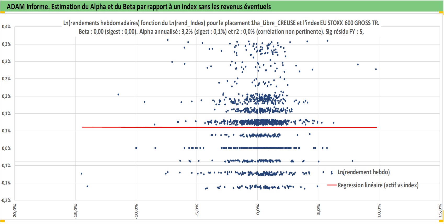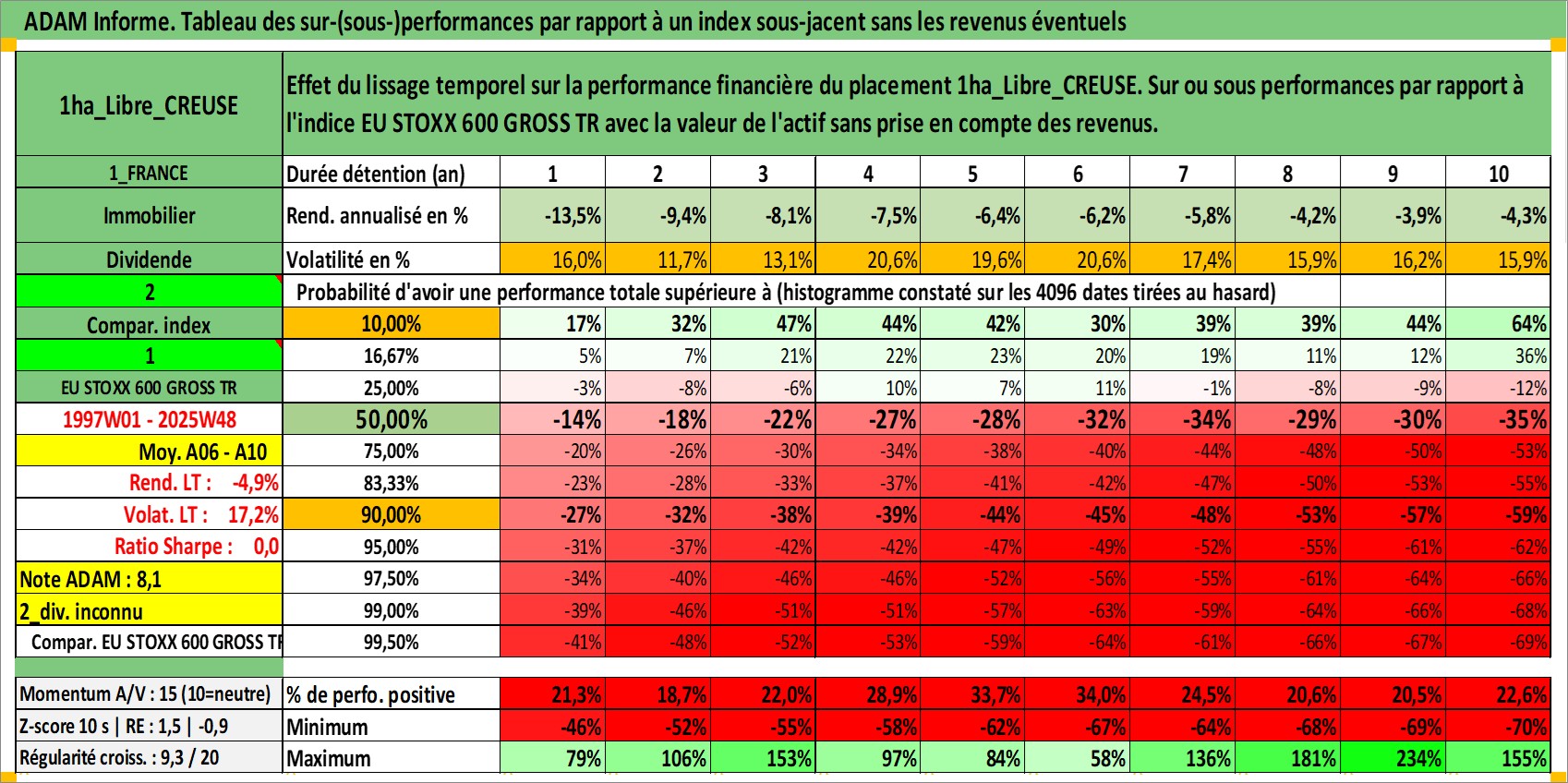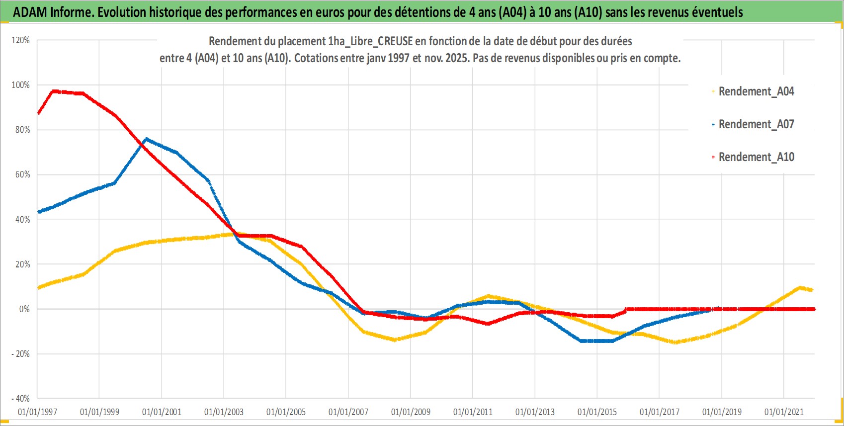 Site dédié aux investisseursPage dédiée sur site financeAnalyse des valorisations hebdomadaires de l'actif 1ha_Libre_CREUSE. Cet actif est cote en EUR. Les valorisations couvrent les semaines 1997W01 a 2025W48. Les fermages de ce bien foncier sont pris egaux a 2,5% annuels de la valeur venale du bien.