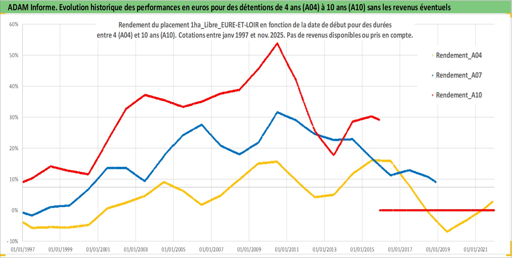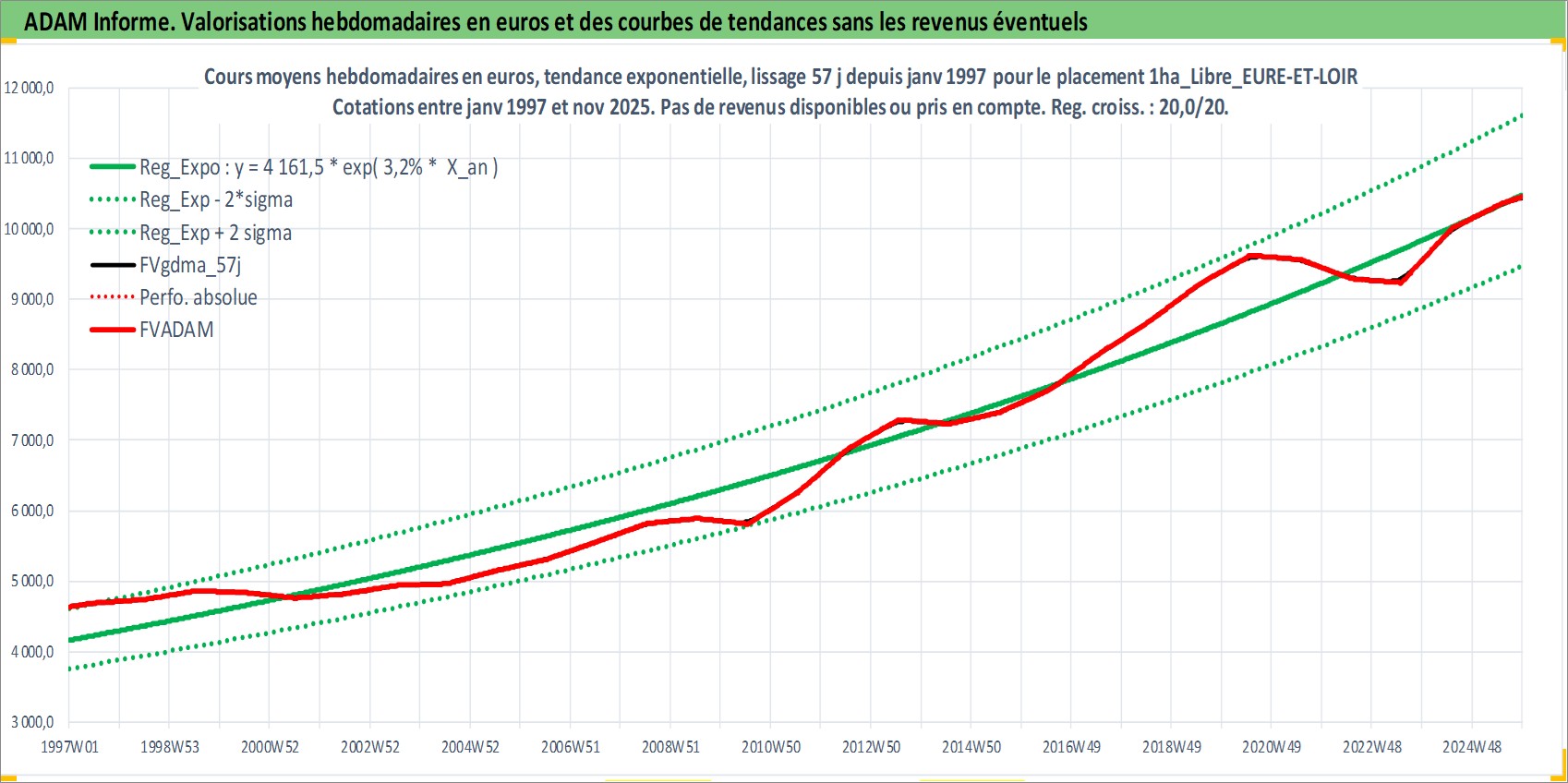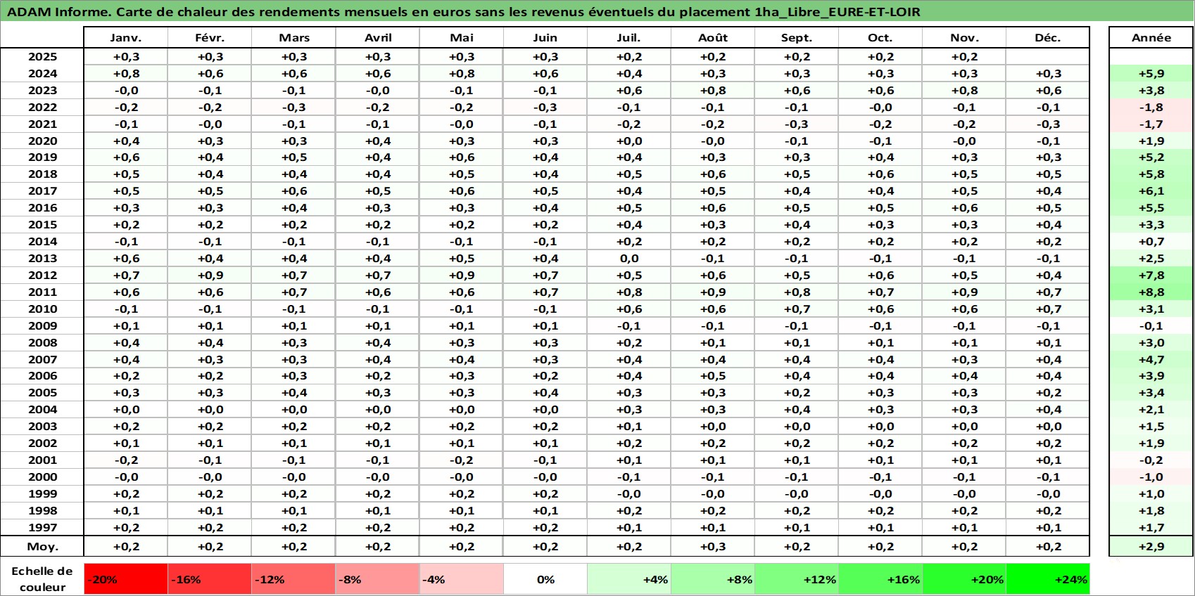 Site dédié aux investisseursPage dédiée sur site financeAnalyse des valorisations hebdomadaires de l'actif 1ha_Libre_EURE-ET-LOIR. Cet actif est cote en EUR. Les valorisations couvrent les semaines 1997W01 a 2025W48. Les fermages de ce bien foncier sont pris egaux a 2,5% annuels de la valeur venale du bien.