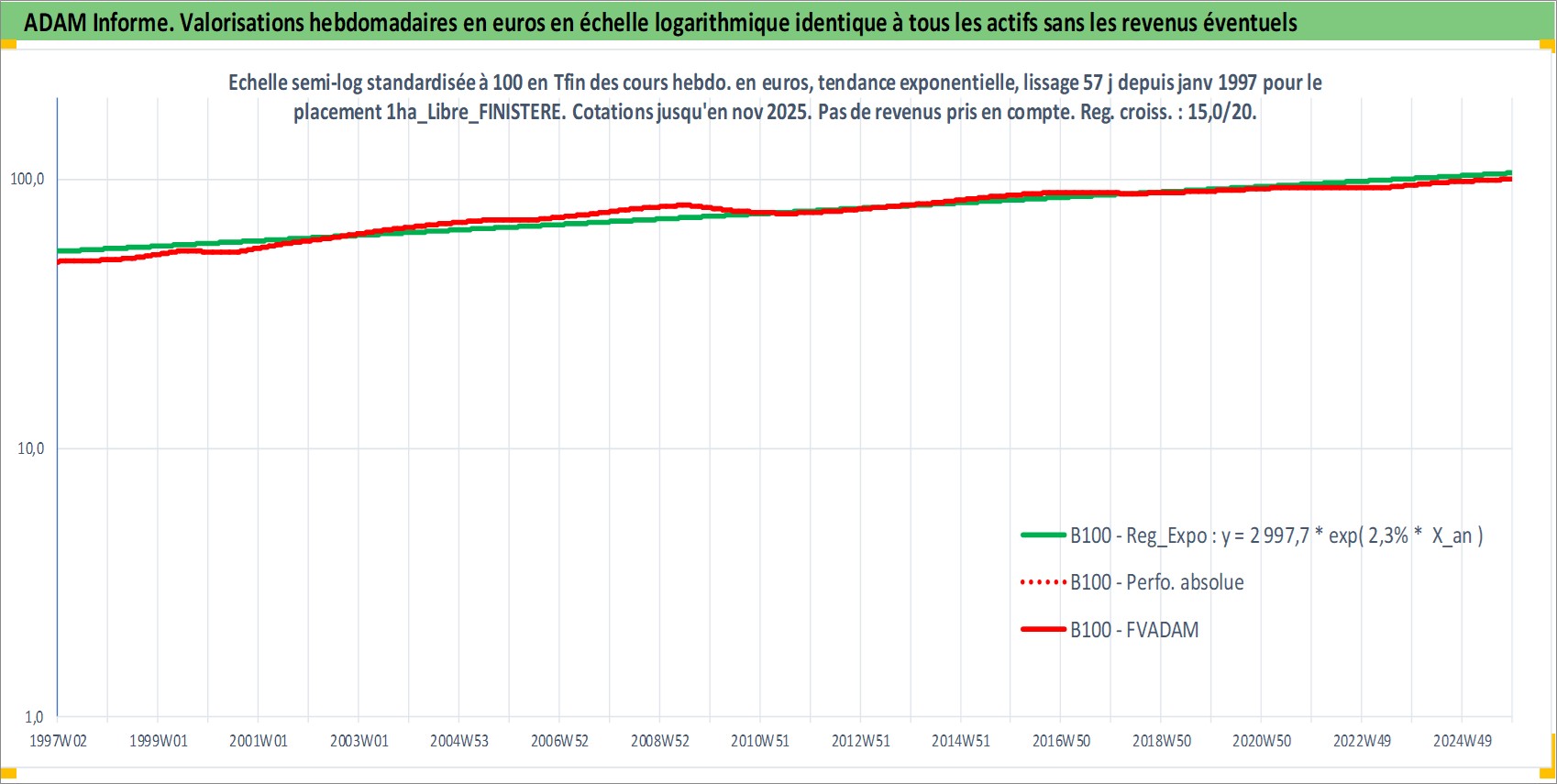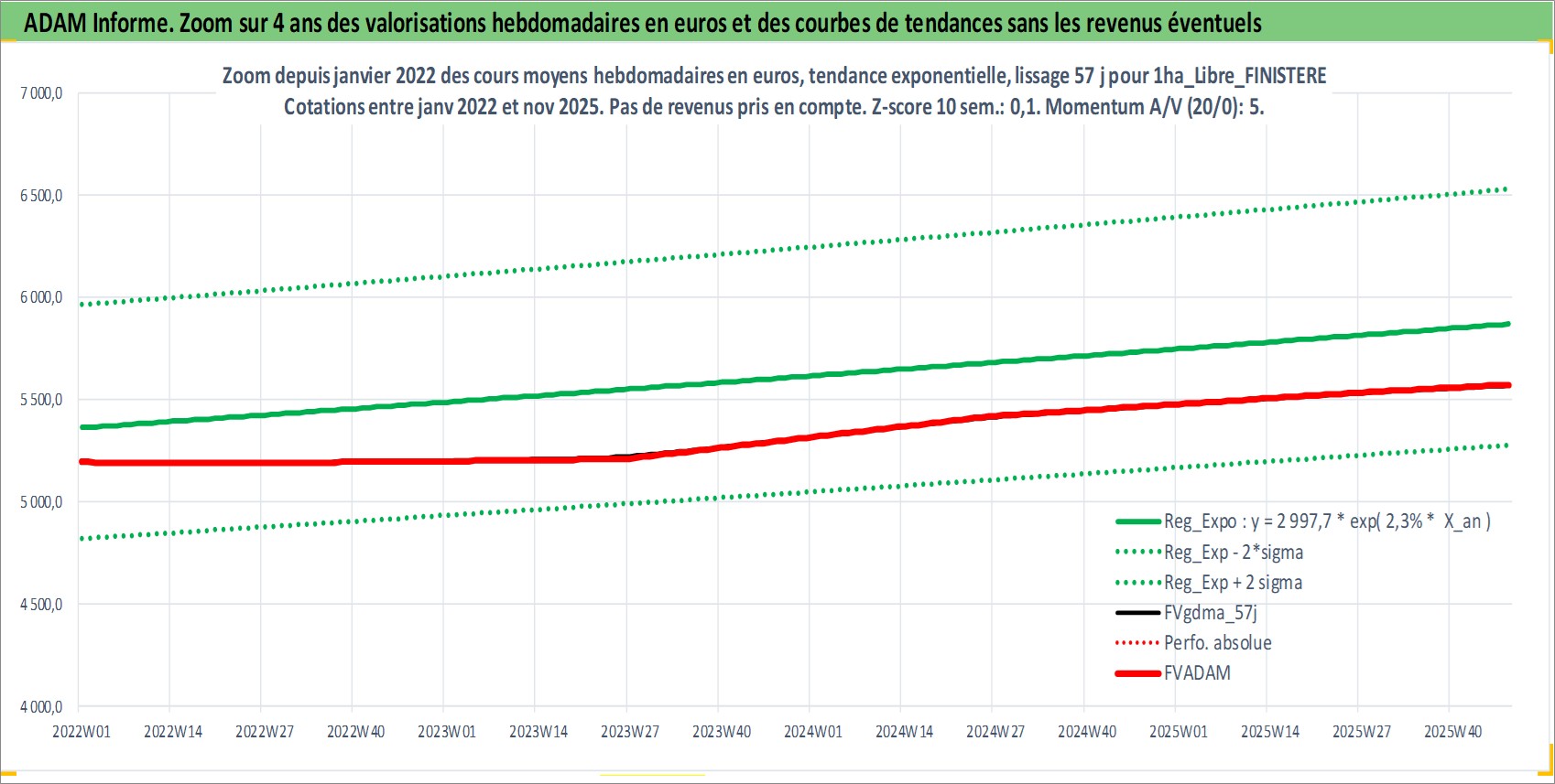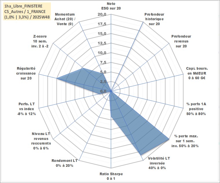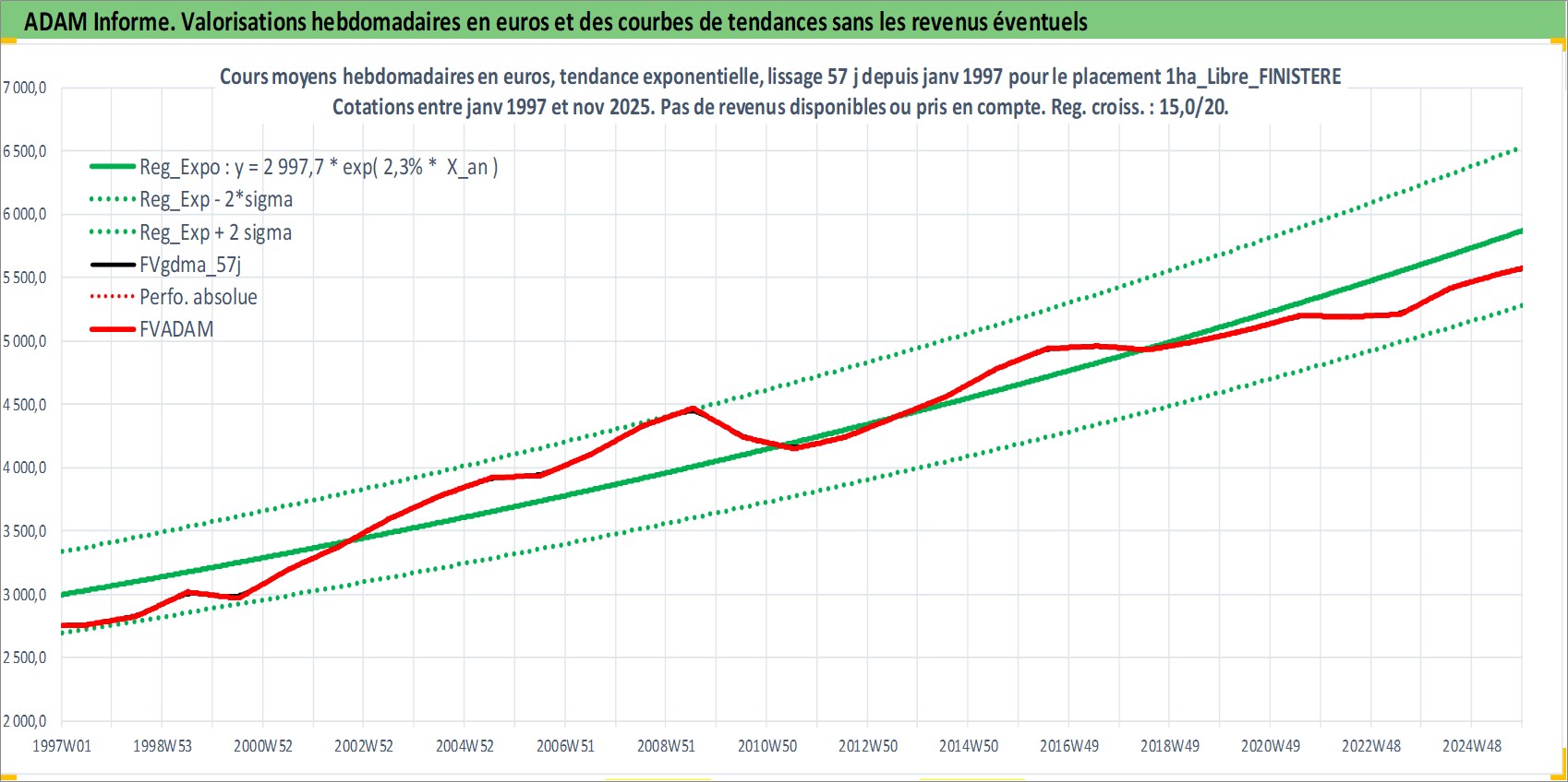 Site dédié aux investisseursPage dédiée sur site financeAnalyse des valorisations hebdomadaires de l'actif 1ha_Libre_FINISTERE. Cet actif est cote en EUR. Les valorisations couvrent les semaines 1997W01 a 2025W48. Les fermages de ce bien foncier sont pris egaux a 2,5% annuels de la valeur venale du bien.