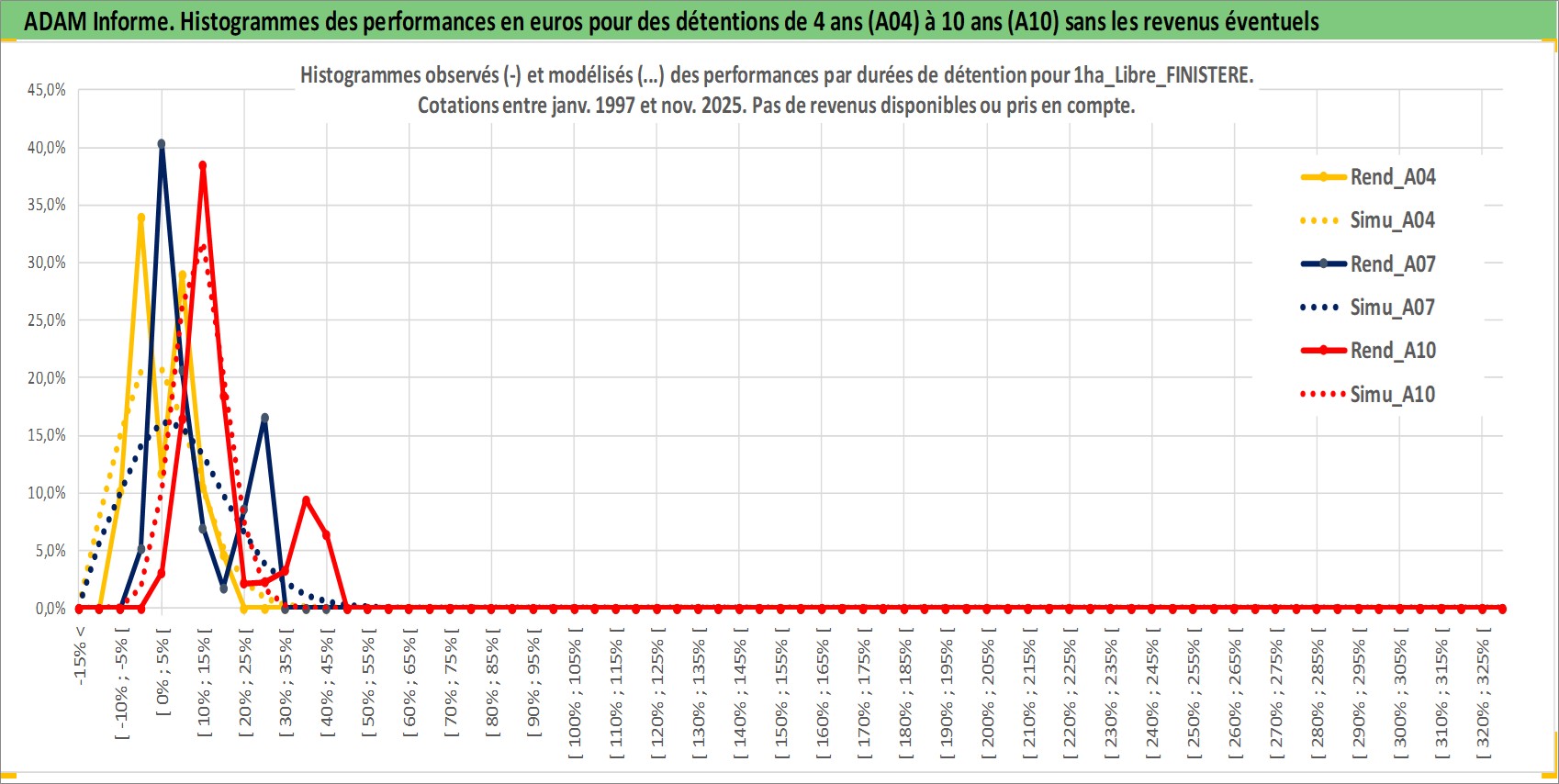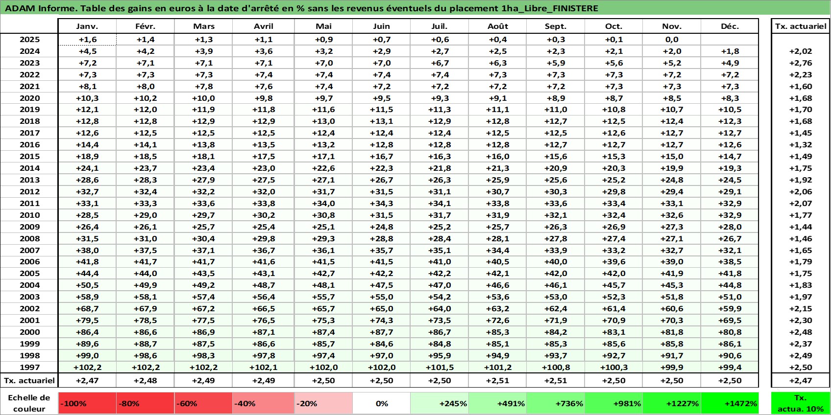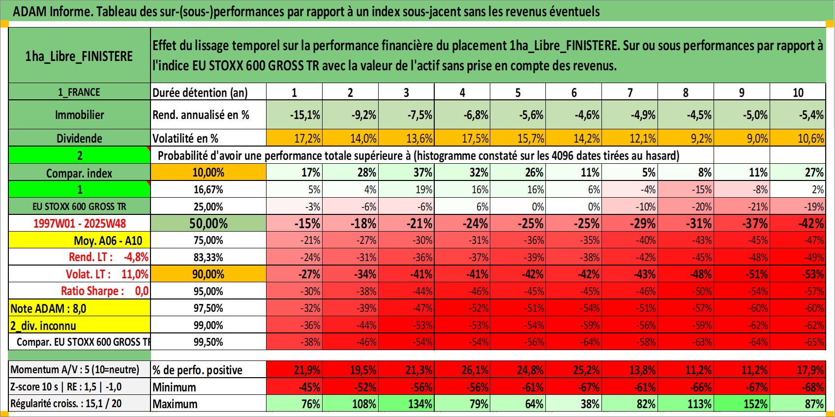 Site dédié aux investisseursPage dédiée sur site financeAnalyse des valorisations hebdomadaires de l'actif 1ha_Libre_FINISTERE. Cet actif est cote en EUR. Les valorisations couvrent les semaines 1997W01 a 2025W48. Les fermages de ce bien foncier sont pris egaux a 2,5% annuels de la valeur venale du bien.