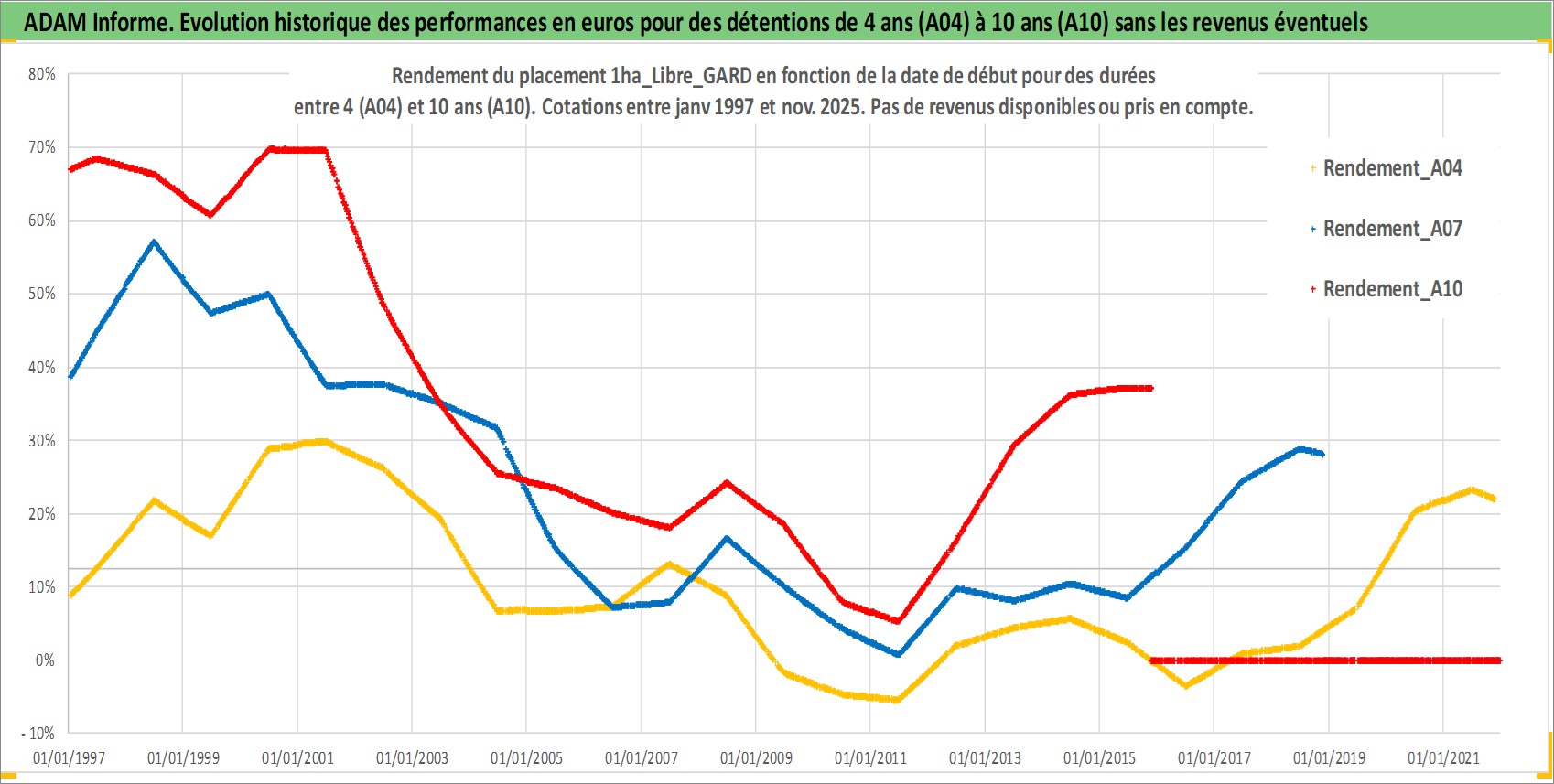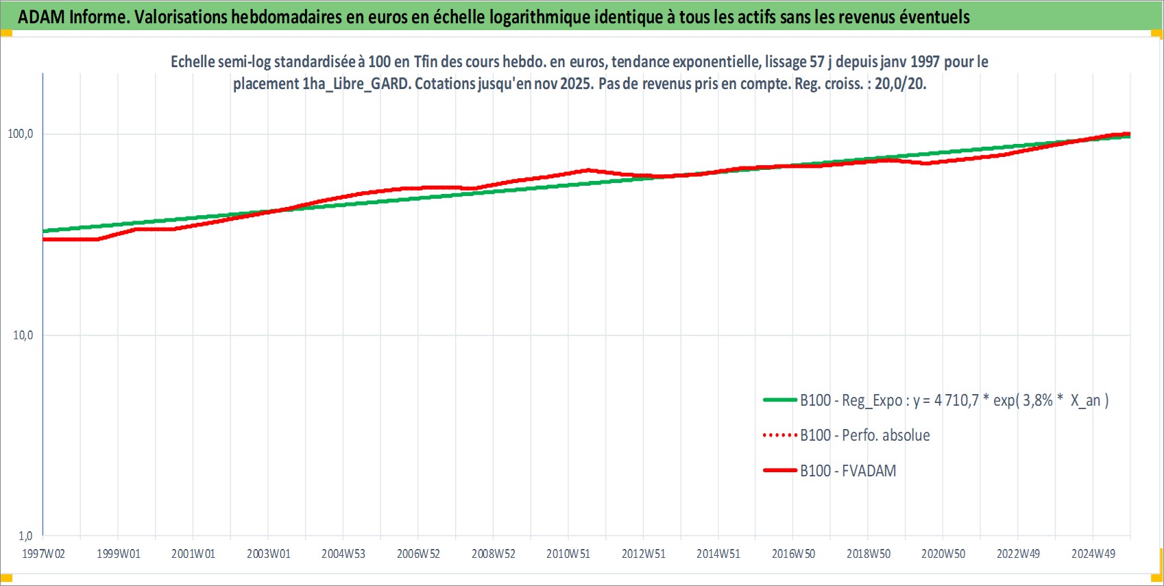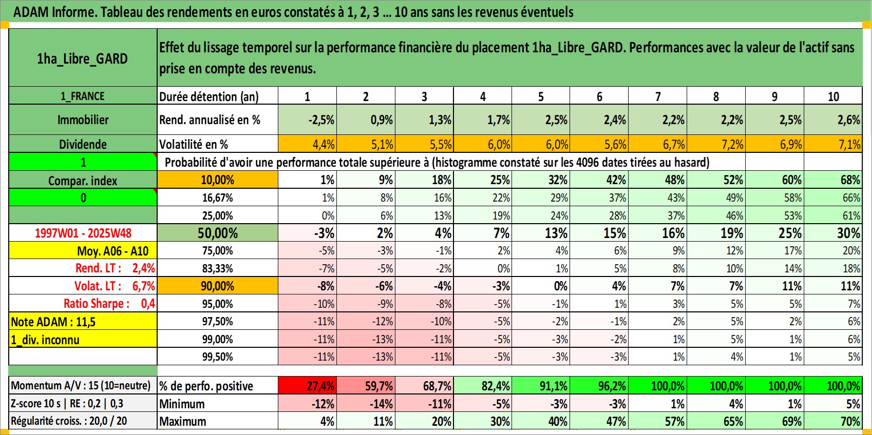 Site dédié aux investisseursPage dédiée sur site financeAnalyse des valorisations hebdomadaires de l'actif 1ha_Libre_GARD. Cet actif est cote en EUR. Les valorisations couvrent les semaines 1997W01 a 2025W48. Les fermages de ce bien foncier sont pris egaux a 2,5% annuels de la valeur venale du bien.