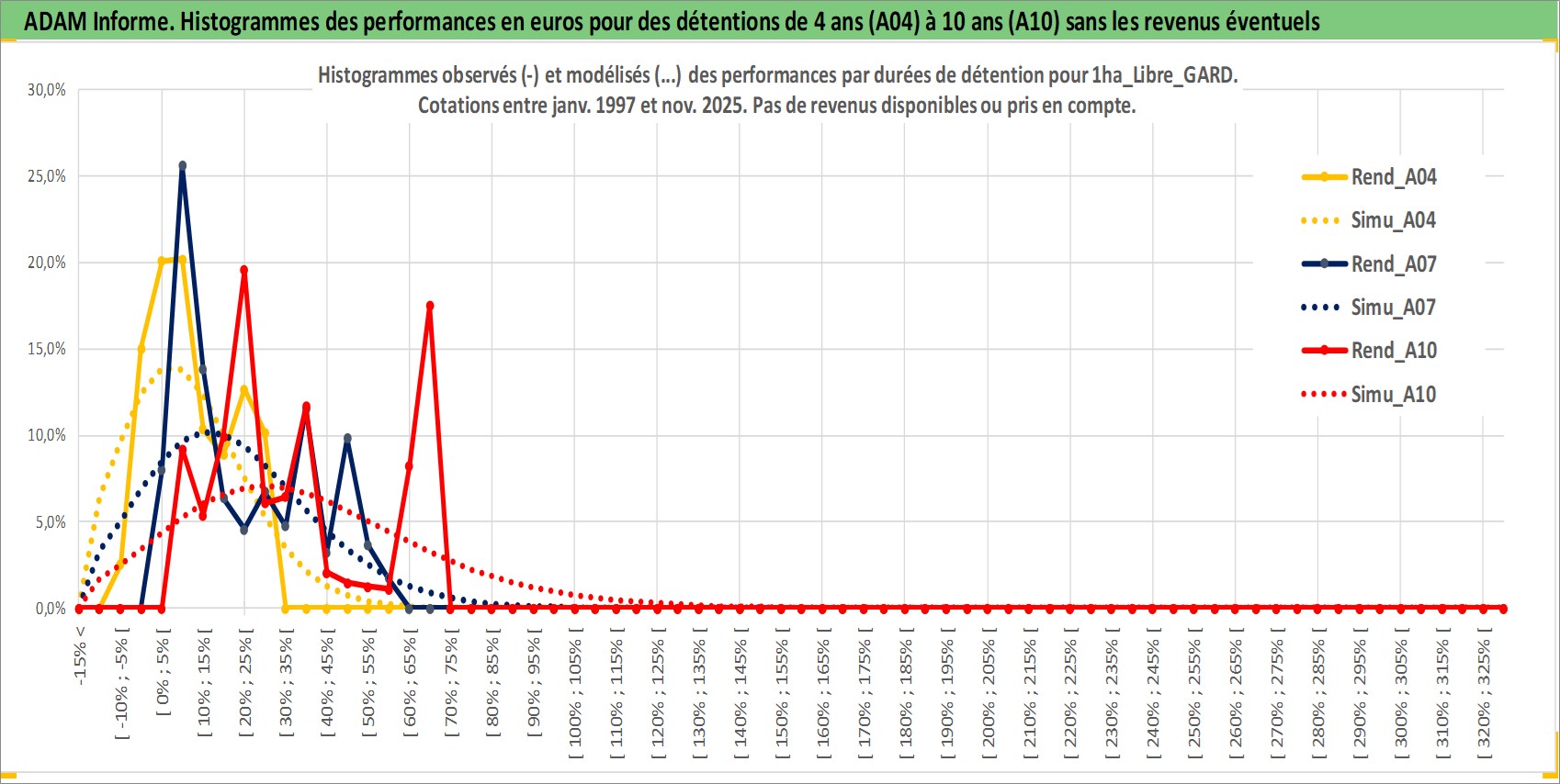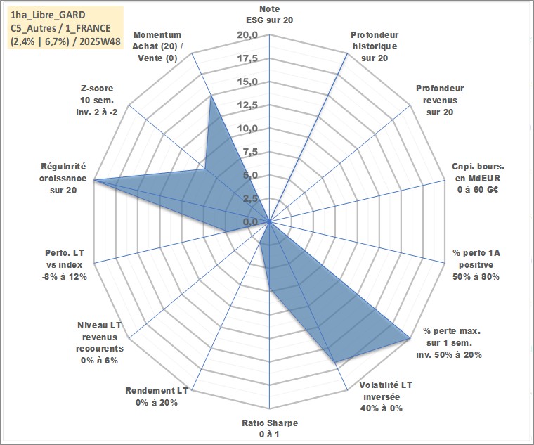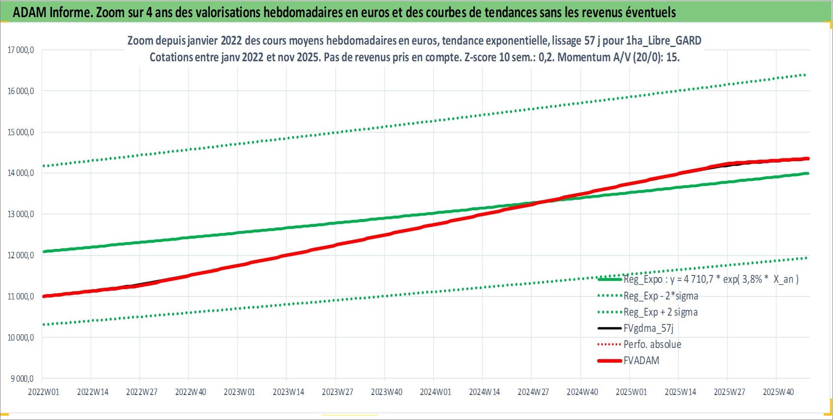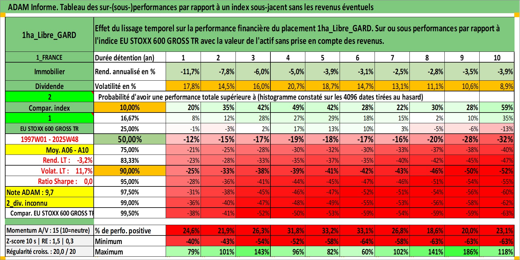 Site dédié aux investisseursPage dédiée sur site financeAnalyse des valorisations hebdomadaires de l'actif 1ha_Libre_GARD. Cet actif est cote en EUR. Les valorisations couvrent les semaines 1997W01 a 2025W48. Les fermages de ce bien foncier sont pris egaux a 2,5% annuels de la valeur venale du bien.