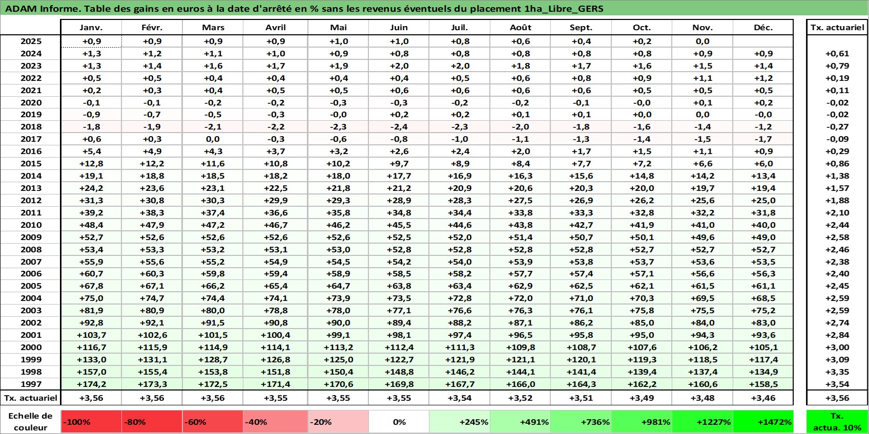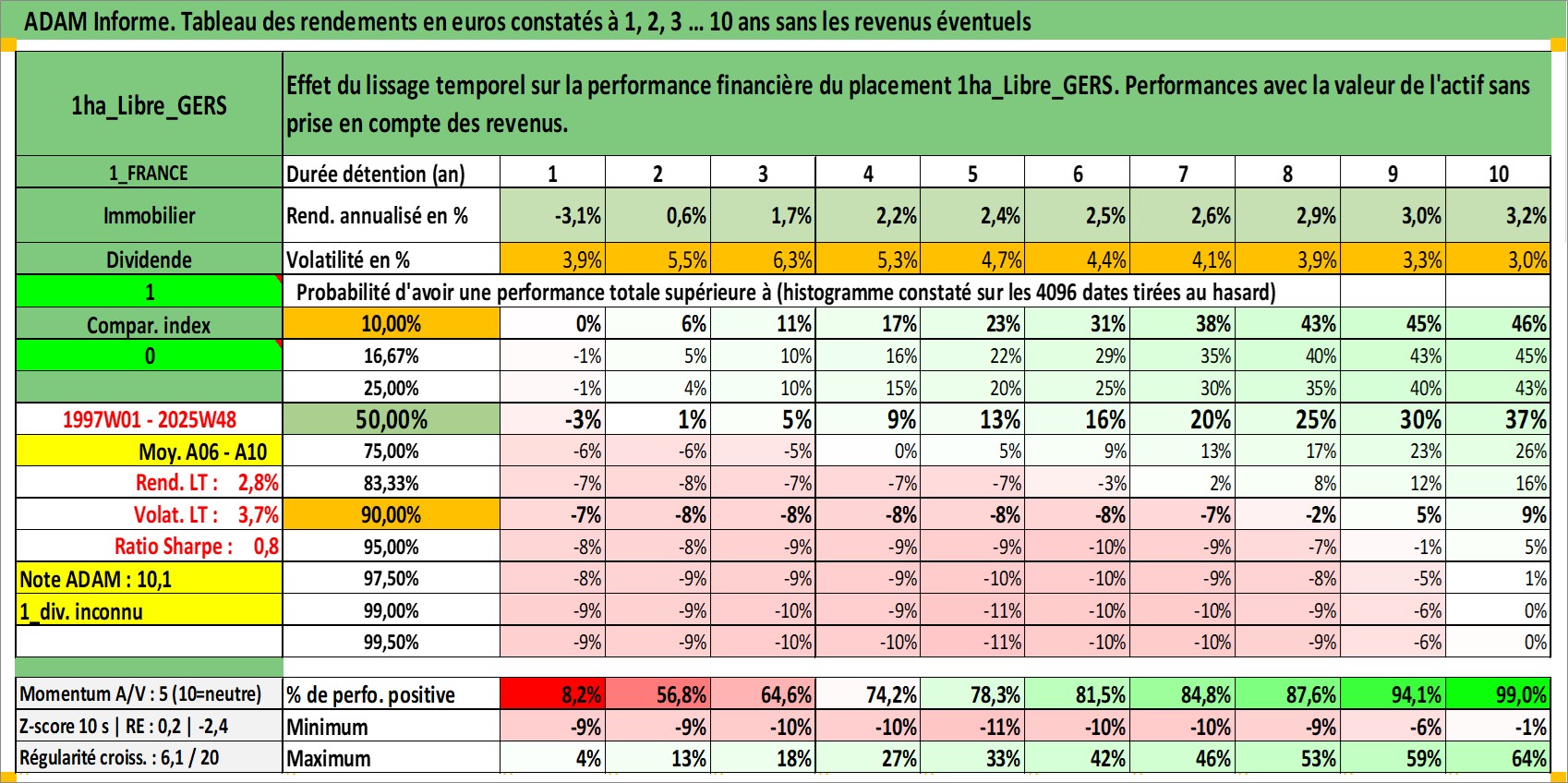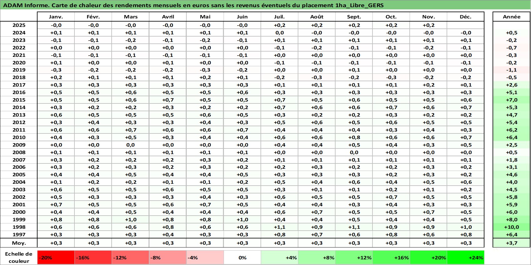Site dédié aux investisseursPage dédiée sur site financeAnalyse des valorisations hebdomadaires de l'actif 1ha_Libre_GERS. Cet actif est cote en EUR. Les valorisations couvrent les semaines 1997W01 a 2025W48. Les fermages de ce bien foncier sont pris egaux a 2,5% annuels de la valeur venale du bien.