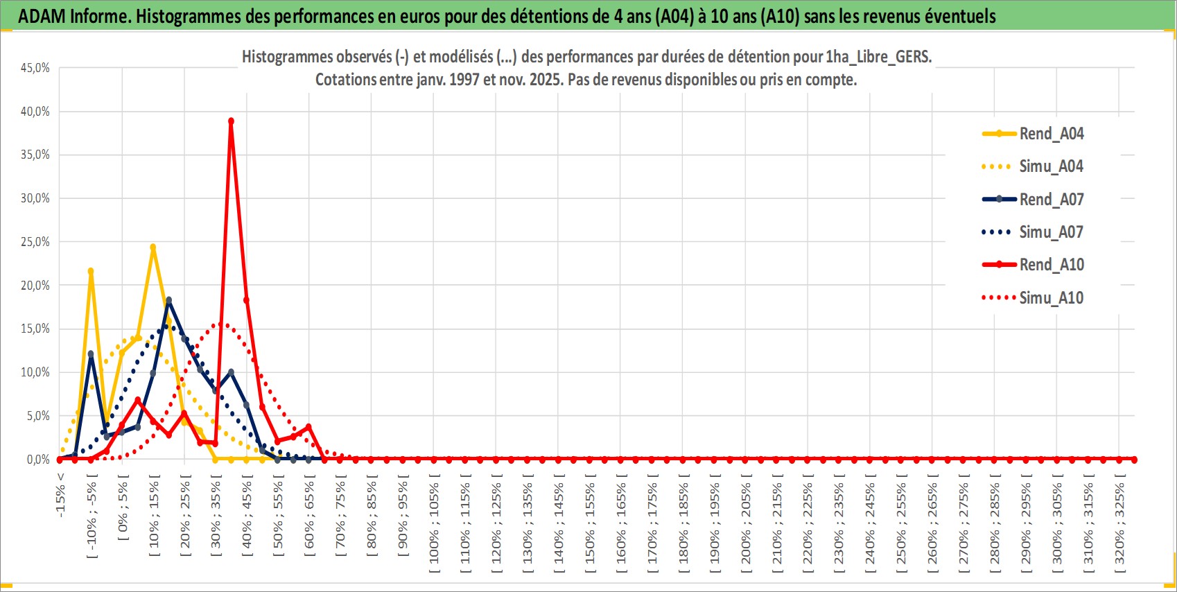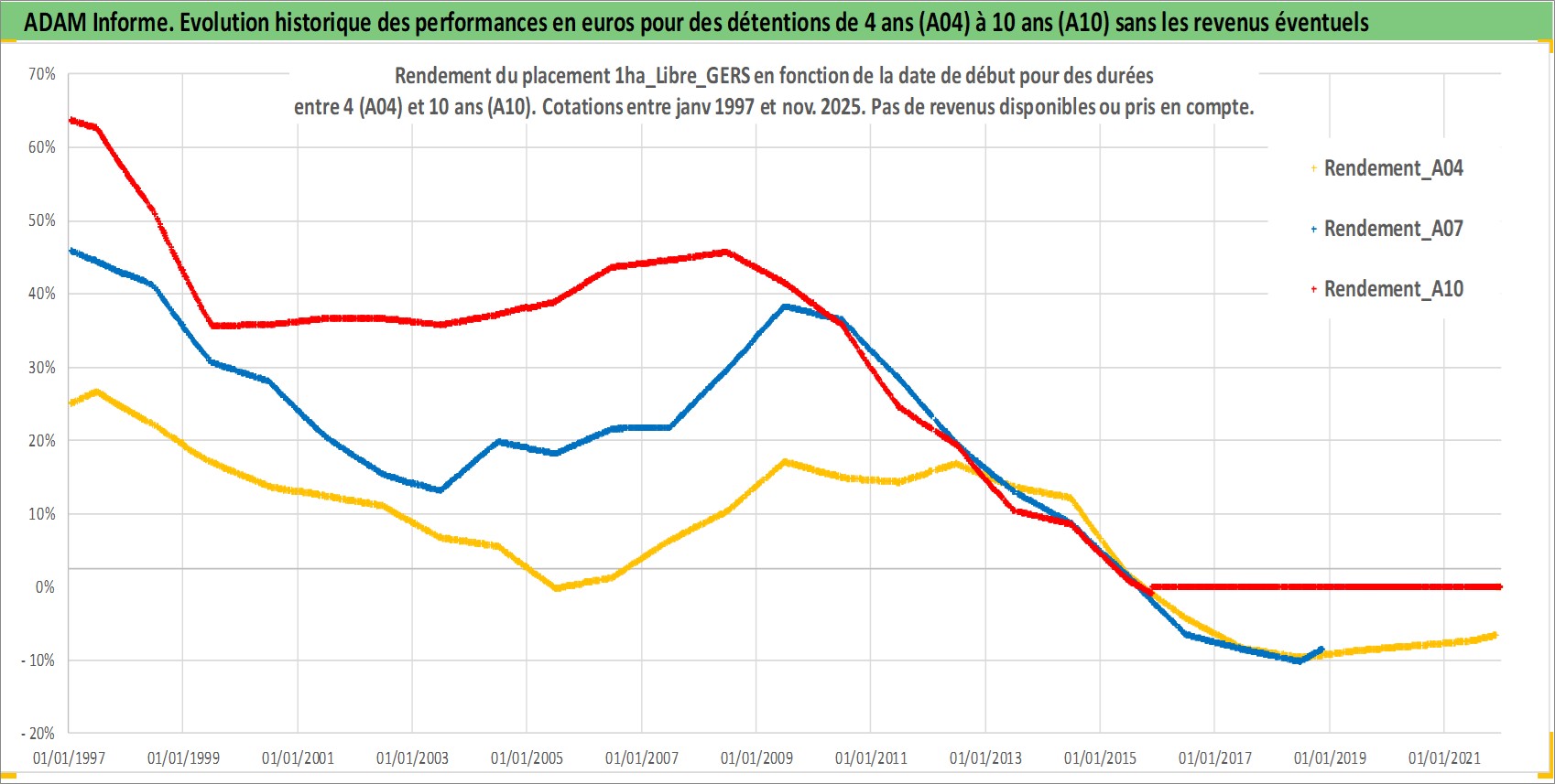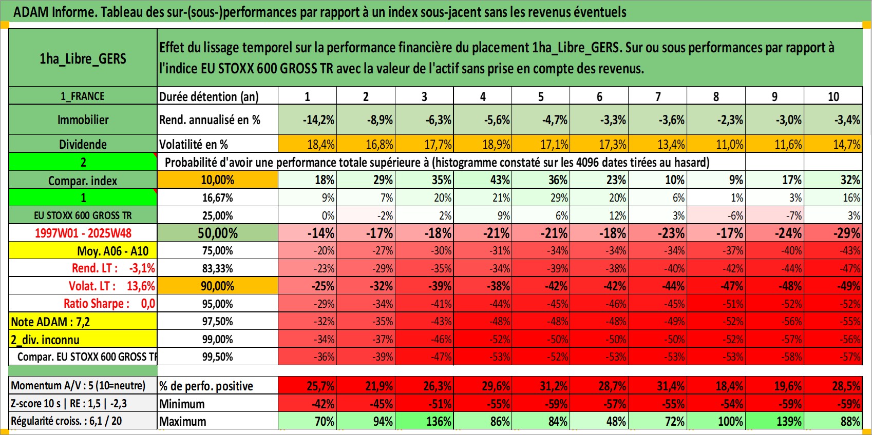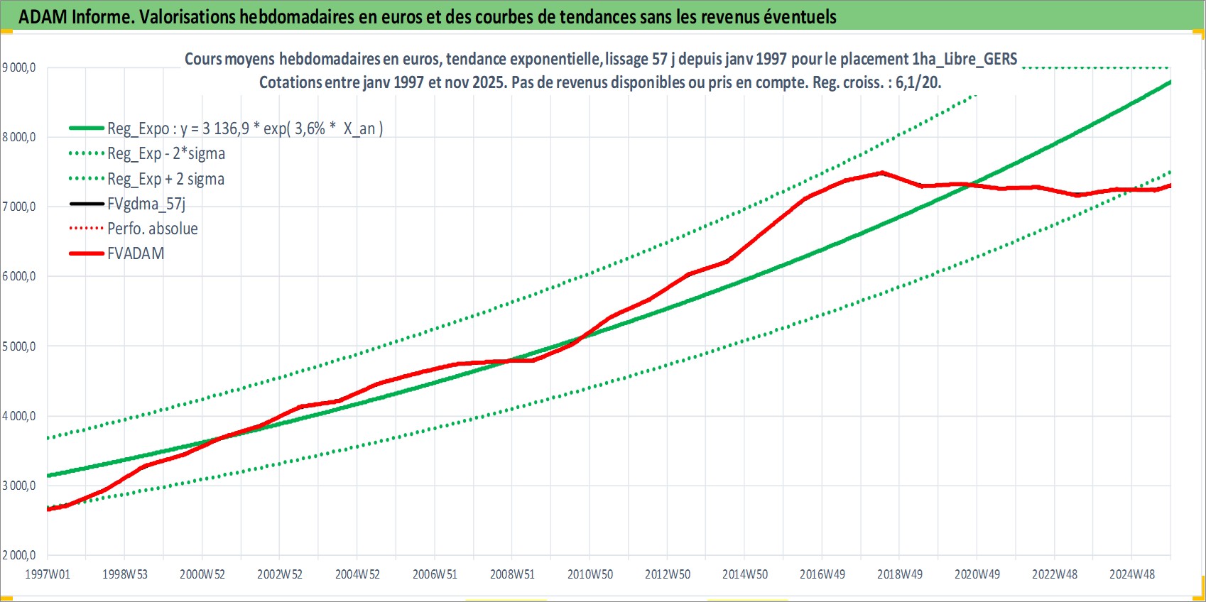 Site dédié aux investisseursPage dédiée sur site financeAnalyse des valorisations hebdomadaires de l'actif 1ha_Libre_GERS. Cet actif est cote en EUR. Les valorisations couvrent les semaines 1997W01 a 2025W48. Les fermages de ce bien foncier sont pris egaux a 2,5% annuels de la valeur venale du bien.
