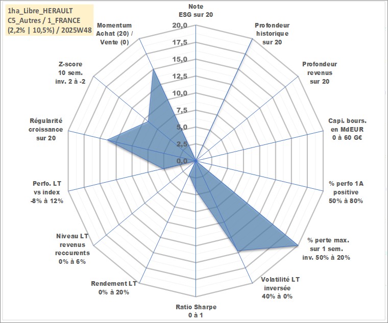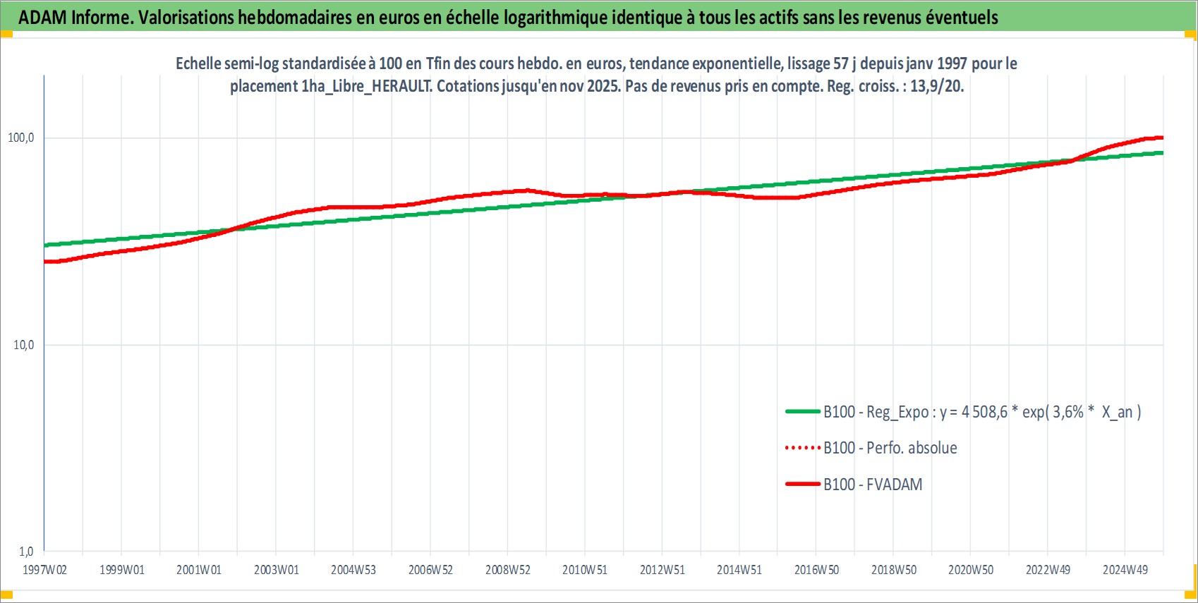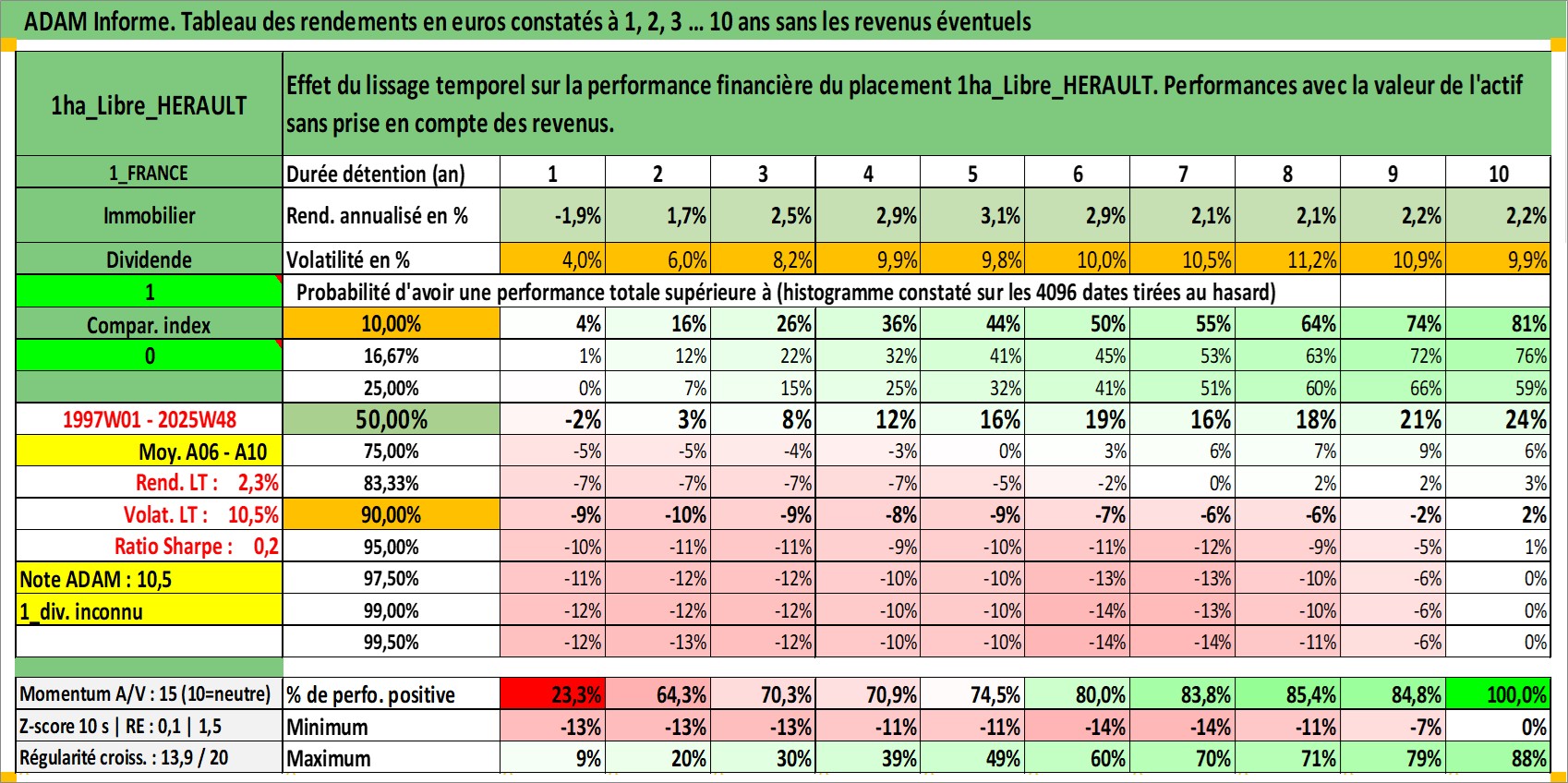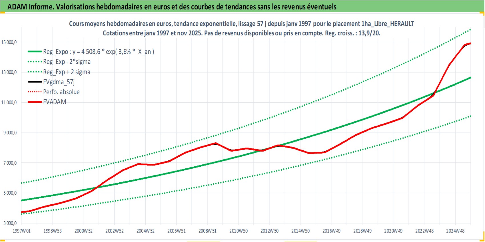 Site dédié aux investisseursPage dédiée sur site financeAnalyse des valorisations hebdomadaires de l'actif 1ha_Libre_HERAULT. Cet actif est cote en EUR. Les valorisations couvrent les semaines 1997W01 a 2025W48. Les fermages de ce bien foncier sont pris egaux a 2,5% annuels de la valeur venale du bien.