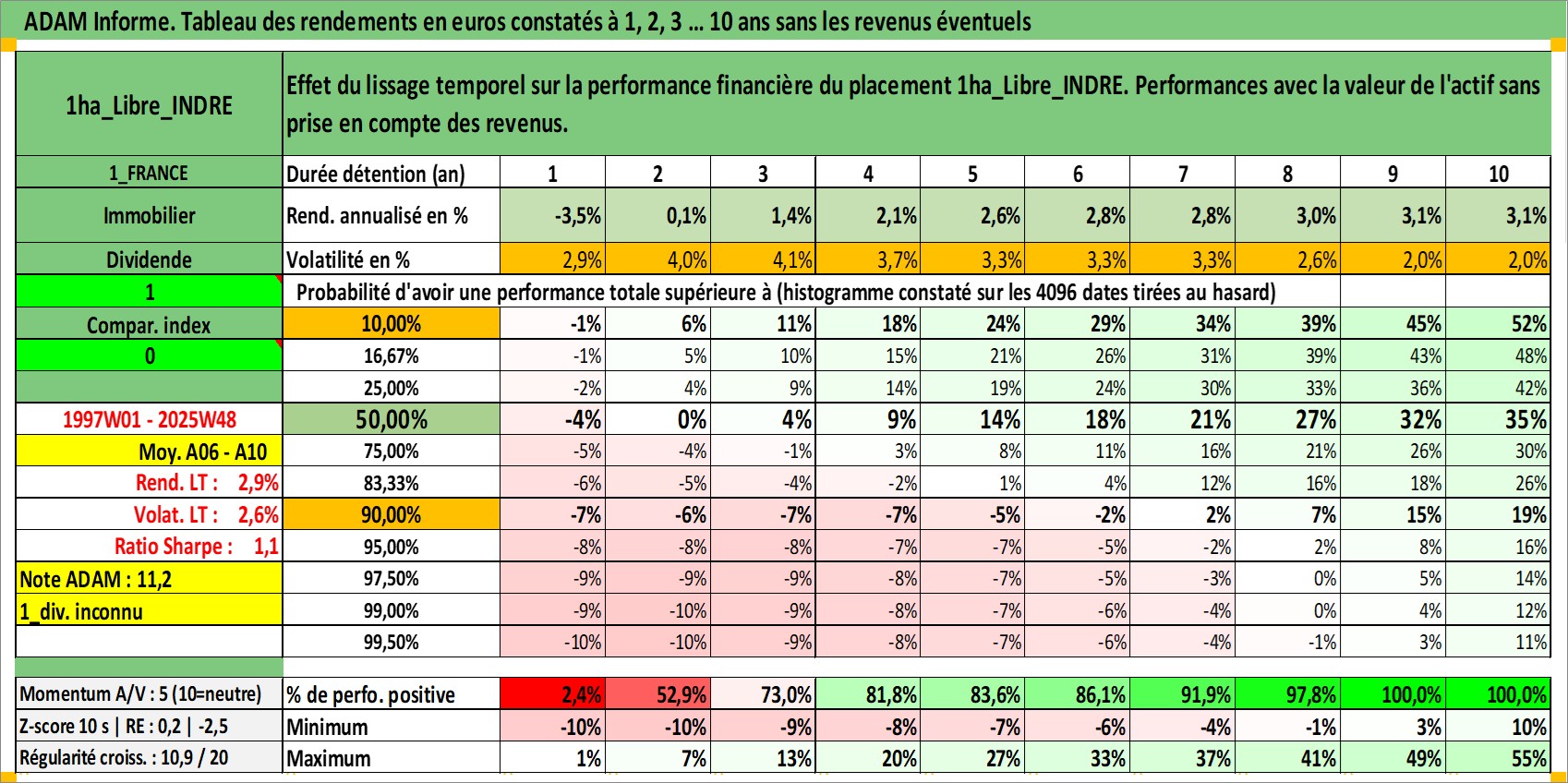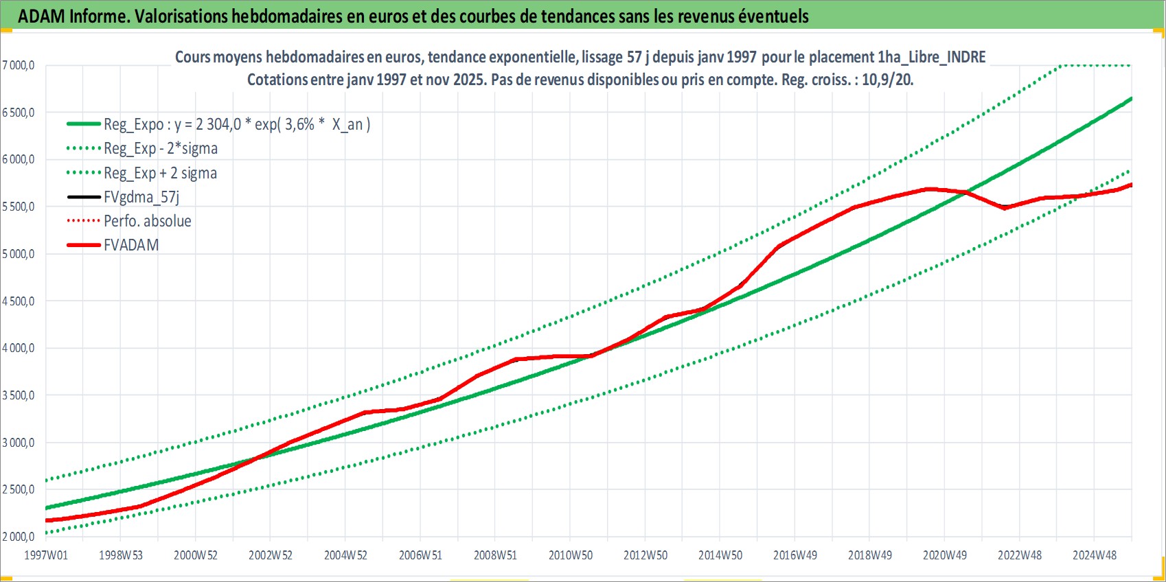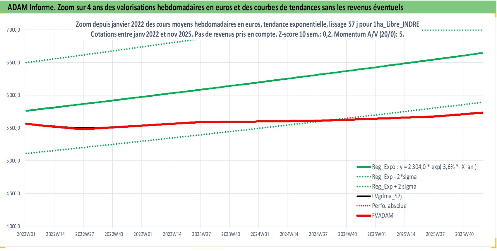 Site dédié aux investisseursPage dédiée sur site financeAnalyse des valorisations hebdomadaires de l'actif 1ha_Libre_INDRE. Cet actif est cote en EUR. Les valorisations couvrent les semaines 1997W01 a 2025W48. Les fermages de ce bien foncier sont pris egaux a 2,5% annuels de la valeur venale du bien.