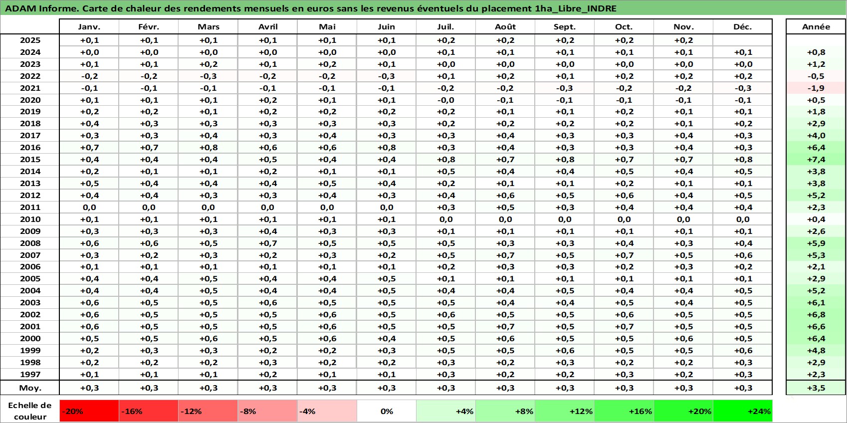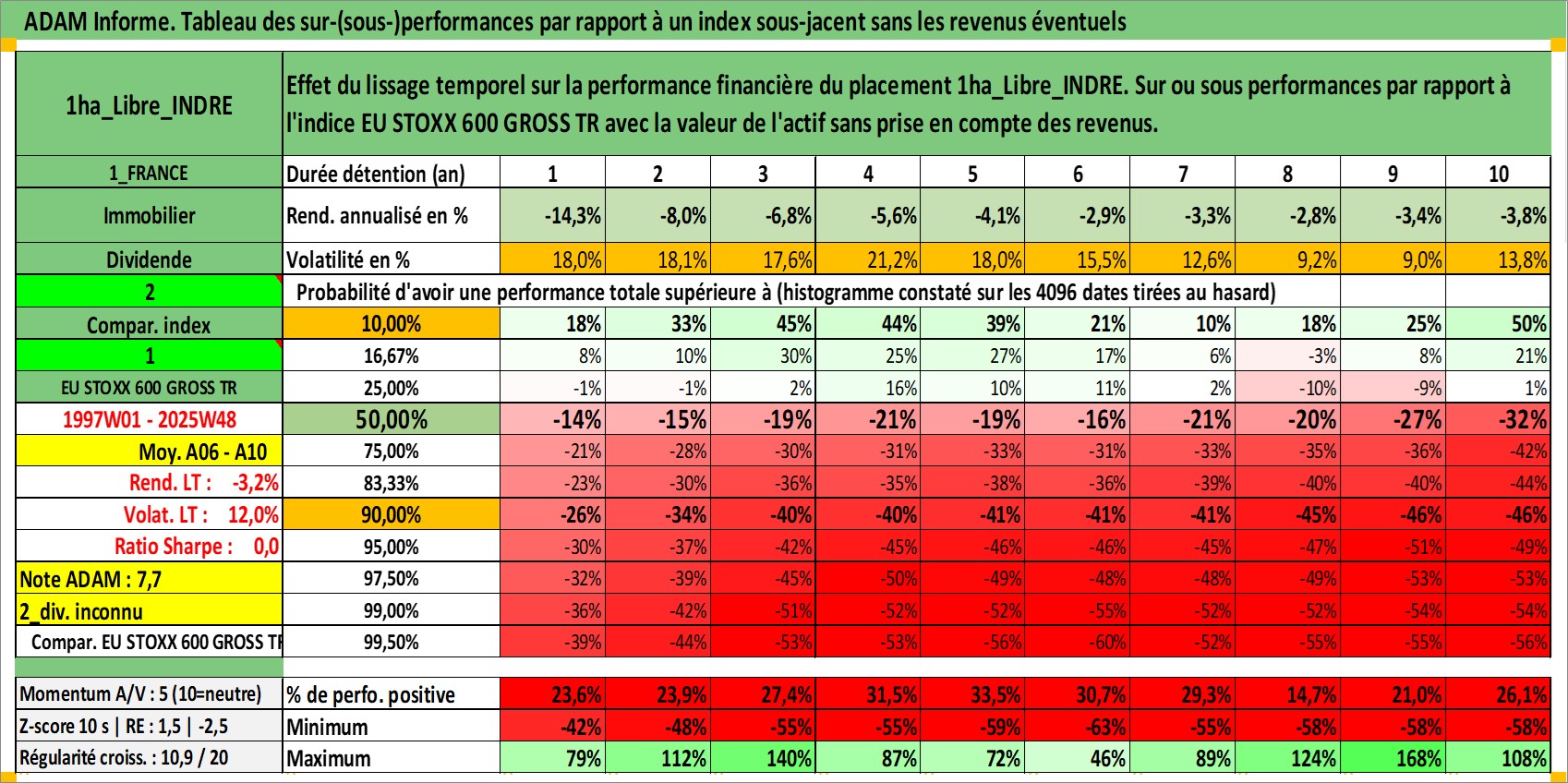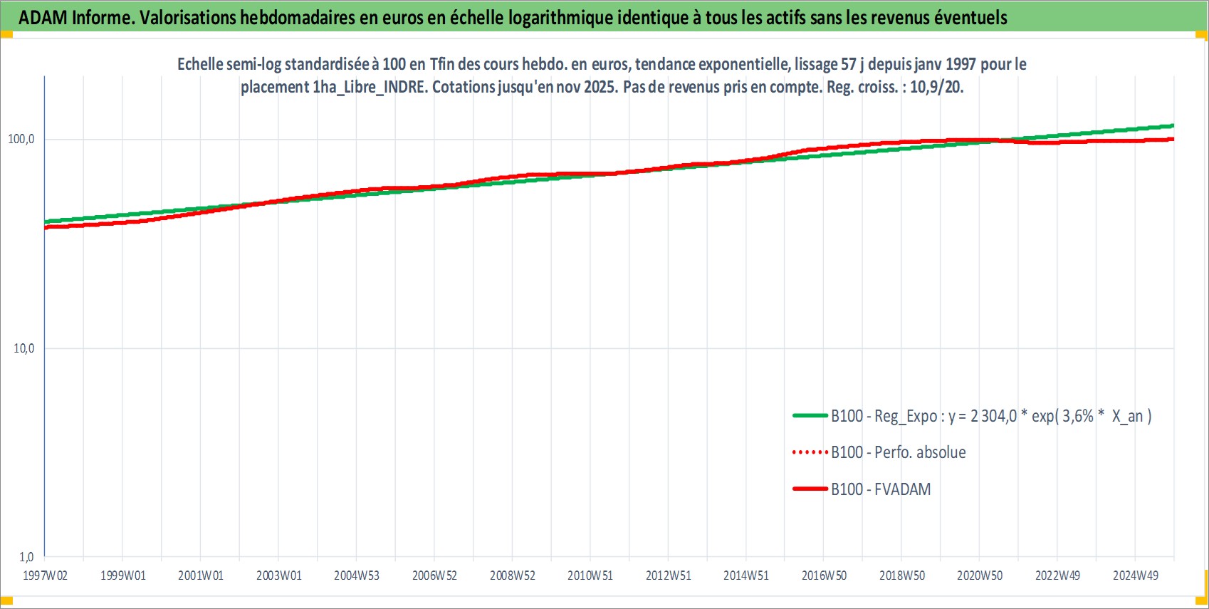 Site dédié aux investisseursPage dédiée sur site financeAnalyse des valorisations hebdomadaires de l'actif 1ha_Libre_INDRE. Cet actif est cote en EUR. Les valorisations couvrent les semaines 1997W01 a 2025W48. Les fermages de ce bien foncier sont pris egaux a 2,5% annuels de la valeur venale du bien.