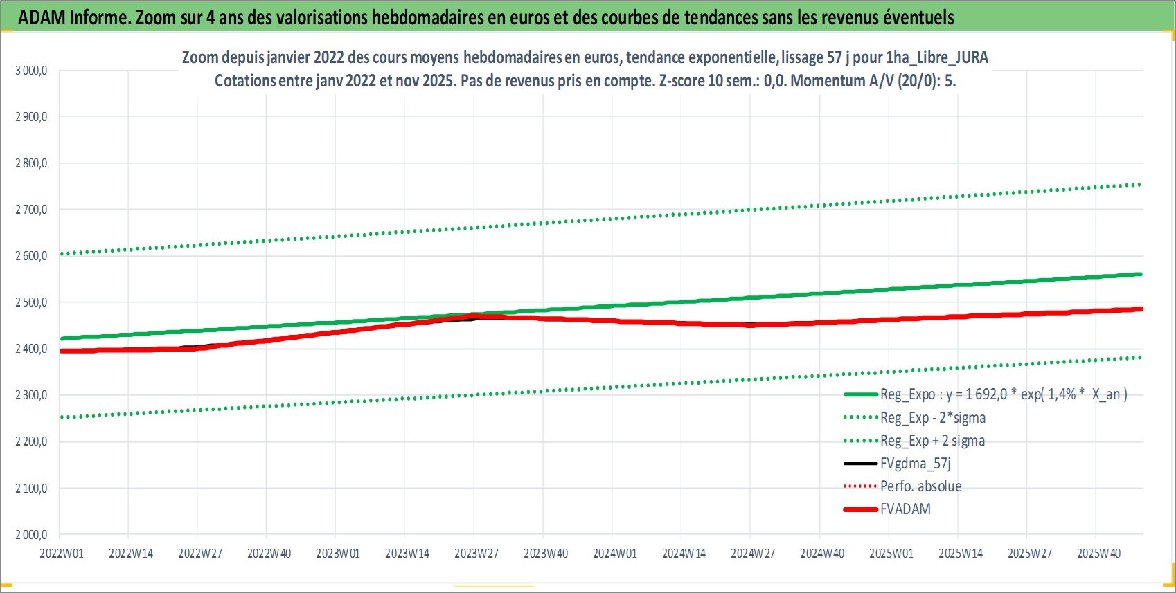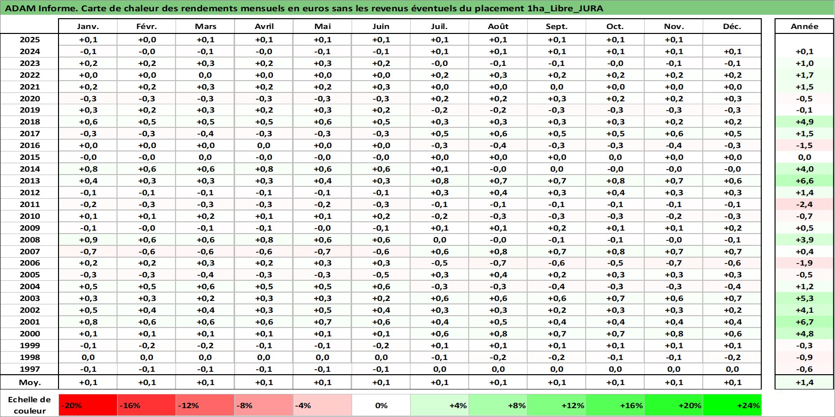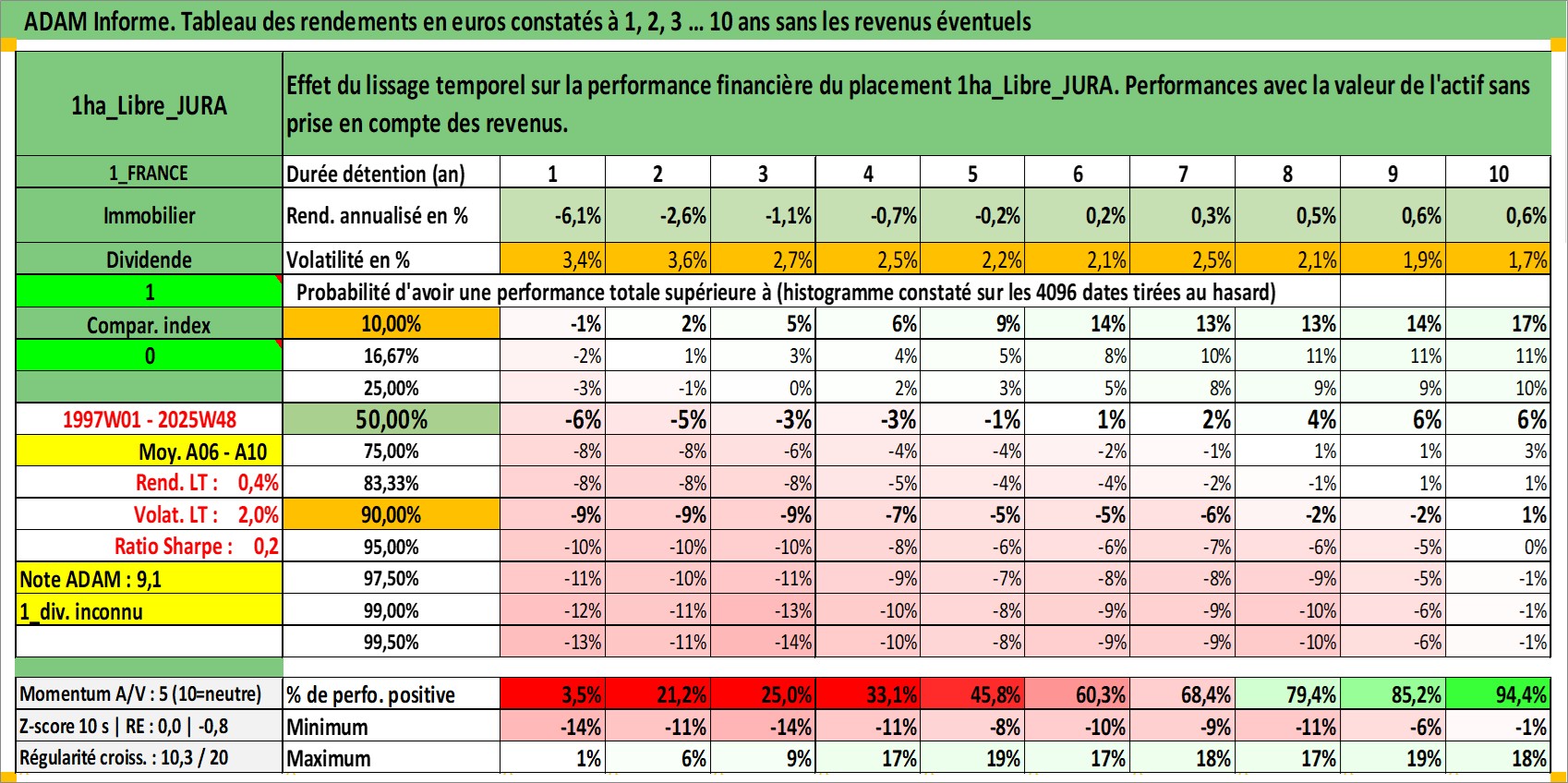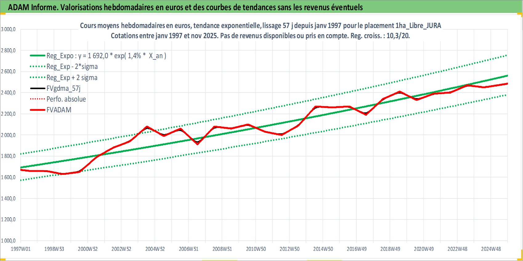 Site dédié aux investisseursPage dédiée sur site financeAnalyse des valorisations hebdomadaires de l'actif 1ha_Libre_JURA. Cet actif est cote en EUR. Les valorisations couvrent les semaines 1997W01 a 2025W48. Les fermages de ce bien foncier sont pris egaux a 2,5% annuels de la valeur venale du bien.