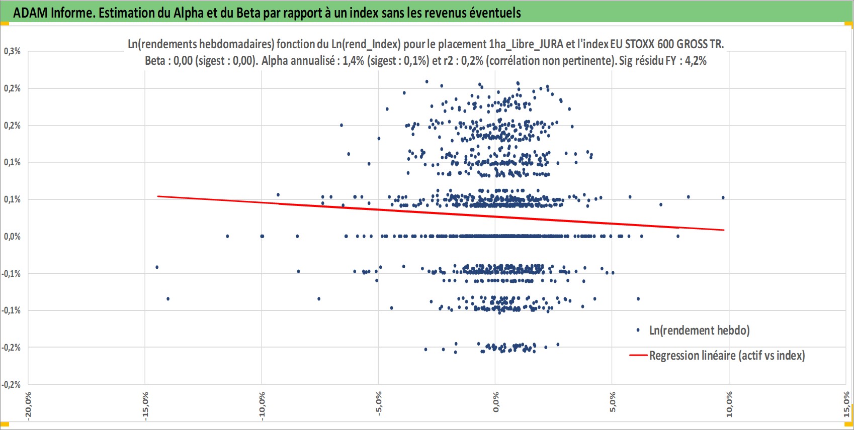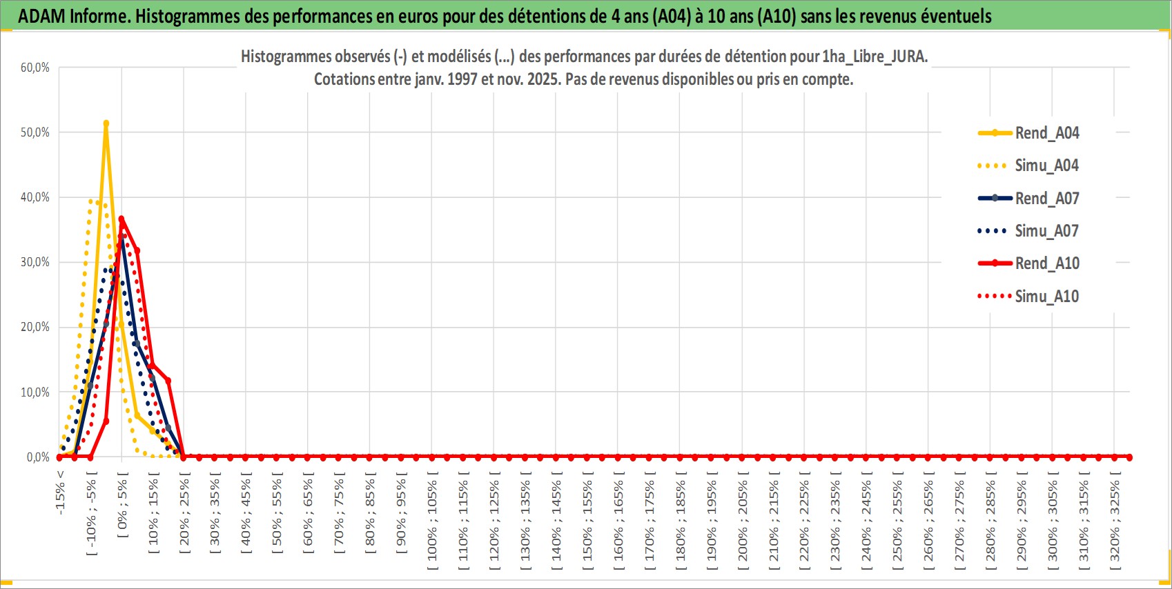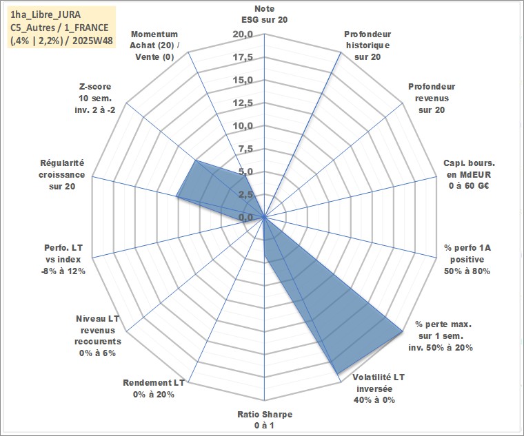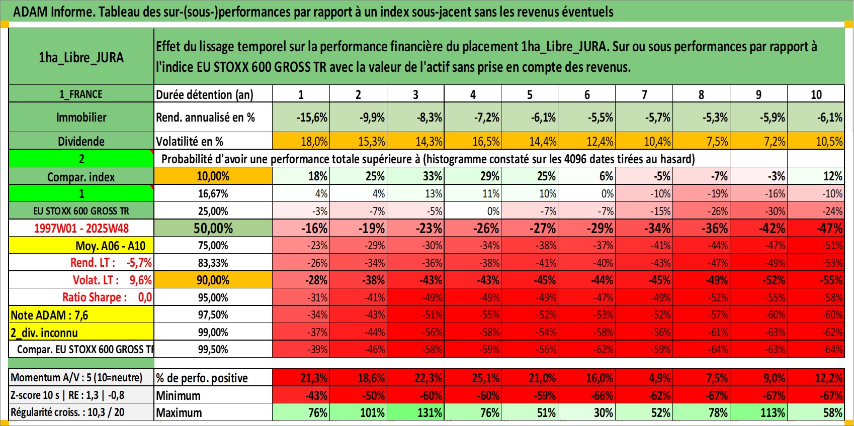 Site dédié aux investisseursPage dédiée sur site financeAnalyse des valorisations hebdomadaires de l'actif 1ha_Libre_JURA. Cet actif est cote en EUR. Les valorisations couvrent les semaines 1997W01 a 2025W48. Les fermages de ce bien foncier sont pris egaux a 2,5% annuels de la valeur venale du bien.
