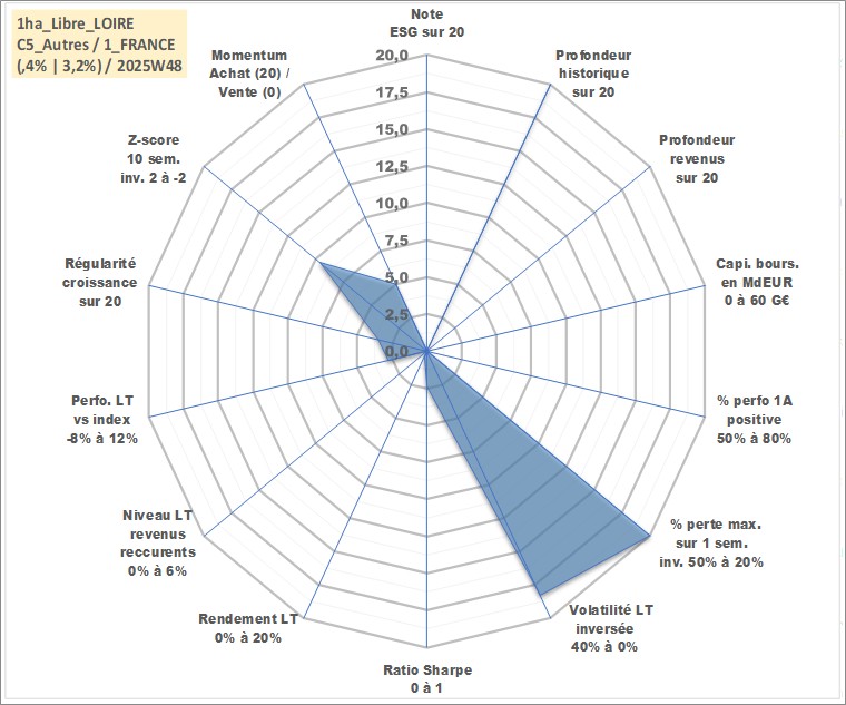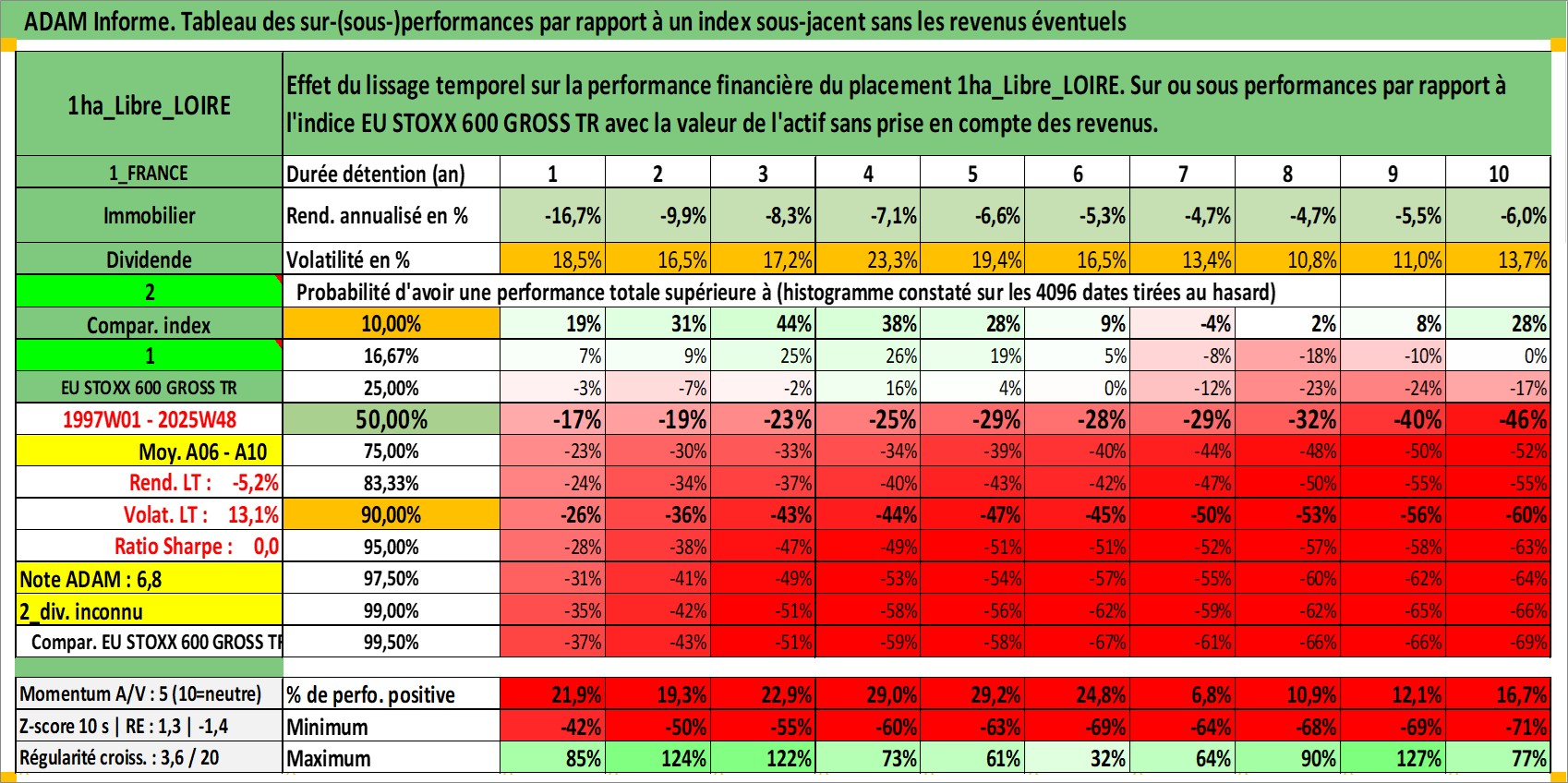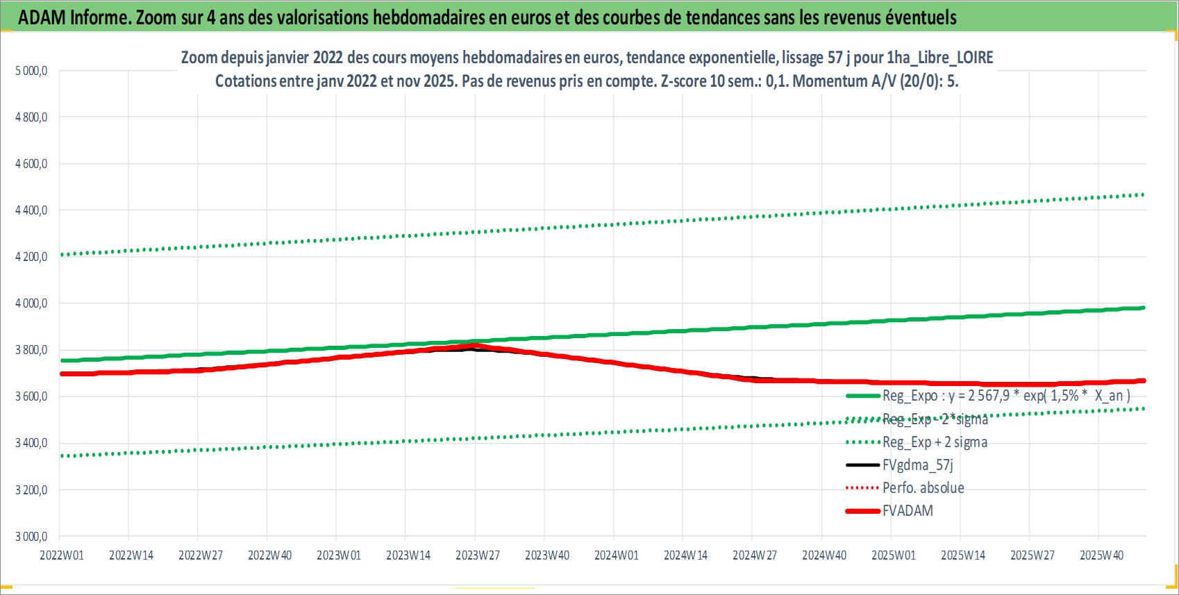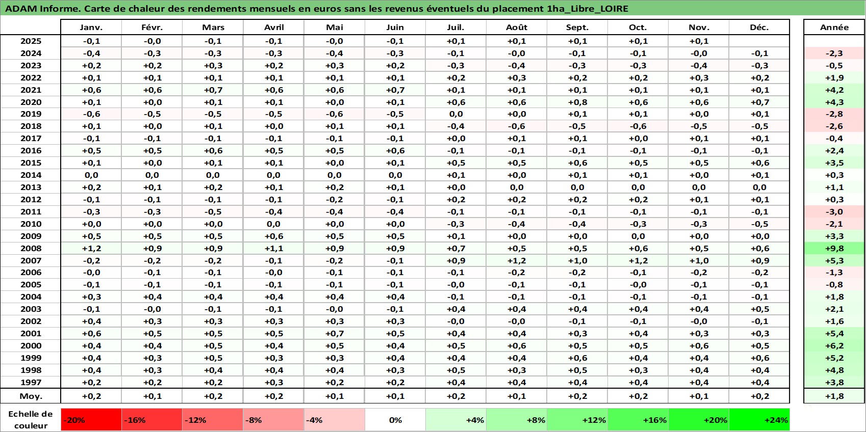 Site dédié aux investisseursPage dédiée sur site financeAnalyse des valorisations hebdomadaires de l'actif 1ha_Libre_LOIRE. Cet actif est cote en EUR. Les valorisations couvrent les semaines 1997W01 a 2025W48. Les fermages de ce bien foncier sont pris egaux a 2,5% annuels de la valeur venale du bien.