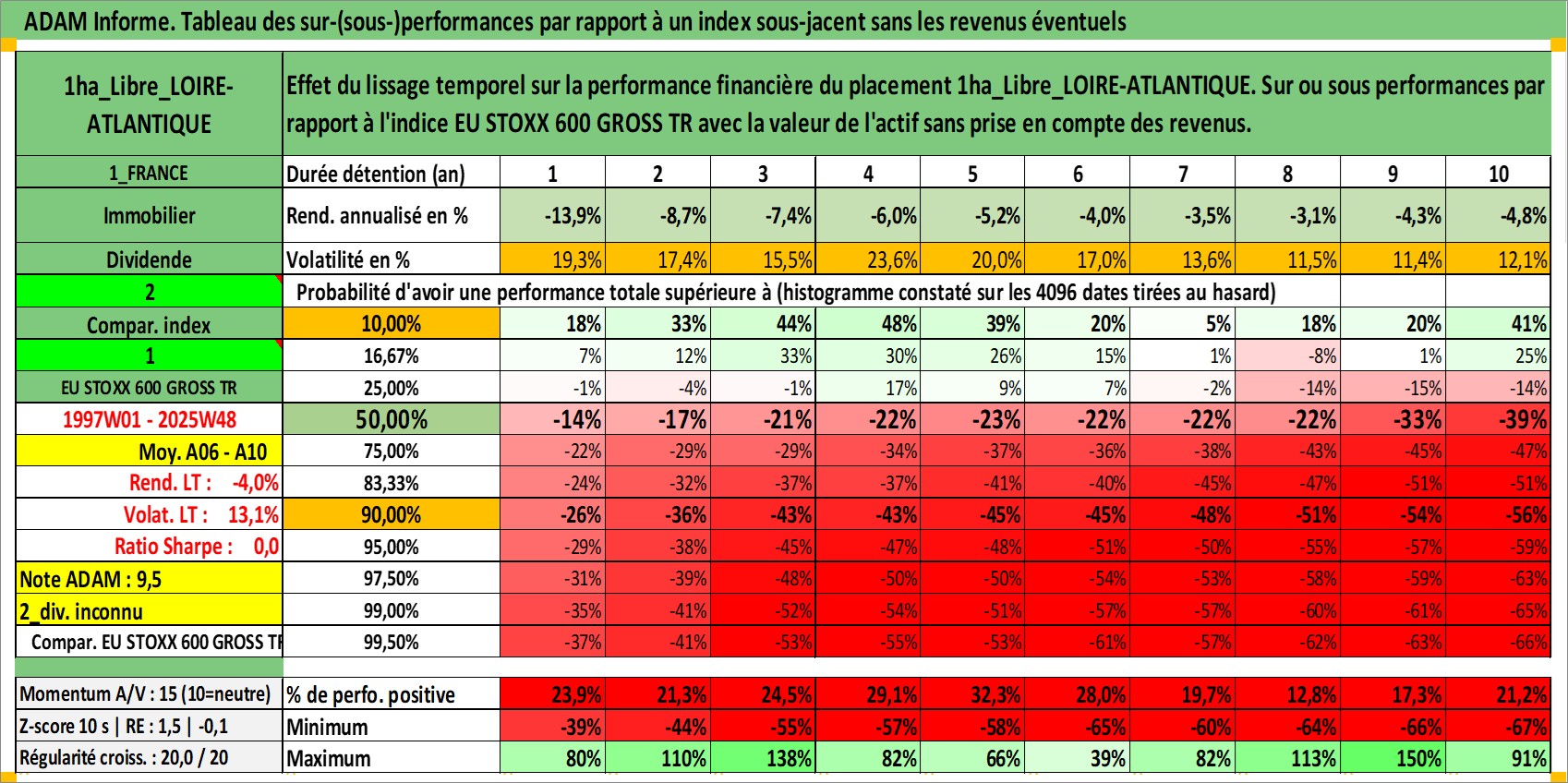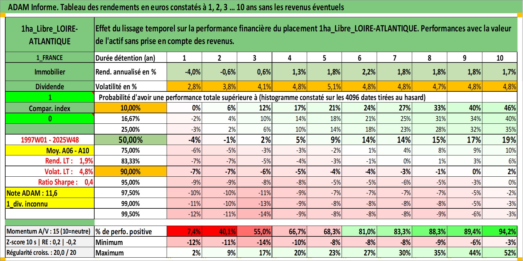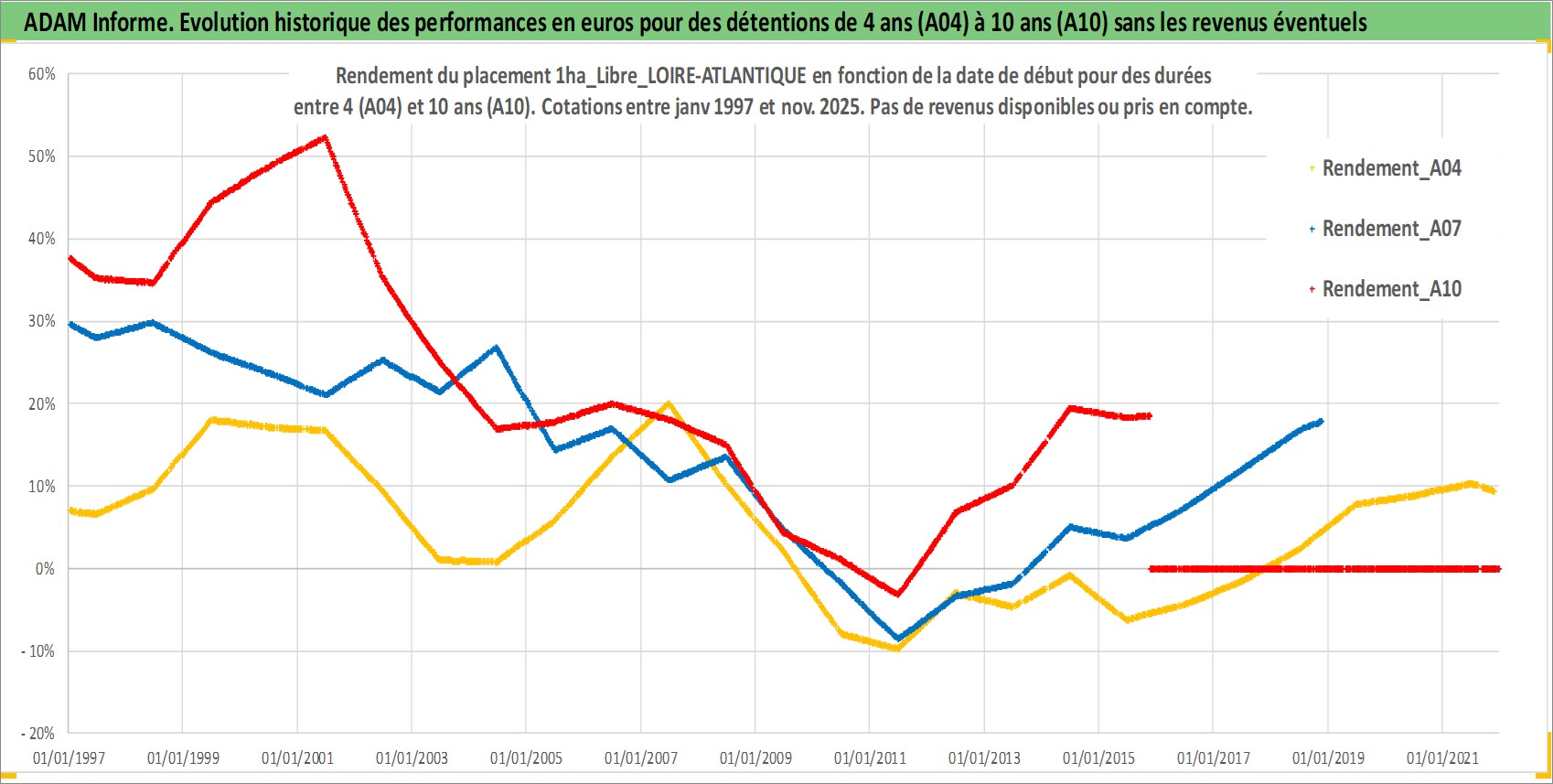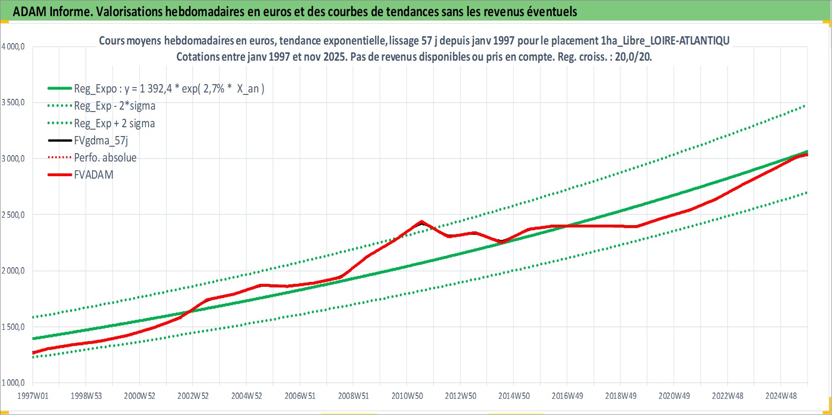 Site dédié aux investisseursPage dédiée sur site financeAnalyse des valorisations hebdomadaires de l'actif 1ha_Libre_LOIRE-ATLANTIQUE. Cet actif est cote en EUR. Les valorisations couvrent les semaines 1997W01 a 2025W48. Les fermages de ce bien foncier sont pris egaux a 2,5% annuels de la valeur venale du bien.