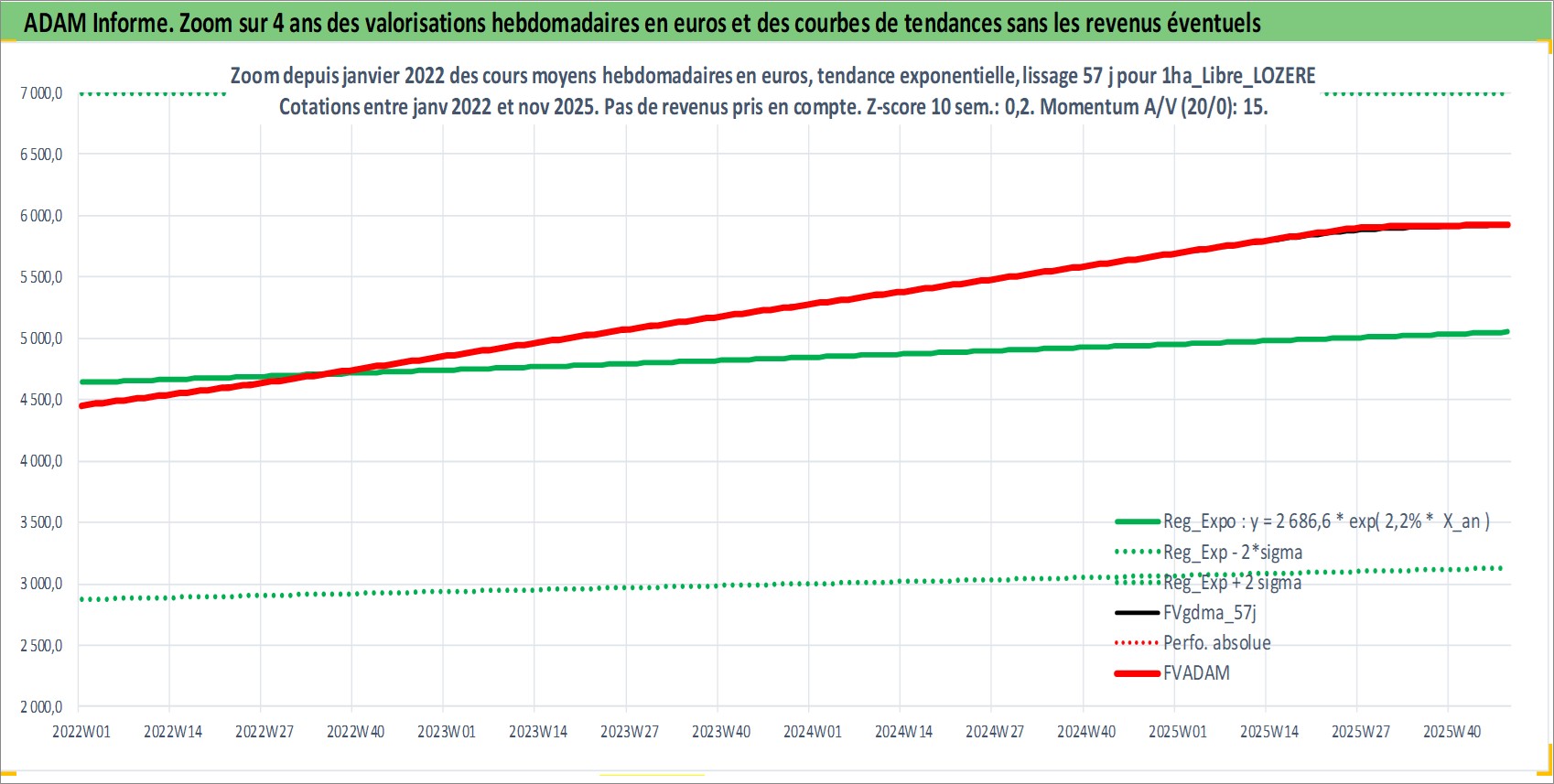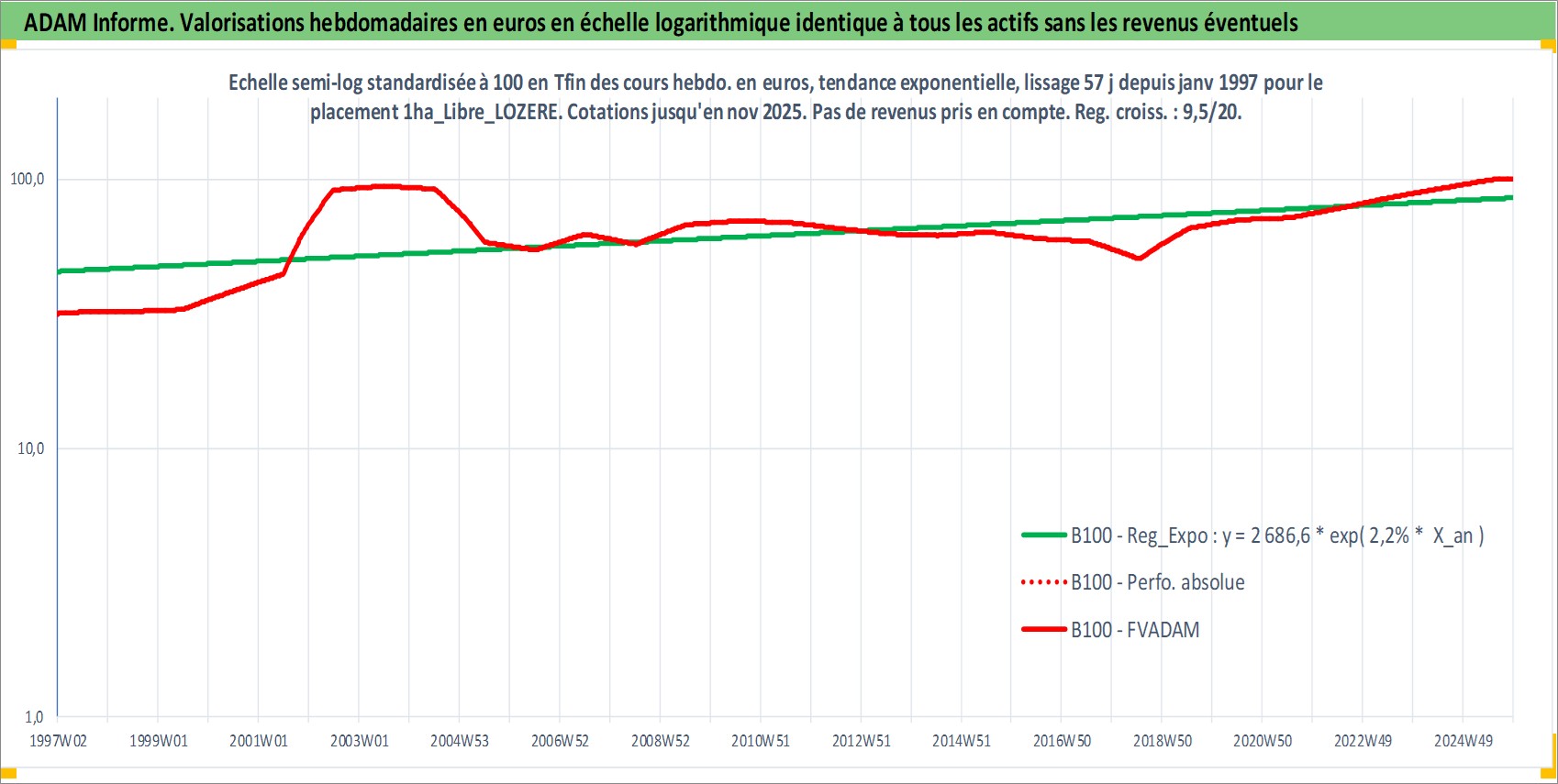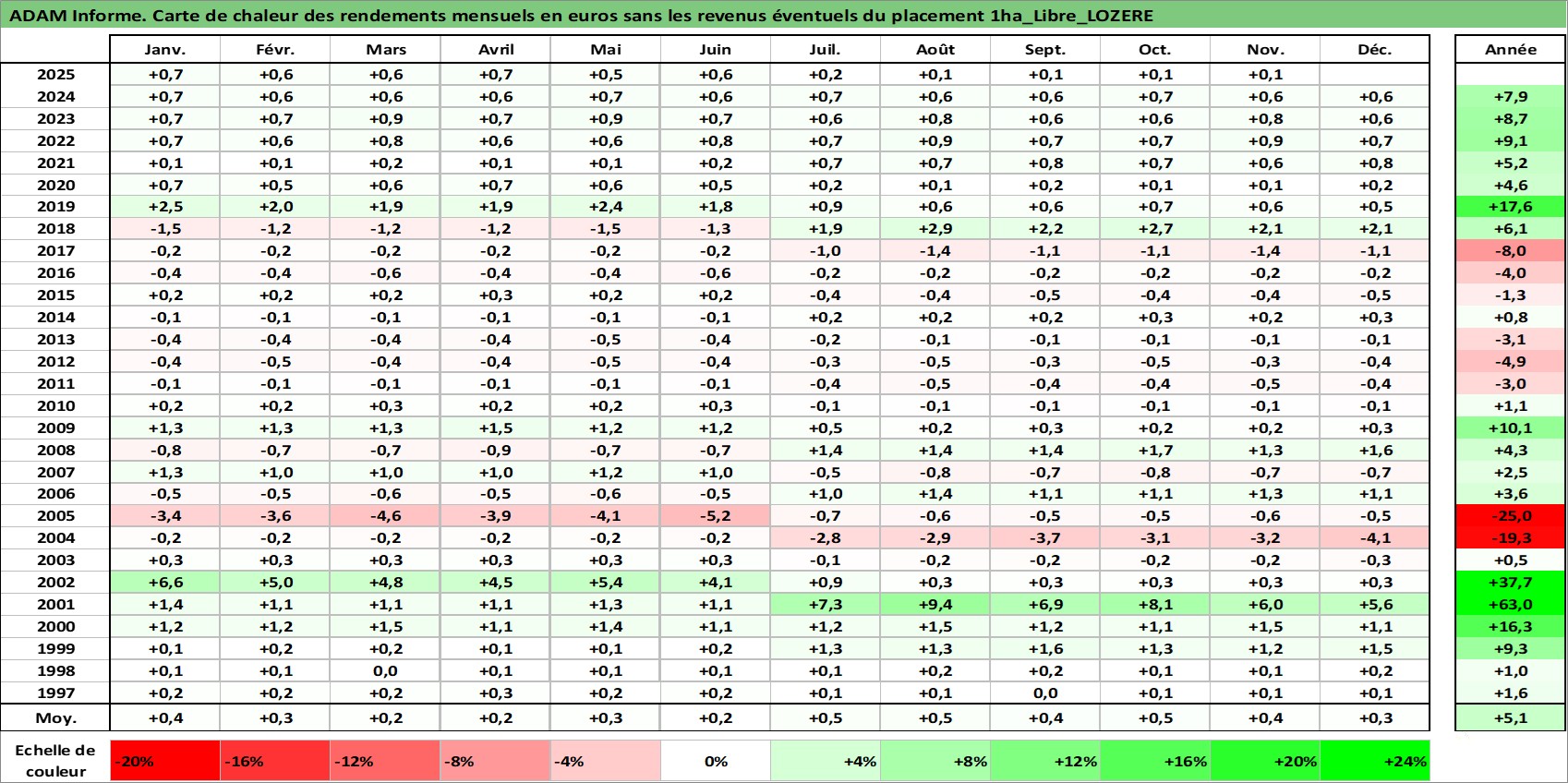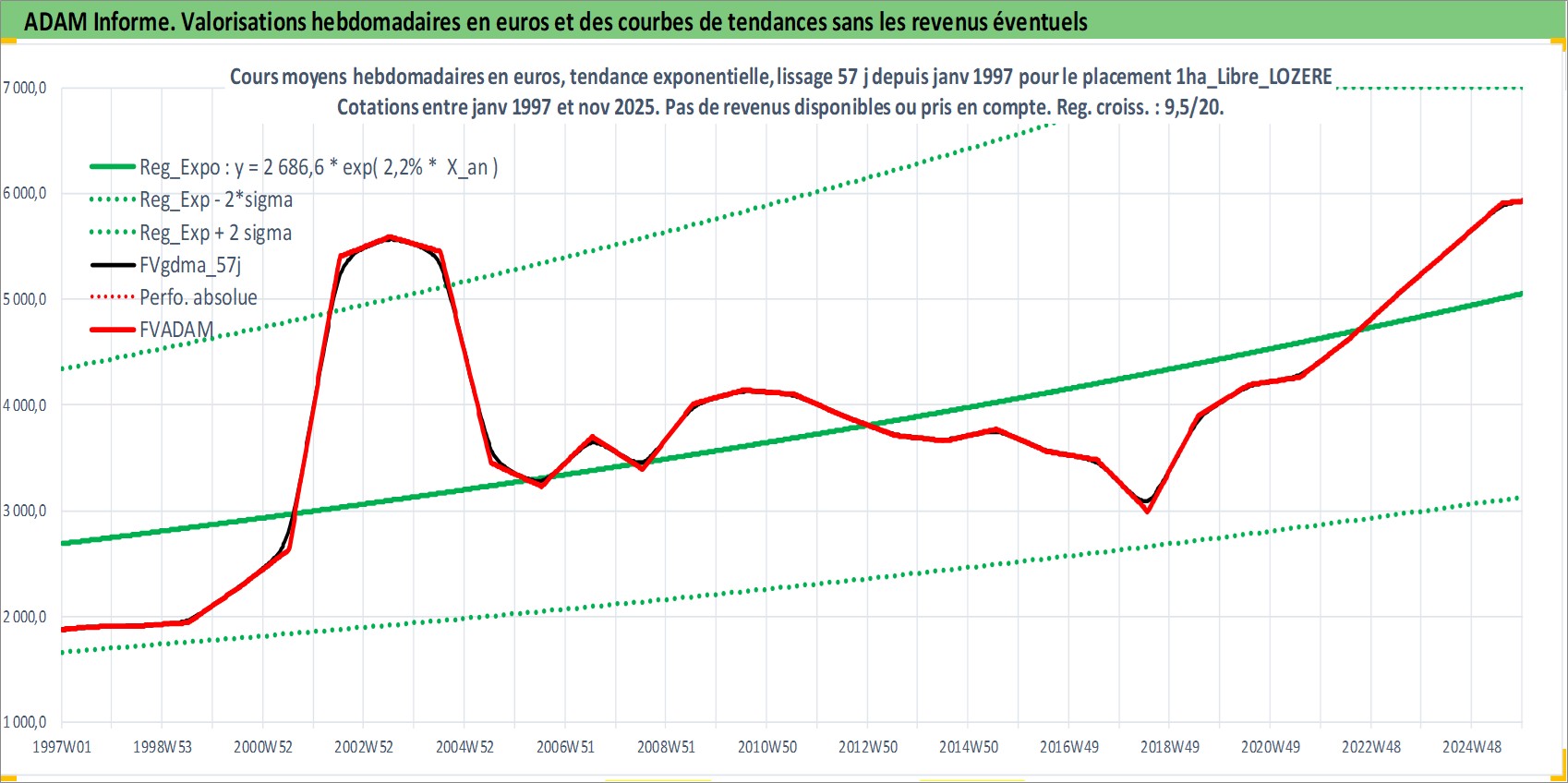 Site dédié aux investisseursPage dédiée sur site financeAnalyse des valorisations hebdomadaires de l'actif 1ha_Libre_LOZERE. Cet actif est cote en EUR. Les valorisations couvrent les semaines 1997W01 a 2025W48. Les fermages de ce bien foncier sont pris egaux a 2,5% annuels de la valeur venale du bien.